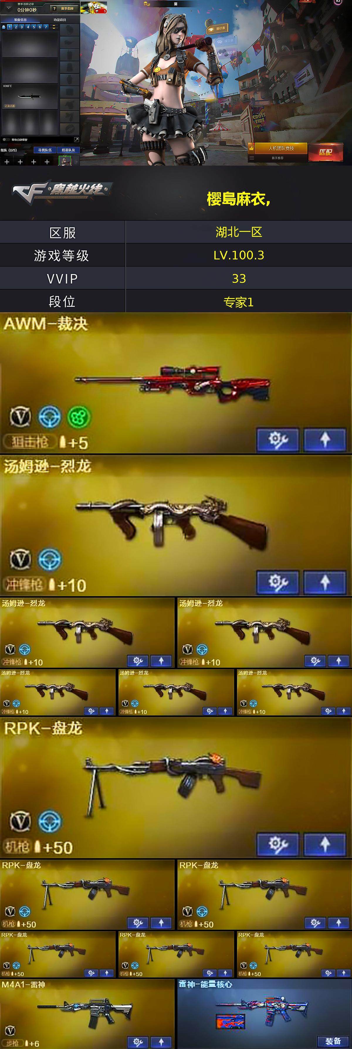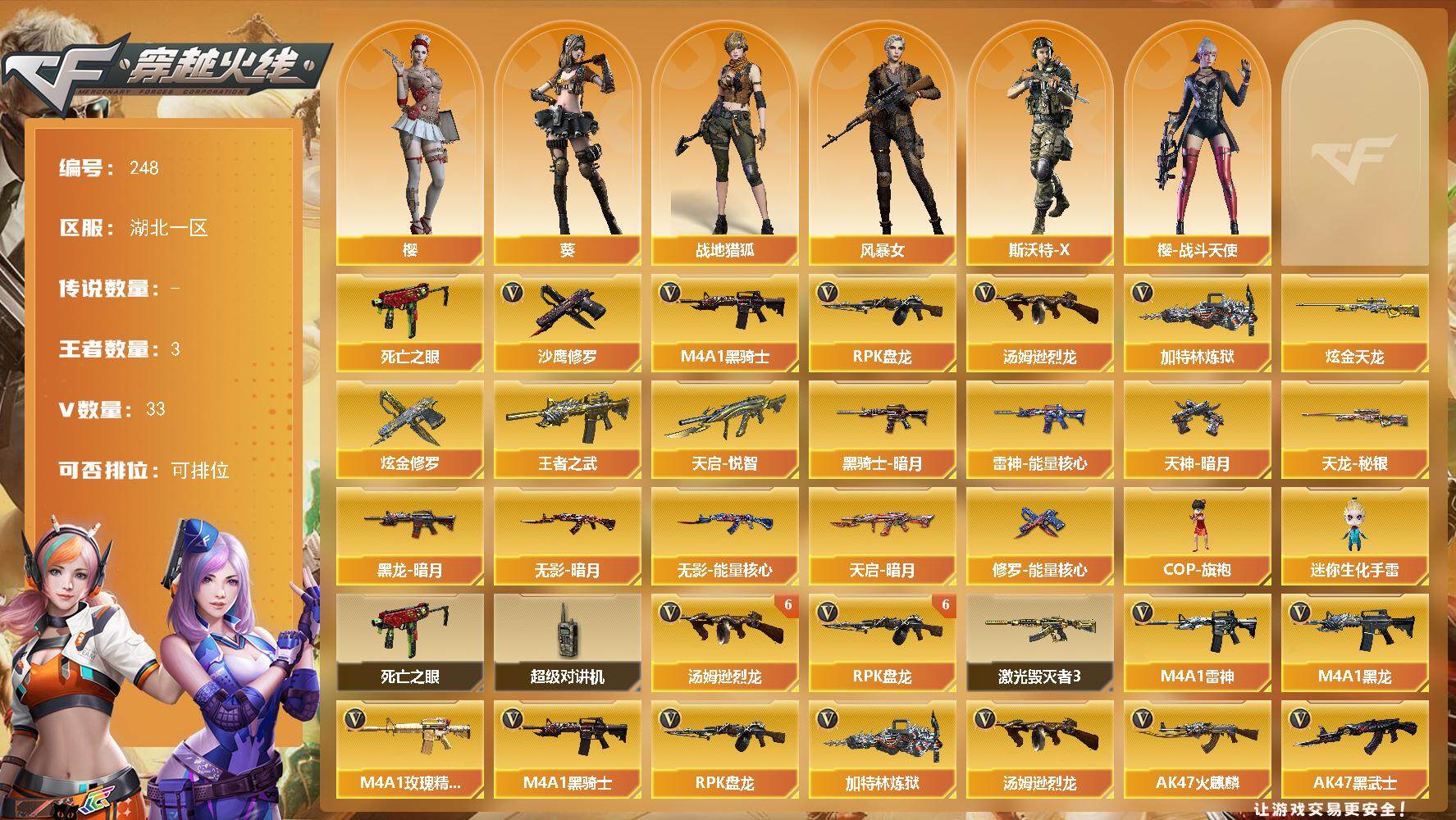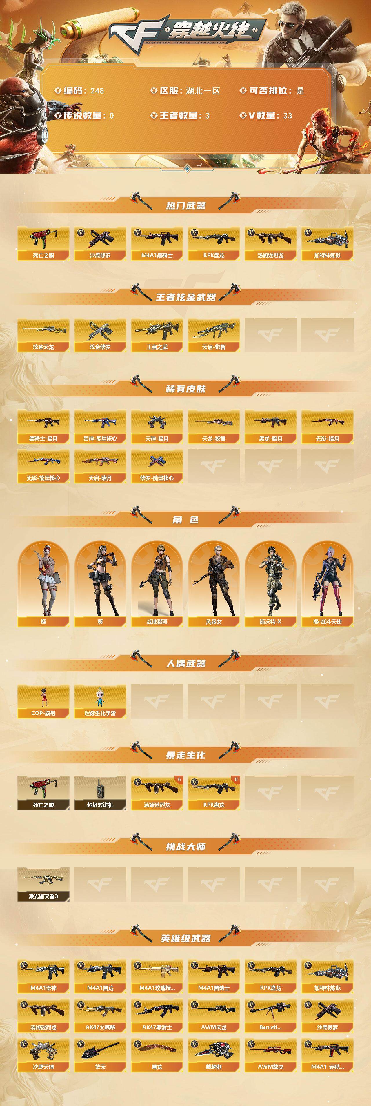 [14133441]湖北一区-33V-3王者-3炫金 【热门武器】:死亡之眼*2,M4A1-黑骑士,汤姆逊-烈龙*6,RPK-盘龙*6,加特林-炼狱,沙鹰-修罗 【王者炫金武器】:天启-悦智*2,王者之武,炫金天龙,炫金修罗*2 【皮肤】:雷神-能量核心,黑龙-暗月,黑骑士-暗月,无影-暗月,无影-能量核心,天启-暗月,天龙-秘银,修罗-能量核心,天神-暗月*2 【角色】:葵,樱,战地猎狐,风暴女,斯沃特-X,樱-战斗天使 【人偶武器】:COP-旗袍,迷你生化手雷 【暴走生化】:死亡之眼*2,超级对讲机 【挑战大师】:激光毁灭者III 【英雄级武器】:AK47-火麒麟,M4A1-黑龙,M4A1-雷神,M4A1-黑骑士,AK47-黑武士,M4A1-玫瑰精灵,AWM-天龙,Barrett-毁灭,AWM-裁决,RPK-盘龙*6,加特林-炼狱,汤姆逊-烈龙*6,沙鹰-修罗,沙鹰-天神,屠龙*3,擎天,麒麟刺,M4A1-赤狱骑士 【道具】:云山科技背包,炫彩背包,超级背包,黑桃战神背包,哔哩哔哩名片,女皇终结者-魔龙之吻,救世主-黑桃战神,黄金生化钩,绿色巨人,灵魂忍者,迷雾幽灵,夺命之镰,防化服*3,流光-再燃火线,枪王排位28赛季金色流光,防弹头盔*3,防弹衣*3,C4工具钳*3,手雷包*3 【特殊枪械】:1黑骑士,6烈龙,6盘龙,1炼狱