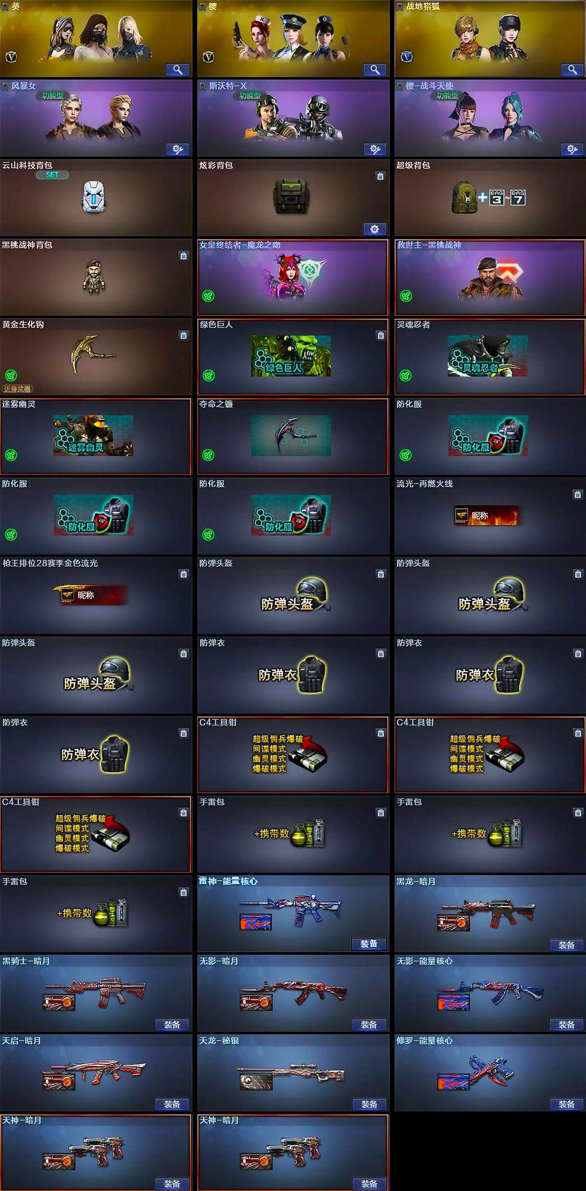 【道具】:云山科技背包,炫彩背包,超级背包,黑桃战神背包,哔哩哔哩名片,女皇终结者-魔龙之吻,救世主-黑桃战神,黄金生化钩,绿色巨人,灵魂忍者,迷雾幽灵,夺命之镰,防化服*3,流光-再燃火线,枪王排位28赛季金色流光,防弹头盔*3,防弹衣*3,C4工具钳*3,手雷包*3