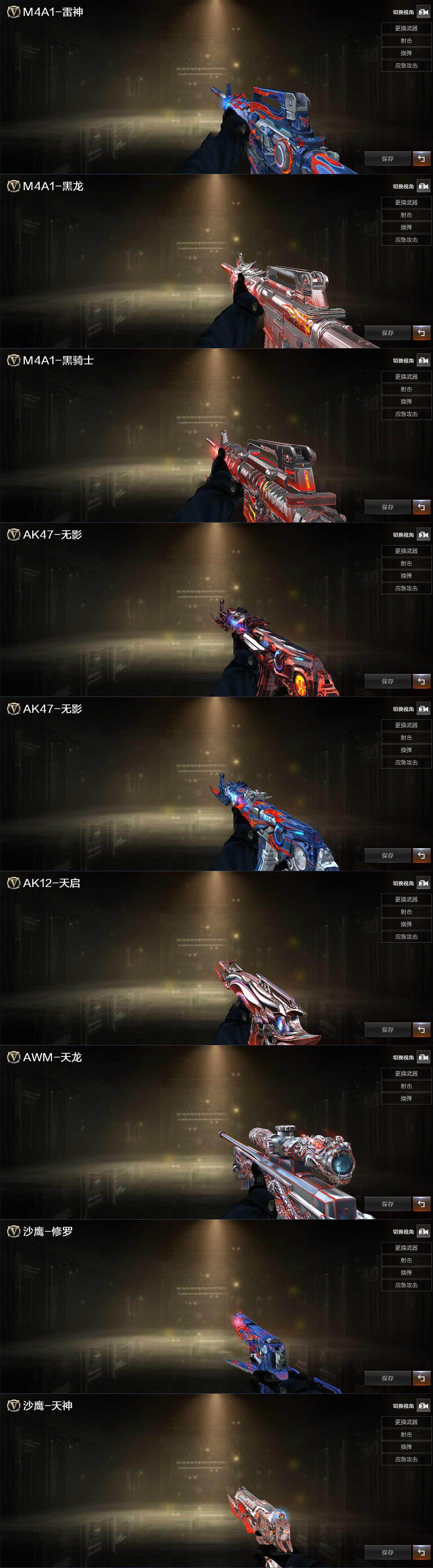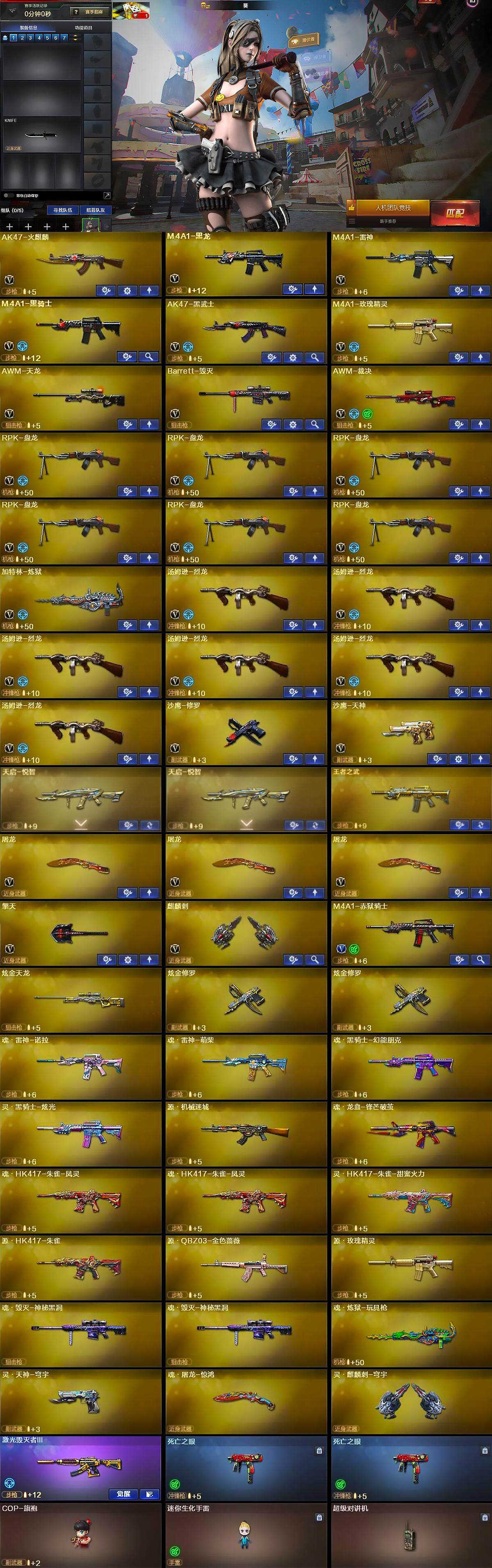 【英雄级武器】:AK47-火麒麟,M4A1-黑龙,M4A1-雷神,M4A1-黑骑士,AK47-黑武士,M4A1-玫瑰精灵,AWM-天龙,Barrett-毁灭,AWM-裁决,RPK-盘龙*6,加特林-炼狱,汤姆逊-烈龙*6,沙鹰-修罗,沙鹰-天神,屠龙*3,擎天,麒麟刺,M4A1-赤狱骑士