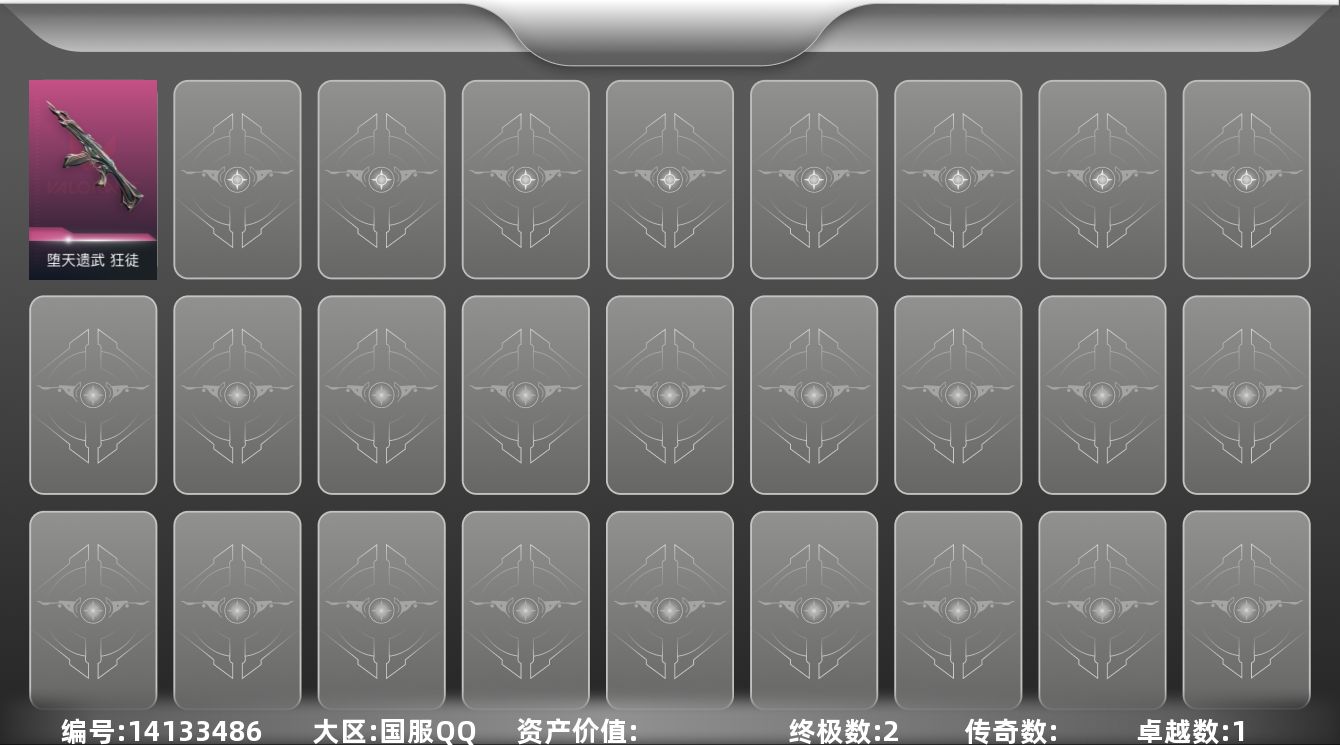 - [15243818]辽宁一区-38V-7王者-6炫金 【热门武器】:QBZ03-金色蔷薇,死亡之眼,M4A1-黑骑士,汤姆逊-烈龙,沙鹰-修罗*3 【王者炫金武器】:天启-悦智,王者风神,烈龙-悦心,王者之啸,炫金骑士,炫金武士*2,炫金天龙,炫金天神,炫金修罗 【音效卡】:Barrett-毁灭音效卡 【皮肤】:火麒麟-心动糖果,毁灭-风暴,黑龙-能量核心,修罗-能量核心 【角色】:魅影,王者-零,王者潘多拉,乔伊教练,修道士,初恋灵狐,芳心审判者,嘉年华灵狐,灵狐者-X,龙儿,麻雀,潘多拉-X,斯沃特-X,铁骑荣耀,影武者-X 【人偶武器】:AWM-灵狐-15周年嘉年华,COP-旗袍 【暴走生化】:死亡之眼 【挑战大师】:冰龙粉碎者-白马银枪,激光毁灭者III-白马银枪,激光毁灭者III 【英雄级武器】:M4A1-千变,AK47-火麒麟*2,M4A1-黑龙,M4A1-雷神,M4A1-黑骑士,AK47-无影,M4A1-死神,AK47-黑武士,M4A1-武圣,AK47-机械迷城,无影-神兵利器,QBZ03-金色蔷薇,M4A1-猎神,王者之影-觉醒版,AK-47-猩红传说,Barrett-毁灭*2,Barrett-极光,AWM-裁决*2,汤姆逊-烈龙,沙鹰-修罗*3,沙鹰-天神,Glock18-武圣,天神-动感闪耀,屠龙*5,擎天,麒麟刺,手雷-动感闪耀,闪光弹-幻灵 【道具】:云山科技背包,炫彩背包,虎牙炫彩背包,超级背包,夺命之镰,防化服,金色流光-枪王排位*2,星辰流光-枪王排位,EP战队名片,防弹头盔,防弹衣,C4工具钳,手雷包 【特殊枪械】:1黑骑士,1烈龙