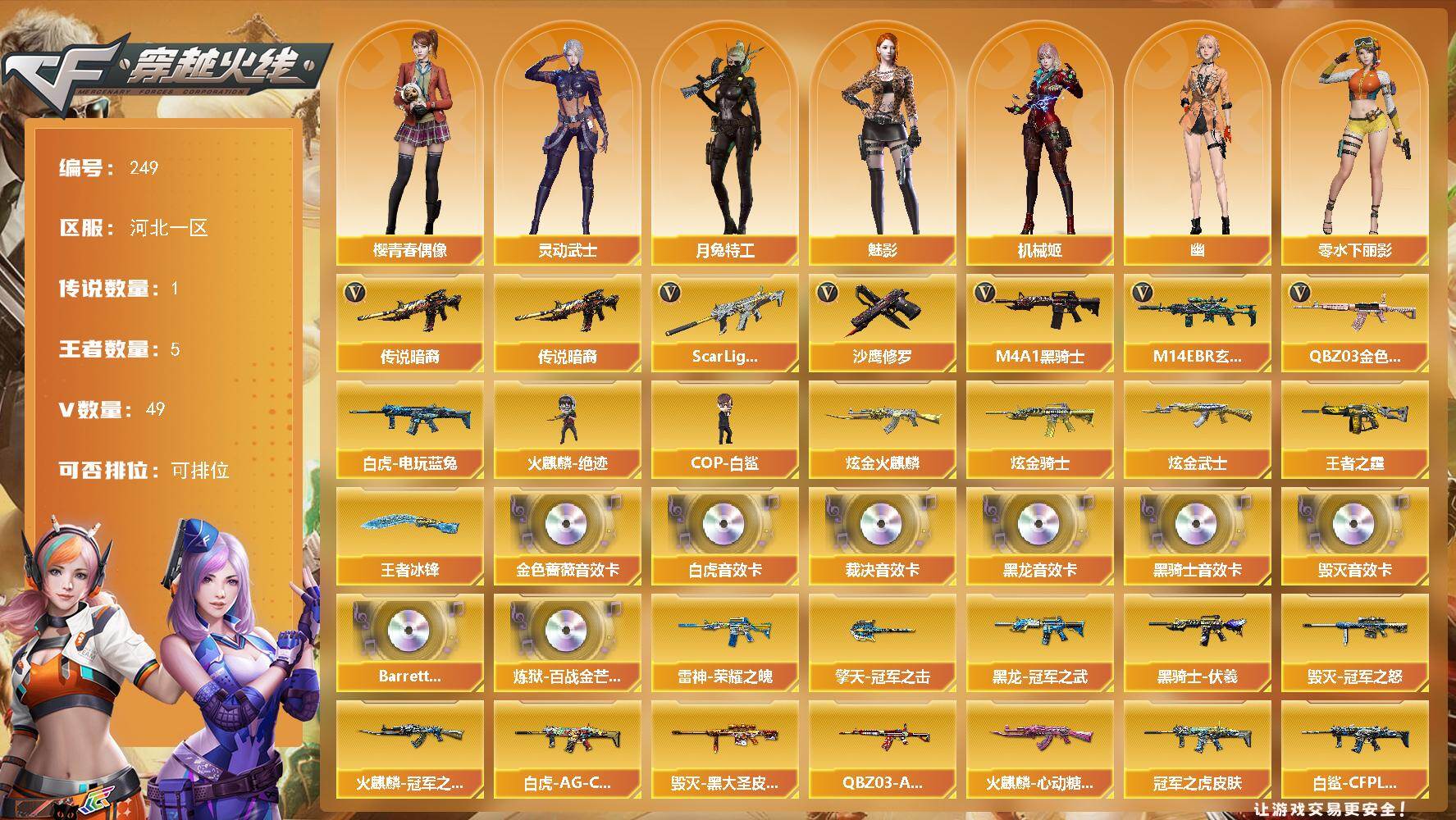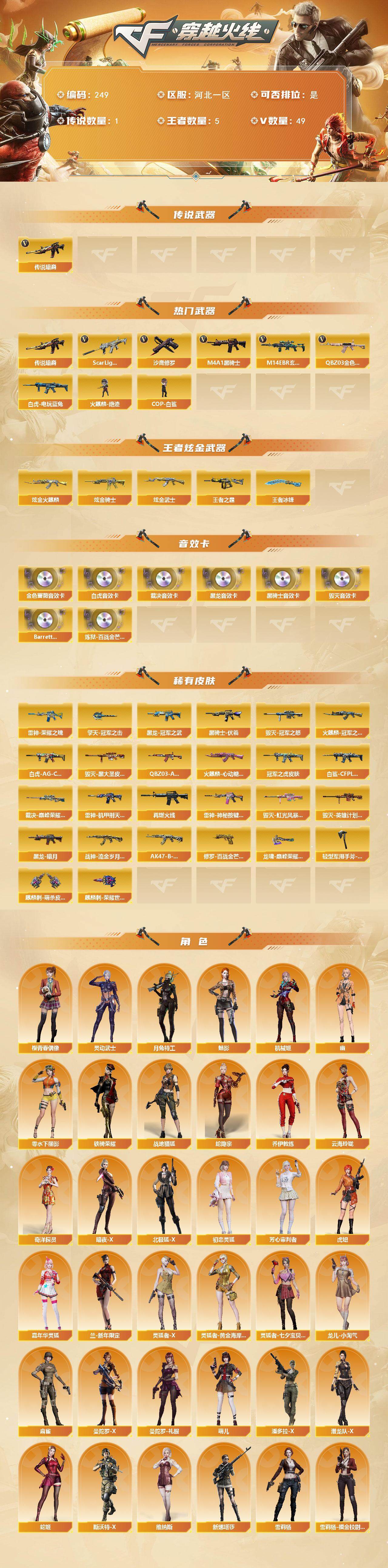 [14133637]河北一区-49V-5王者-3炫金 【传说武器】:传说暗裔 【热门武器】:传说暗裔,QBZ03-金色蔷薇,M14EBR-玄武,Scar Light-白虎,白虎-电玩蓝兔*2,M4A1-黑骑士*3,火麒麟-绝迹*2,COP-白鲨*2,沙鹰-修罗*2 【王者炫金武器】:王者之霆,王者冰锋*2,炫金火麒麟,炫金骑士,炫金武士 【音效卡】:M4A1-黑龙音效卡,M4A1-黑骑士音效卡,Barrett-毁灭音效卡,QBZ03-金色蔷薇音效卡,AWM-裁决音效卡,Scar Light-白虎音效卡,Barrett-碧霄极光音效卡,炼狱-百战金芒-庆典舞曲音效卡 【皮肤】:白虎-AG-CFPLS20冠军,ScarLight-白虎-冠军之虎皮肤,白虎-白鲨-CFPLS23冠军,QBZ03-AG-CFPLS19冠军,裁决-巅峰荣耀 皮肤,雷神-荣耀之魄,雷神-机甲刑天皮肤,M4A1-再燃火线,雷神-神秘按键 皮肤,火麒麟-冠军之心,火麒麟-心动糖果,毁灭-冠军之怒,毁灭-黑大圣皮肤,毁灭-虹光风暴 皮肤,毁灭-英雄计划 皮肤,黑龙-暗月,黑龙-冠军之武,黑骑士-伏羲,战神-流金岁月皮肤*2,AK47-B-常胜将军-刘备,修罗-百战金芒 皮肤,龙啸-巅峰荣耀 皮肤,轻型军用手斧-再燃火线,擎天-冠军之击*2,麒麟刺-萌杀皮肤,麒麟刺-荣耀世冠白鲨 【角色】:魅影,月兔特工,机械姬,战地猎狐,蛇隐宗,奇洋探员,乔伊教练,云海玲珑,暗夜-X,北极狐-X,初恋灵狐,芳心审判者,虎妞,嘉年华灵狐,兰-新年限定,0号玩家,灵动武士,零-水下丽影,灵狐者-X,灵狐者-黄金海岸,灵狐者-七夕宝贝,龙儿-小淘气,麻雀,曼陀罗-X,曼陀罗-礼服,萌儿,潘多拉-X,潜龙队-X,蛇姬,斯沃特-X,铁骑荣耀,兔囡囡,维纳斯,新娜塔莎,雪莉杨,雪莉杨-摸金校尉,樱-青春偶像,影武者-X,幽 【人偶武器】:火麒麟-绝迹*2,COP-白鲨*2,天龙-曼陀罗,AWM-灵狐-15周年嘉年华*2,黄金迷你深渊冰龙,迷你深渊冰龙,迷你裂空之翼*2,黄金迷你裂空之翼,迷你波特博士*3,迷你曼提柯尔,夺魂,迷你火种,生化手雷-机甲核心*2,深渊终结者手雷,迷你超能女侍 【暴走生化】:超级对讲机 【挑战大师】:神圣爆裂者III,冰龙粉碎者-白马银枪,激光毁灭者III-白马银枪*2,VEPR-12-金魔,机甲撕裂者III,试炼破坏者