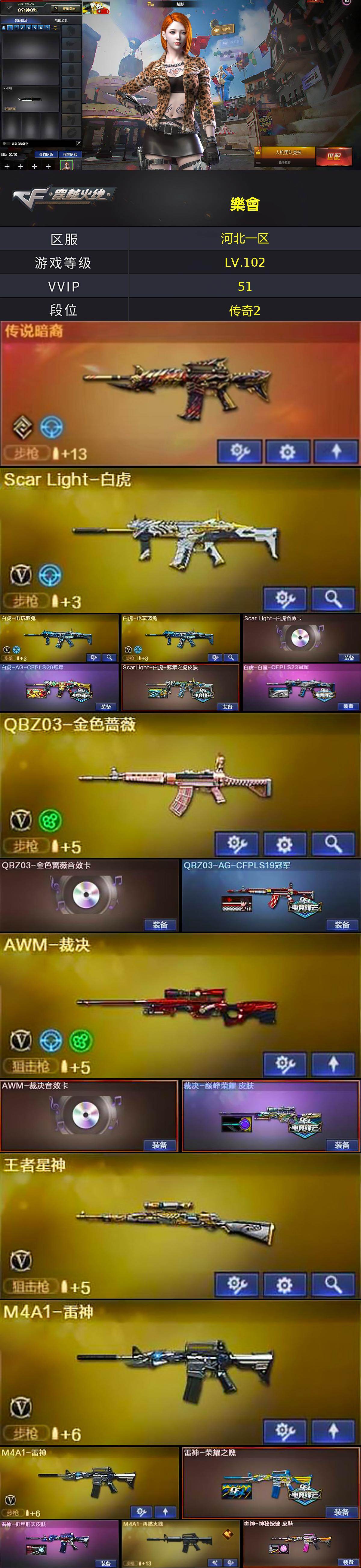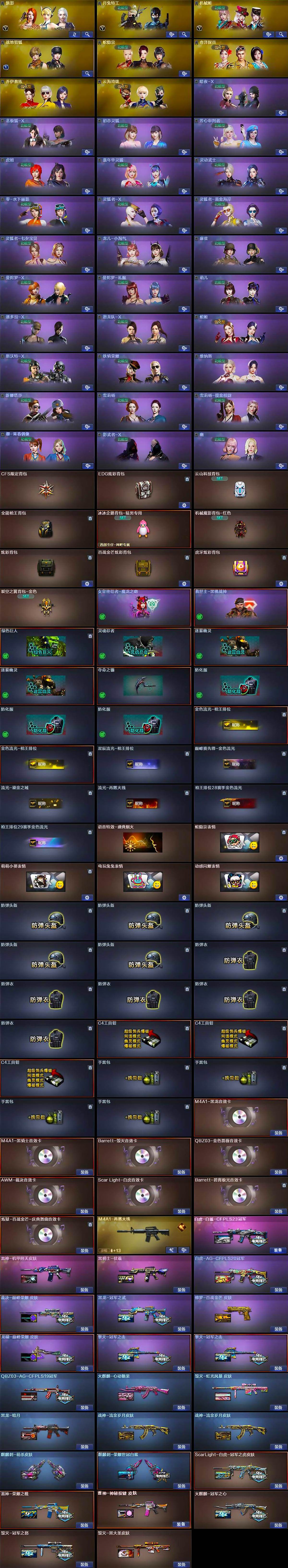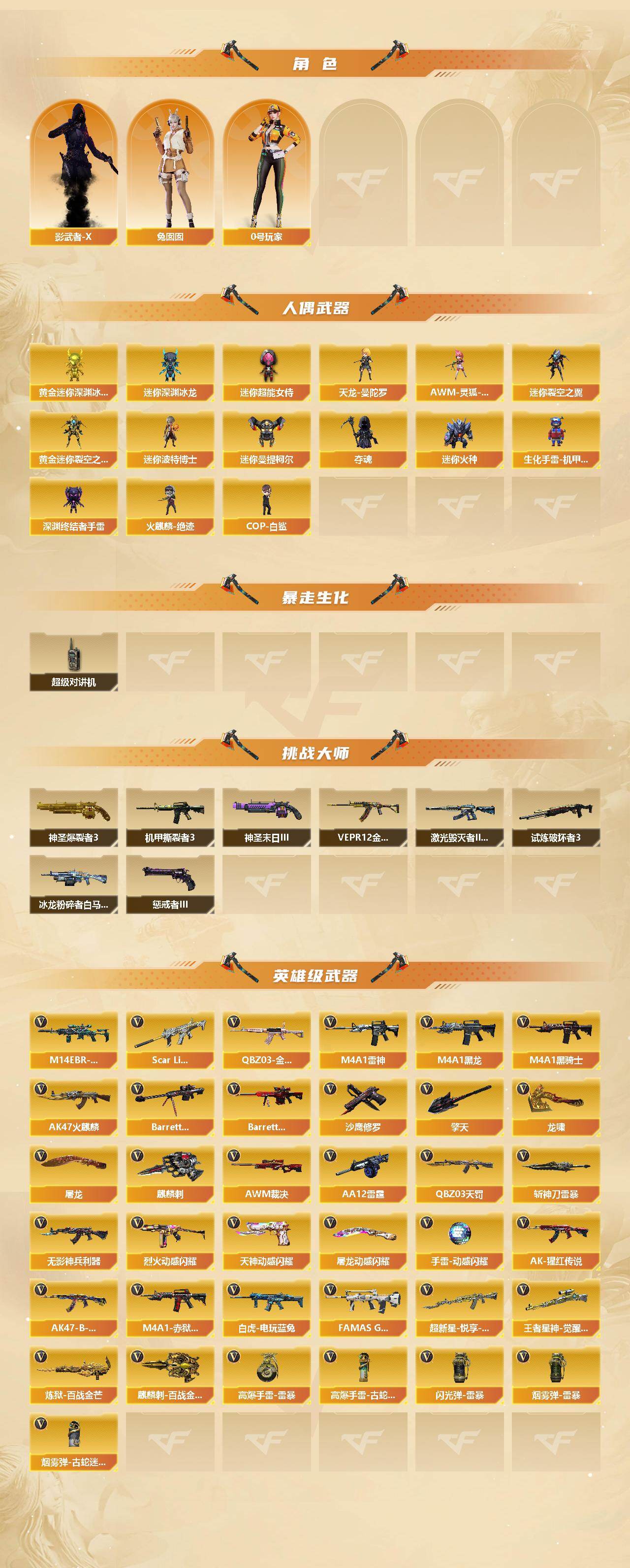 【皮肤】:白虎-AG-CFPLS20冠军,ScarLight-白虎-冠军之虎皮肤,白虎-白鲨-CFPLS23冠军,QBZ03-AG-CFPLS19冠军,裁决-巅峰荣耀 皮肤,雷神-荣耀之魄,雷神-机甲刑天皮肤,M4A1-再燃火线,雷神-神秘按键 皮肤,火麒麟-冠军之心,火麒麟-心动糖果,毁灭-冠军之怒,毁灭-黑大圣皮肤,毁灭-虹光风暴 皮肤,毁灭-英雄计划 皮肤,黑龙-暗月,黑龙-冠军之武,黑骑士-伏羲,战神-流金岁月皮肤*2,AK47-B-常胜将军-刘备,修罗-百战金芒 皮肤,龙啸-巅峰荣耀 皮肤,轻型军用手斧-再燃火线,擎天-冠军之击*2,麒麟刺-萌杀皮肤,麒麟刺-荣耀世冠白鲨