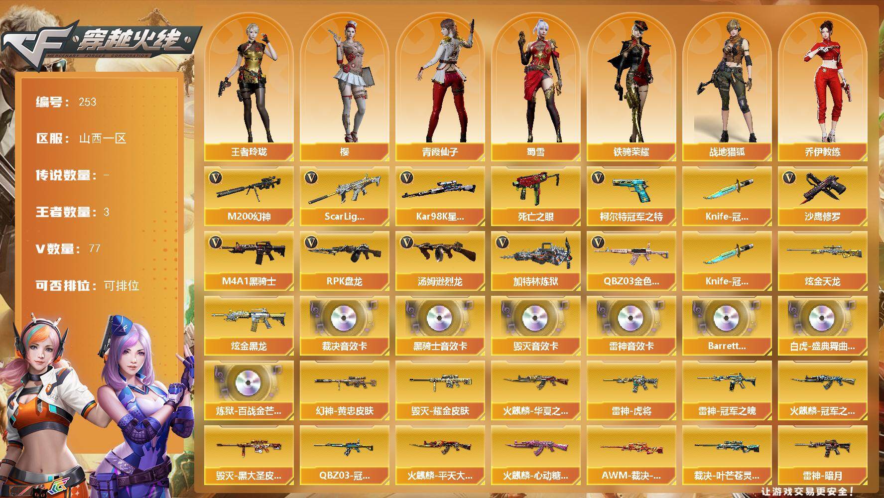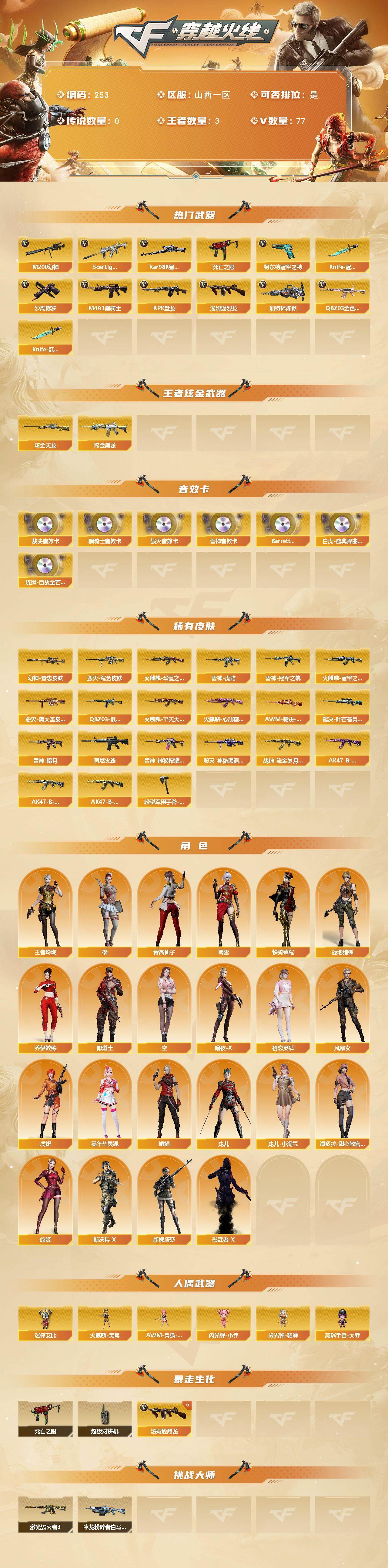 [14134510]山西一区-77V-3王者-2炫金 【热门武器】:QBZ03-金色蔷薇,Scar Light-白虎,M200-幻神,死亡之眼,柯尔特-冠军之特,Kar98K-星神,M4A1-黑骑士,汤姆逊-烈龙*6,RPK-盘龙,加特林-炼狱*2,沙鹰-修罗*3,Knife-冠军之刃*2 【王者炫金武器】:炫金黑龙,炫金天龙 【音效卡】:M4A1-雷神音效卡,M4A1-黑骑士音效卡,Barrett-毁灭音效卡,AWM-裁决音效卡,Barrett-碧霄极光音效卡,白虎-盛典舞曲音效卡,炼狱-百战金芒-庆典舞曲音效卡 【皮肤】:M200-幻神-黄忠皮肤,QBZ03-冠军之薇,AWM-裁决-凤灵皮肤,裁决-叶芒苍灵 皮肤,雷神-暗月,雷神-虎将,雷神-冠军之魄,M4A1-再燃火线,雷神-神秘按键 皮肤,火麒麟-冠军之心,火麒麟-华夏之心,火麒麟-平天大圣,火麒麟-心动糖果,毁灭耀金皮肤,毁灭-黑大圣皮肤,毁灭-神秘黑洞皮肤,战神-流金岁月皮肤,AK47-B-常胜将军-曹操,AK47-B-常胜将军-刘备*2,AK47-B-常胜将军-孙权*2,轻型军用手斧-再燃火线 【角色】:樱,战地猎狐,王者玲珑,乔伊教练,修道士,空,暗夜-X,初恋灵狐,风暴女,虎妞,嘉年华灵狐,娟娟,龙儿,龙儿-小淘气,潘多拉-甜心教官,青霞仙子,蛇姬,斯沃特-X,蜀雪,铁骑荣耀,新娜塔莎,影武者-X 【人偶武器】:火麒麟-灵狐,AWM-灵狐-15周年嘉年华,闪光弹-小乔,闪光弹-貂蝉,高爆手雷-大乔,迷你艾比 【暴走生化】:死亡之眼,超级对讲机 【挑战大师】:冰龙粉碎者-白马银枪,激光毁灭者III 【英雄级武器】:AK47-火麒麟*2,M4A1-雷神,M4A1-黑骑士,M4A1-死神,AK47-黑鲨,M4A1-龙血*3,Scar Light-白虎,无影-神兵利器,QBZ03-金色蔷薇,M4A1-猎神,王者之魄-觉醒版,AK47-B-战神,AK47-B-常胜将军,Barrett-毁灭,Barrett-极光,AWM-裁决,M200-幻神,Barrett-朱雀,Kar98K-星神,Barrett-金色蔷薇,王者幻神-觉醒版,RPK-盘龙,加特林-炼狱*2,炼狱-百战金芒,汤姆逊-烈龙*6,AA-12-雷霆,沙鹰-修罗*3,沙鹰-天神*2,柯尔特-冠军之特,USP-神工天巧,屠龙*3,擎天,唐刀-神工天巧,麒麟刺-百战金芒,