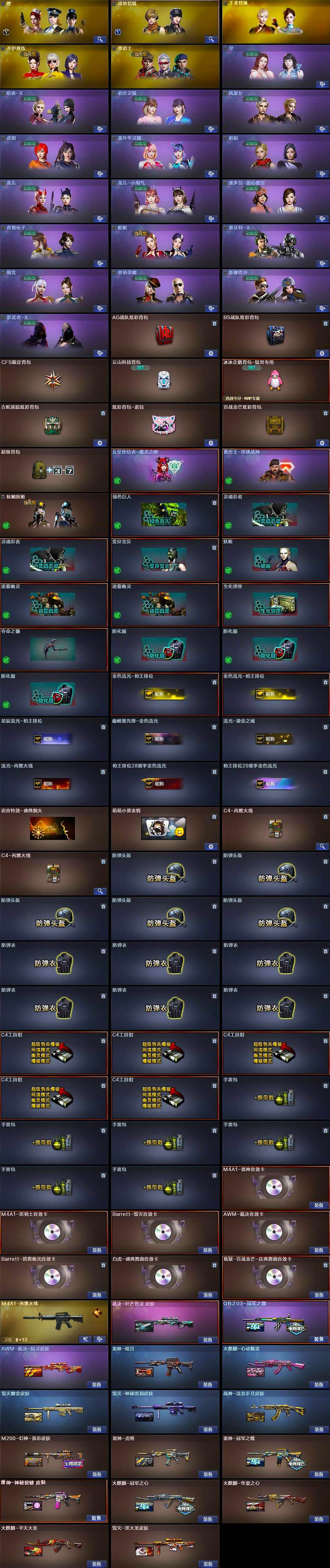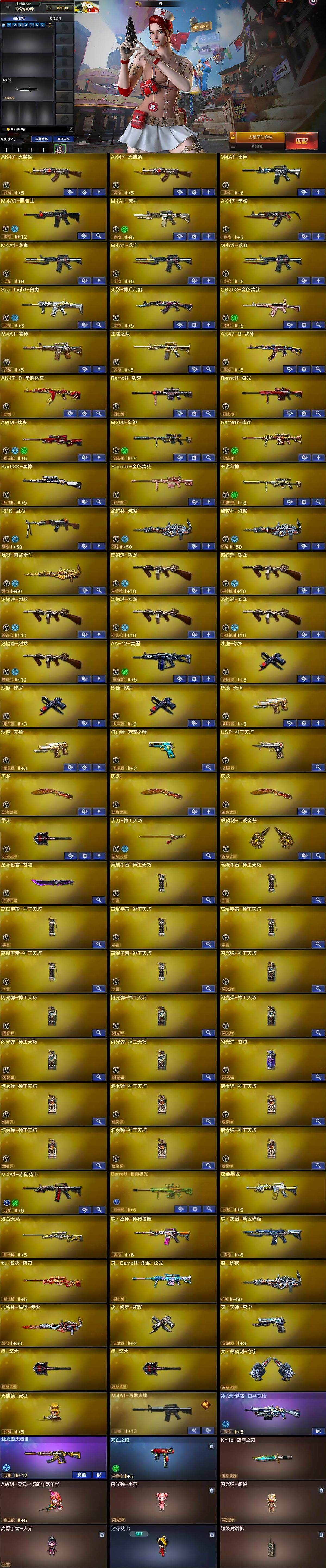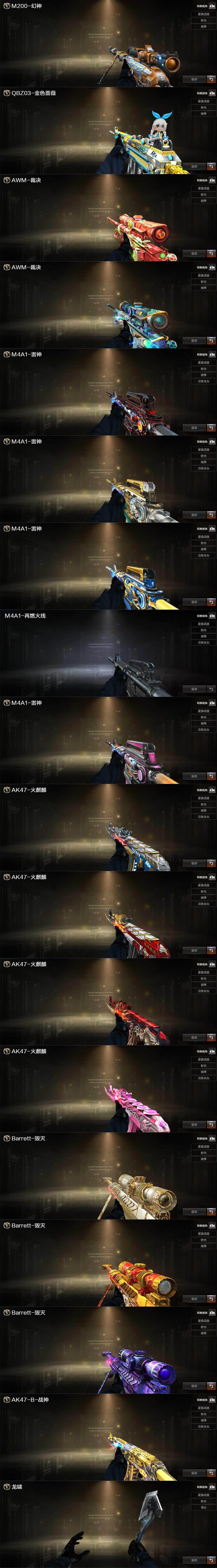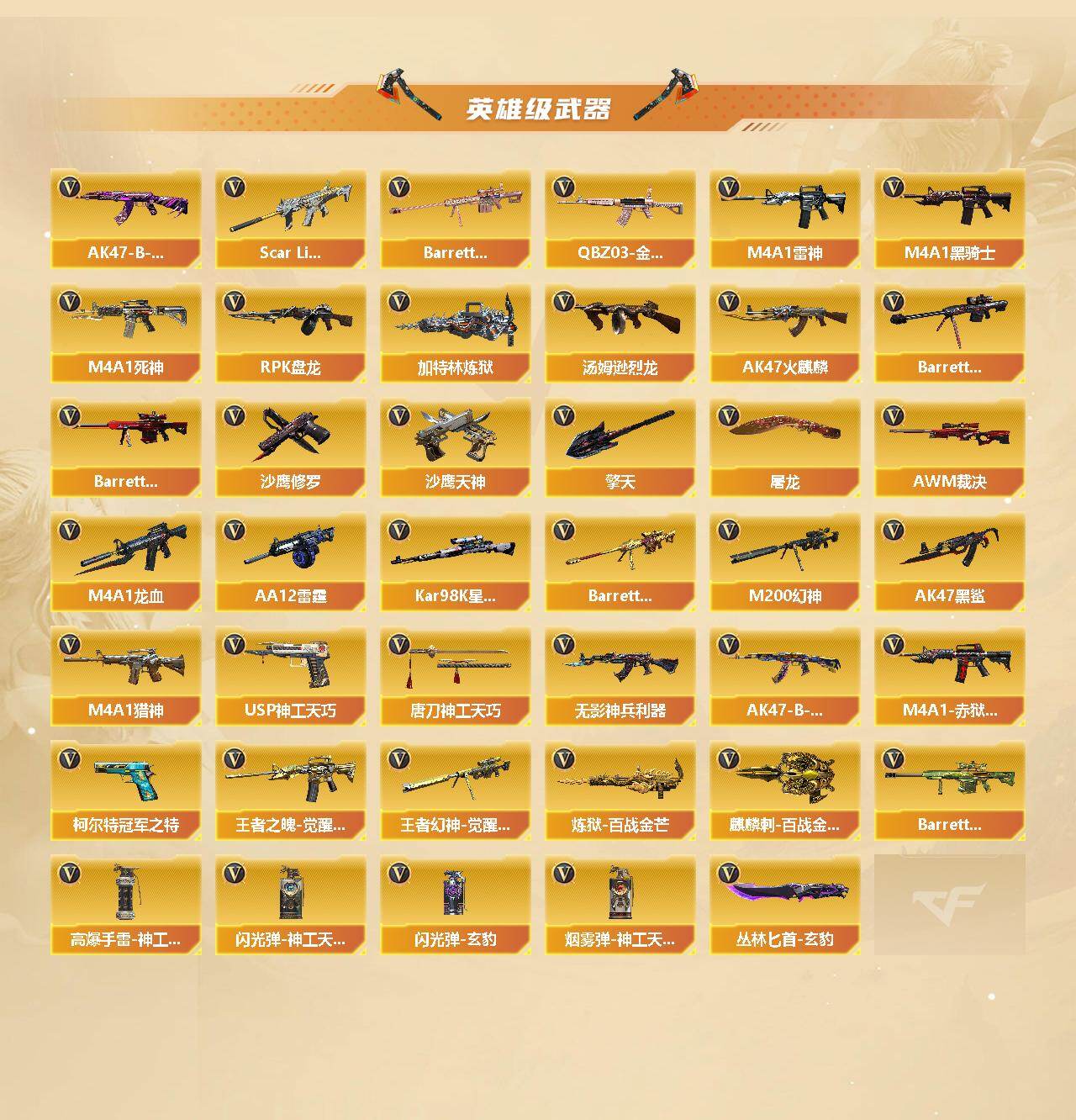 【英雄级武器】:AK47-火麒麟*2,M4A1-雷神,M4A1-黑骑士,M4A1-死神,AK47-黑鲨,M4A1-龙血*3,Scar Light-白虎,无影-神兵利器,QBZ03-金色蔷薇,M4A1-猎神,王者之魄-觉醒版,AK47-B-战神,AK47-B-常胜将军,Barrett-毁灭,Barrett-极光,AWM-裁决,M200-幻神,Barrett-朱雀,Kar98K-星神,Barrett-金色蔷薇,王者幻神-觉醒版,RPK-盘龙,加特林-炼狱*2,炼狱-百战金芒,汤姆逊-烈龙*6,AA-12-雷霆,沙鹰-修罗*3,沙鹰-天神*2,柯尔特-冠军之特,USP-神工天巧,屠龙*3,擎天,唐刀-神工天巧,麒麟刺-百战金芒,