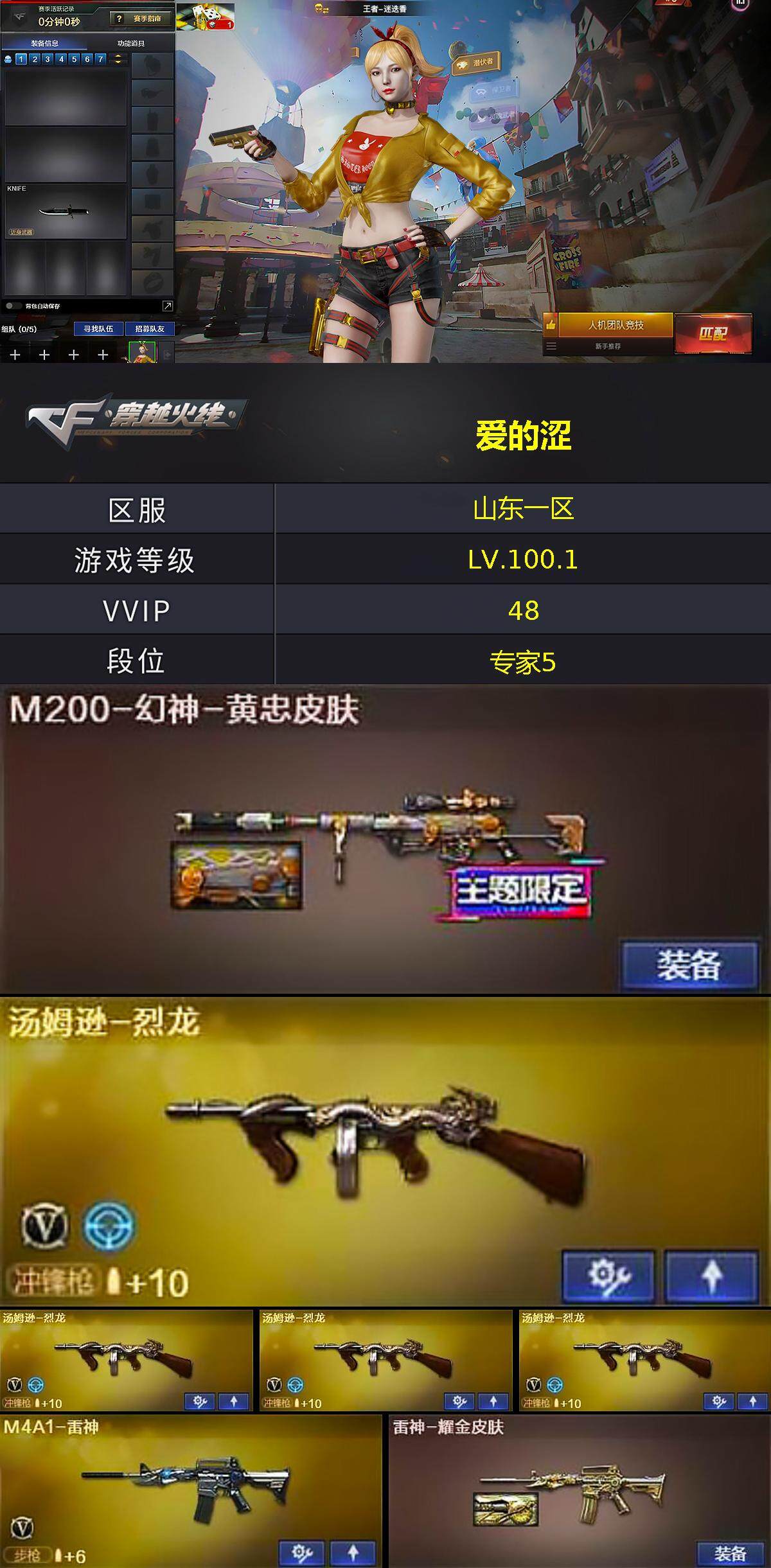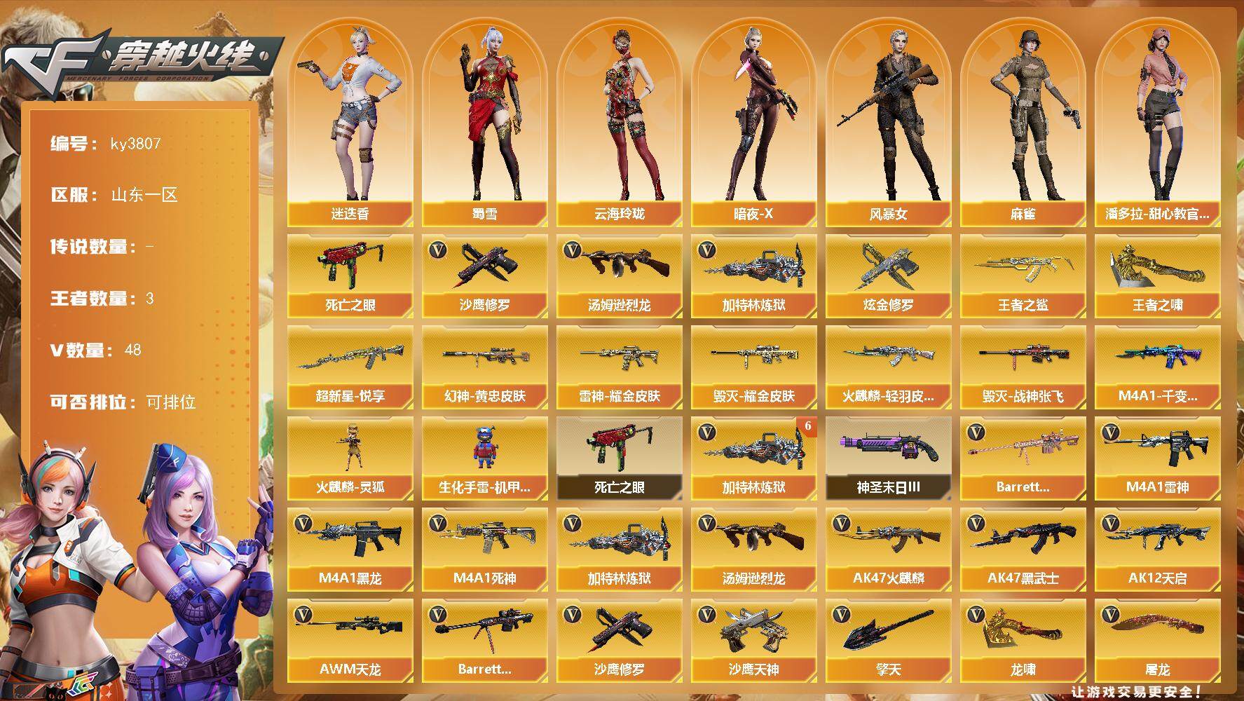 [14135326]山东一区-48V-3王者-1炫金 【热门武器】:死亡之眼,汤姆逊-烈龙*4,加特林-炼狱*7,沙鹰-修罗 【王者炫金武器】:王者之鲨,超新星-悦享,王者之啸,炫金修罗 【皮肤】:M200-幻神-黄忠皮肤,雷神-耀金皮肤,火麒麟-轻羽皮肤,毁灭耀金皮肤,毁灭-战神张飞,M4A1-千变-孔明皮肤 【角色】:迷迭香,云海玲珑,暗夜-X,风暴女,麻雀,潘多拉-甜心教官,蜀雪,新娜塔莎 【人偶武器】:火麒麟-灵狐,生化手雷-机甲核心*2 【暴走生化】:死亡之眼 【挑战大师】:神圣爆裂者-末日III 【英雄级武器】:AK47-火麒麟*3,M4A1-黑龙,M4A1-雷神,M4A1-死神,AK47-黑武士,AK12-天启,AK47-黑鲨,M4A1-龙血*3,黑武士-锦绣游龙,M4A1-猎神*2,黑骑士-海王,AWM-天龙,Barrett-毁灭*2,Barrett-金色蔷薇,加特林-炼狱*7,汤姆逊-烈龙*4,沙鹰-修罗,沙鹰-天神,屠龙*2,龙啸*8,擎天*3,麒麟刺 【道具】:亚洲杯纪念炫彩背包,战舰背包,女皇终结者-魔龙之吻,绿色巨人,灵魂忍者,变异宝贝,迷雾幽灵,夺命之镰,防化服*3,金色流光-枪王排位,枪王排位28赛季金色流光,枪王排位29赛季金色流光,防弹头盔*5,防弹衣*5,C4工具钳*6,手雷包*6 【特殊枪械】:4烈龙,6炼狱