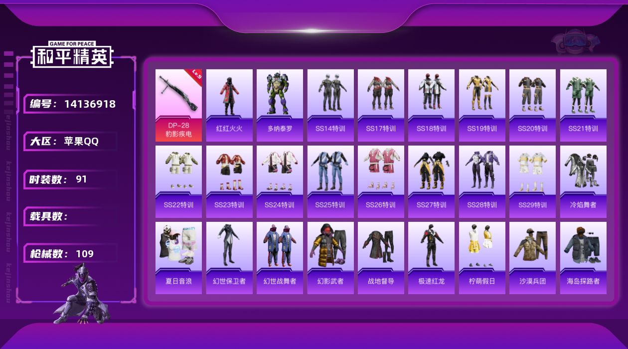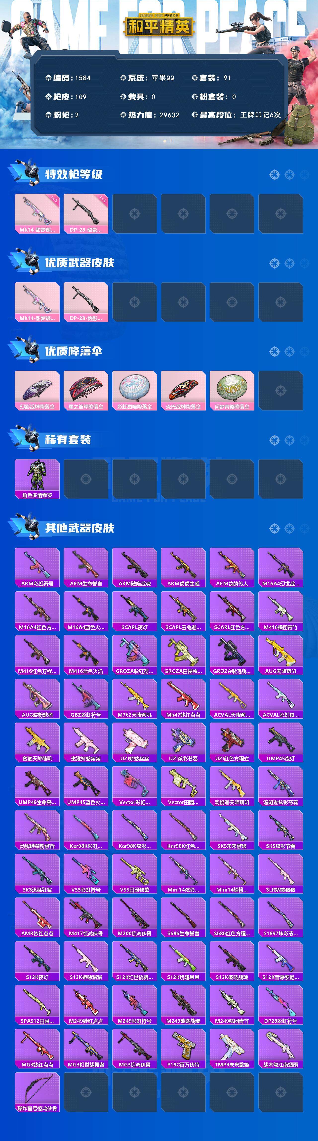 [14136918]苹果 手Q-0粉装-2特效枪-0载具-0粉色飞行器-29632热力值-6王牌印记-91套装-109枪皮 【热门品类】:套装-奇异狩猎者,套装-红红火火 【粉色枪皮等级】:Mk14-甜梦熊击(五级),DP-28-豹影疾电(五级) 【粉色枪皮】:Mk14-甜梦熊击,DP-28-豹影疾电 【粉色降落伞】:幻影战神降落伞,星之彼岸降落伞,彩虹甜喵降落伞,炎氏战神降落伞,闲梦青缨降落伞 【稀有套装】:角色-多纳泰罗 【稀有枪皮】:AKM-彩虹符号,AKM-生命誓言,AKM-破晓战魂,AKM-虎虎生威,AKM-龙的传人,M16A4-幻世战舞者,M16A4-红色方程式,M16A4-蓝色火焰,SCAR-L-夜灯,SCAR-L-玉兔迎春,SCAR-L-红色方程式,M416-糯团青竹,M416-红色方程式,M416-蓝色火焰,GROZA-彩虹符号,GROZA-田园牧歌,GROZA-银河战甲,AUG-天降萌叽,AUG-耀粉歌者,QBZ-彩虹符号,M762-天降萌叽,Mk47-妙红点点,AC-VAL-天降萌叽,AC-VAL-彩虹甜喵,蜜獾-天降萌叽,蜜獾-娇憨猪猪,UZI-娇憨猪猪,UZI-炫彩节奏,UZI-红色方程式,UMP45-夜灯,UMP45-生命誓言,UMP45-蓝色火焰,Vector-彩虹符号,Vector-田园牧歌,汤姆逊-天降萌叽,汤姆逊-炫彩节奏,汤姆逊-耀粉歌者,Kar98K-彩虹符号,Kar98K-炫彩节奏,Kar98K-红色方程式,SKS-未来歌姬,SKS-炫彩节奏,SKS-迅猛狂鲨,VSS-彩虹符号,VSS-田园牧歌,Mini14-炫彩节奏,Mini14-耀粉歌者,SLR-娇憨猪猪,AMR-妙红点点,M417-惊鸿侠骨,M200-惊鸿侠骨,S686-生命誓言,S686-红色方程式,S1897-炫彩节奏,S12K-玩趣呆呆,S12K-破晓战魂,S12K-音爆索尼克,S12K-夜灯,S12K-娇憨猪猪,S12K-幻世战舞者,SPAS-12-田园牧歌,M249-妙红点点,M249-彩虹符号,M249-破晓战魂,M249-糯团青竹,DP-28-彩虹符号,MG3-妙红点点,MG3-幻世战舞者,MG3-惊鸿侠骨,P18C-百万伏特,TMP-9-未来歌姬,战术弩-江南烟雨,爆炸猎弓-惊鸿侠骨 【其他套装】:套装-SS14特训,套装-SS17特训,套装-SS18特训,套装-SS1