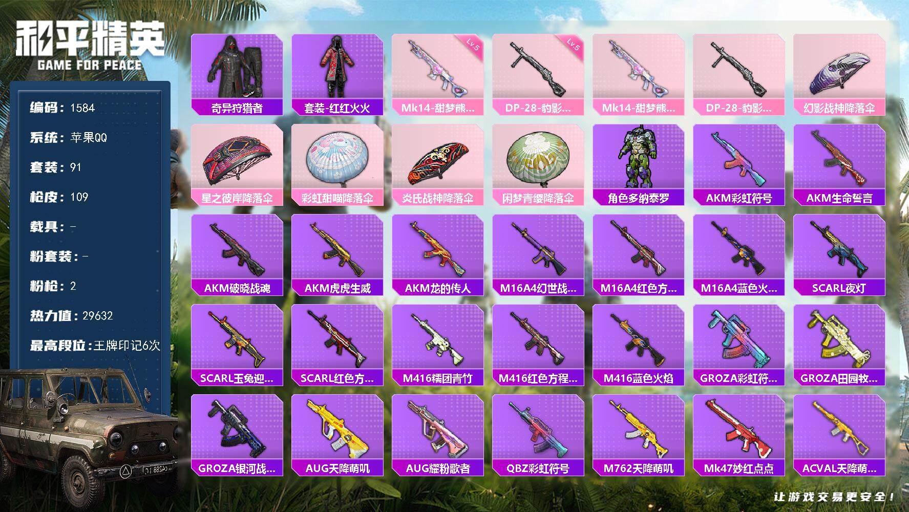 [14136918]苹果 手Q-0粉装-2特效枪-0载具-0粉色飞行器-29632热力值-6王牌印记-91套装-109枪皮