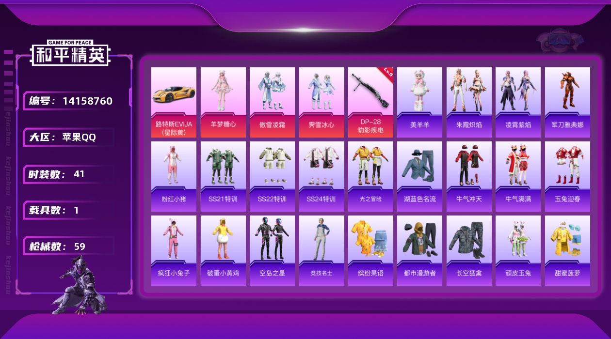 [14158760]【店主推荐捡漏号!可直接换绑】 苹果 手Q-4粉装-1特效枪-1载具-1粉色飞行器-1.9w热力值-3王牌印记-41套装-59枪皮【热门品类】:粉装-梦幻火箭,角色-军刀雅典娜,套装-粉红小猪【粉色载具】:路特斯EVIJA(星际黄)【粉色套装】:粉装-梦幻火箭,粉装-傲雪凌霜,粉装-霁雪冰心,角色-羊梦糖心【粉色枪皮等级】:DP-28-豹影疾电(五级)
