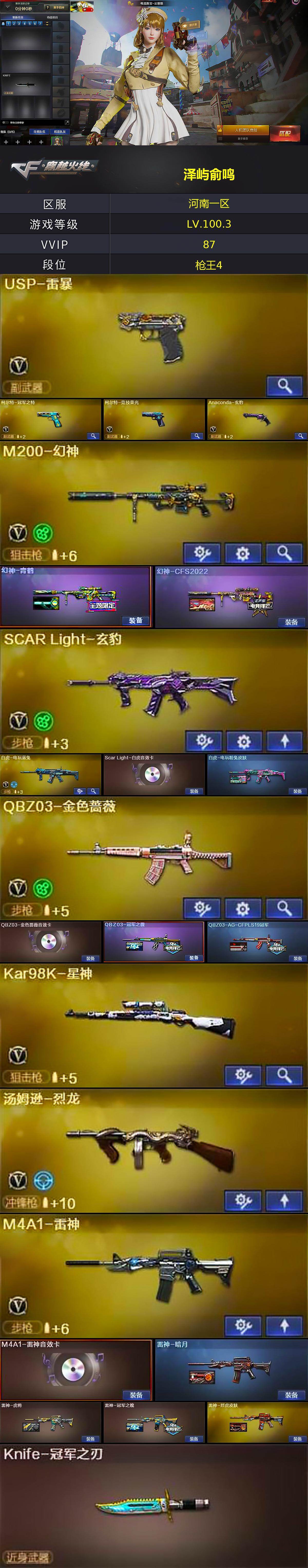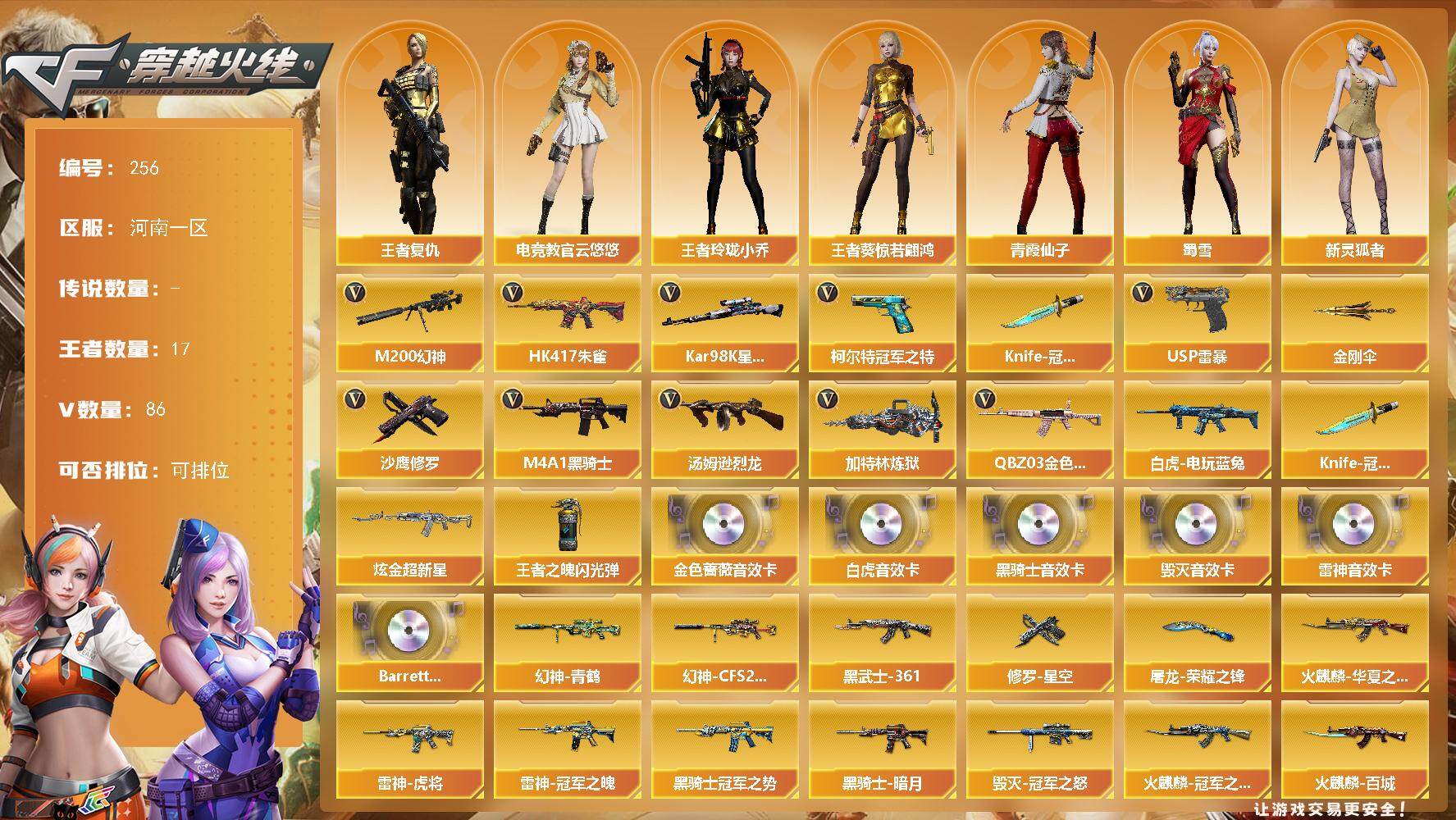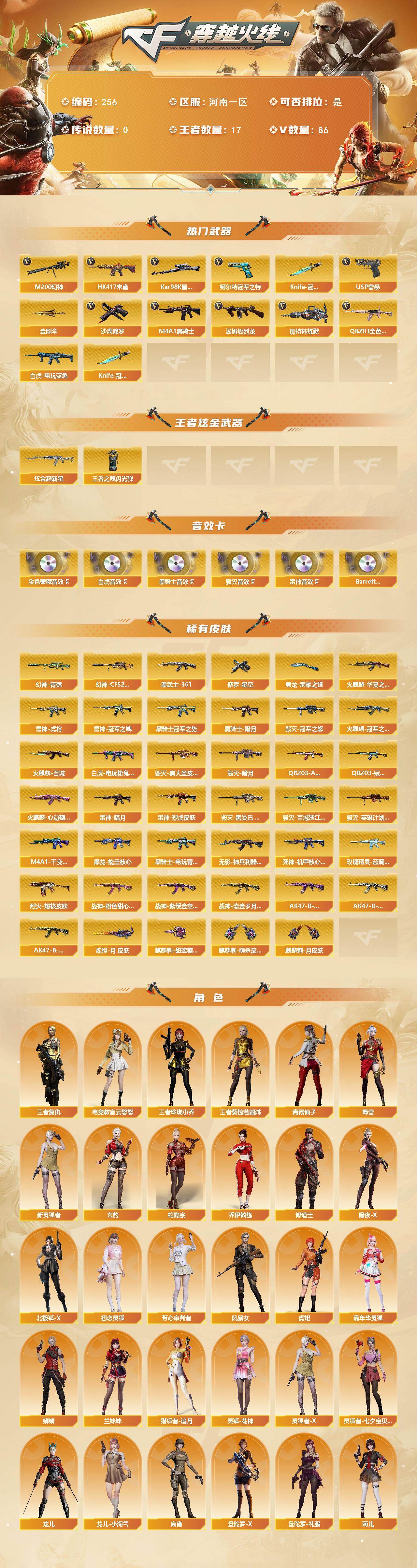[14165515]河南一区-86V-17王者-1炫金 【热门武器】:QBZ03-金色蔷薇,HK417-朱雀,M200-幻神,白虎-电玩蓝兔,柯尔特-冠军之特,Kar98K-星神,M4A1-黑骑士,汤姆逊-烈龙,加特林-炼狱,USP-雷暴,沙鹰-修罗,Knife-冠军之刃*2,金刚伞 【王者炫金武器】:炫金超新星,王者之魄闪光弹*3 【音效卡】:M4A1-雷神音效卡,M4A1-黑骑士音效卡,Barrett-毁灭音效卡,QBZ03-金色蔷薇音效卡,Scar Light-白虎音效卡,Barrett-碧霄极光音效卡*2 【皮肤】:幻神-青鹤,幻神-CFS2022,白虎-电玩粉兔皮肤,QBZ03-冠军之薇,QBZ03-AG-CFPLS19冠军,雷神-暗月,雷神-虎将,雷神-冠军之魄,雷神-烈虎皮肤,火麒麟-冠军之心,火麒麟-华夏之心,火麒麟-百城,火麒麟-心动糖果,毁灭-暗月,毁灭-冠军之怒,毁灭-黑大圣皮肤,毁灭-黑曼巴 皮肤,毁灭-百城浙江 皮肤,毁灭-英雄计划 皮肤,M4A1-千变-孔明皮肤,黑龙-能量核心,黑骑士-暗月,黑骑士-冠军之势,黑骑士-电玩青兔皮肤,无影-神兵利器 皮肤,死神-机甲核心皮肤,AK47-黑武士-361,玫瑰精灵-蓝调梦幻 皮肤,烈火-熔核皮肤,战神-粉色甜心皮肤*2,战神-紫绶金章皮肤*2,战神-流金岁月皮肤,AK47-B-常胜将军-曹操,AK47-B-常胜将军-刘备,AK47-B-常胜将军-孙权*4,炼狱-月 皮肤,修罗-星空,屠龙-荣耀之锋,麒麟刺-甜蜜糖果 皮肤,麒麟刺-萌杀皮肤,麒麟刺-月皮肤 【角色】:电竞教官-云悠悠,玄豹,王者葵-惊若翩鸿,王者复仇,王者玲珑-小乔,蛇隐宗,乔伊教练,修道士,暗夜-X,北极狐-X,初恋灵狐,芳心审判者,风暴女*2,虎妞,嘉年华灵狐,娟娟,兰妹妹,猎狐者-追月,灵狐-花神,灵狐者-X,灵狐者-七夕宝贝,龙儿,龙儿-小淘气,麻雀,曼陀罗-X,曼陀罗-礼服,萌儿,潘多拉-X,潘多拉-甜心教官,潜龙队-X,青霞仙子,蛇姬,斯沃特-X,蜀雪,兔囡囡,新灵狐者,新娜塔莎,雪莉杨-摸金校尉,夜玫瑰-幻能朋克,樱-战斗天使,影武者-X 【人偶武器】:M4A1-雷神-精英刀锋*2,异变清道夫-蛇影双骄,AWM-灵狐-15周年嘉年华*2,迷你深渊冰龙,迷你波特博士,夺魂,生化手雷-机甲核心*3,深渊终结者手雷,闪光弹-小乔,闪光弹-貂