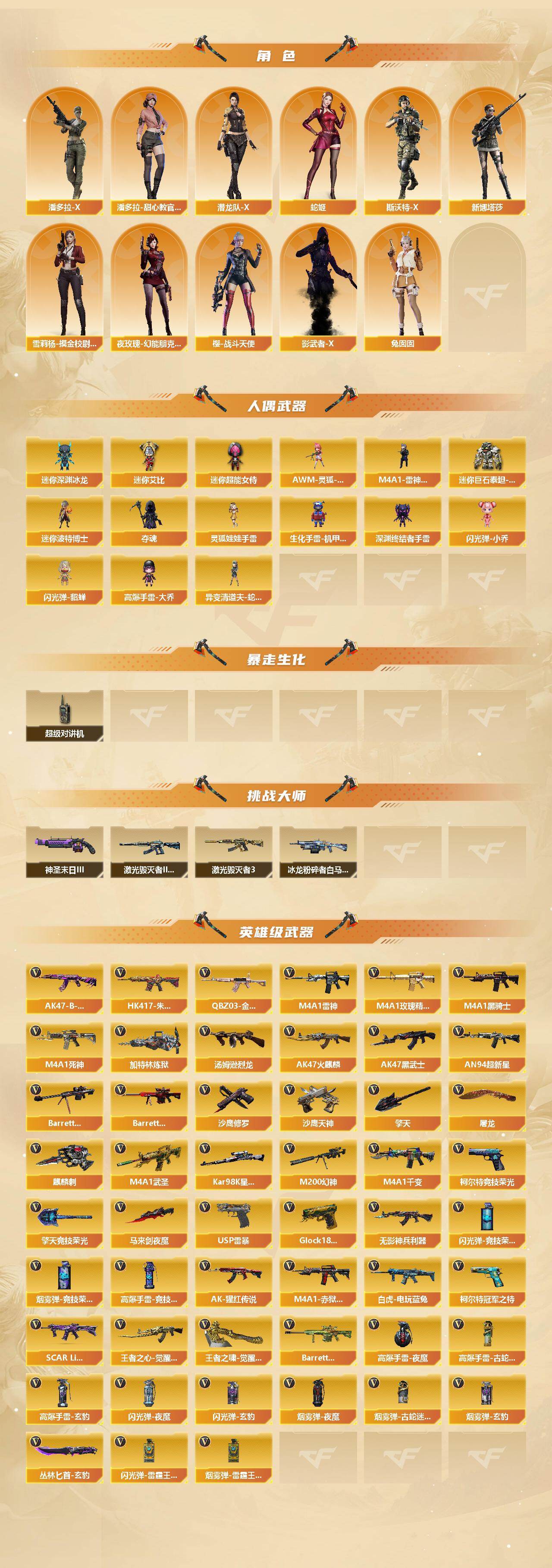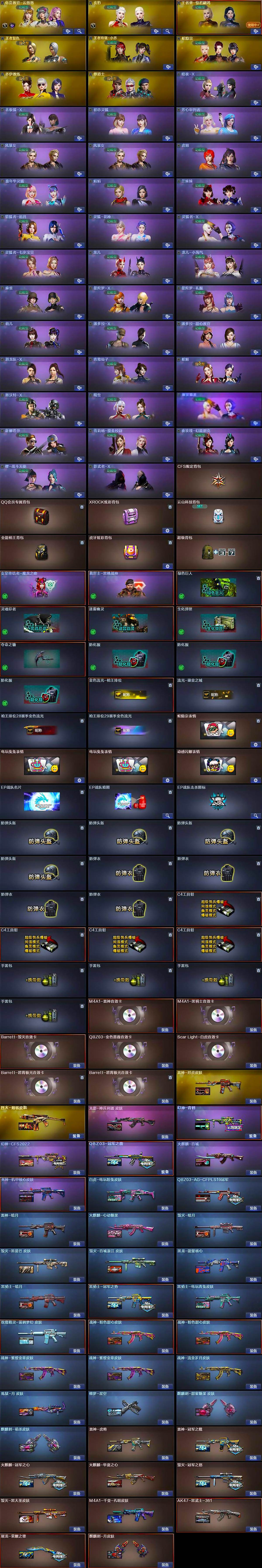 【皮肤】:幻神-青鹤,幻神-CFS2022,白虎-电玩粉兔皮肤,QBZ03-冠军之薇,QBZ03-AG-CFPLS19冠军,雷神-暗月,雷神-虎将,雷神-冠军之魄,雷神-烈虎皮肤,火麒麟-冠军之心,火麒麟-华夏之心,火麒麟-百城,火麒麟-心动糖果,毁灭-暗月,毁灭-冠军之怒,毁灭-黑大圣皮肤,毁灭-黑曼巴 皮肤,毁灭-百城浙江 皮肤,毁灭-英雄计划 皮肤,M4A1-千变-孔明皮肤,黑龙-能量核心,黑骑士-暗月,黑骑士-冠军之势,黑骑士-电玩青兔皮肤,无影-神兵利器 皮肤,死神-机甲核心皮肤,AK47-黑武士-361,玫瑰精灵-蓝调梦幻 皮肤,烈火-熔核皮肤,战神-粉色甜心皮肤*2,战神-紫绶金章皮肤*2,战神-流金岁月皮肤,AK47-B-常胜将军-曹操,AK47-B-常胜将军-刘备,AK47-B-常胜将军-孙权*4,炼狱-月 皮肤,修罗-星空,屠龙-荣耀之锋,麒麟刺-甜蜜糖果 皮肤,麒麟刺-萌杀皮肤,麒麟刺-月皮肤