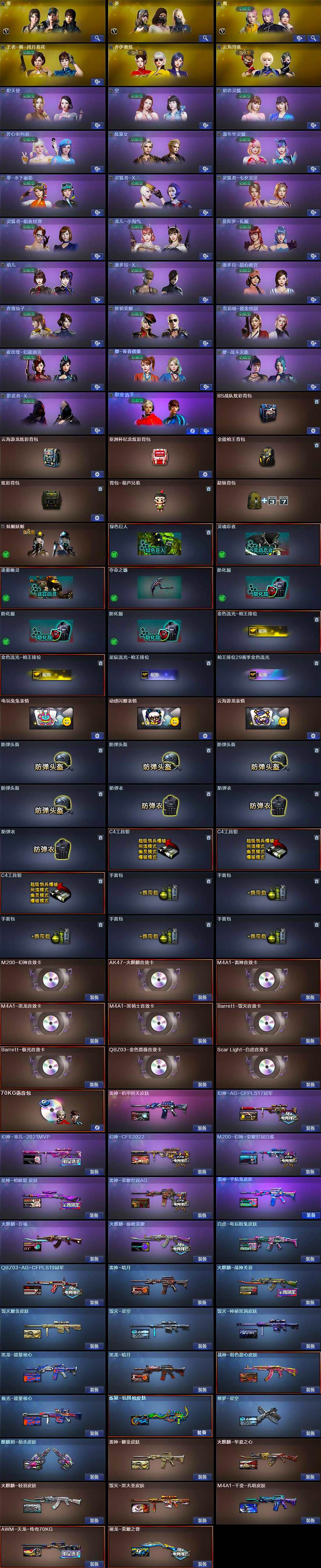 【皮肤】:幻神-AG-CFPLS17冠军,幻神-宠儿-2021MVP,幻神-CFS2022,M200-幻神-荣耀世冠白鲨,白虎-电玩粉兔皮肤,QBZ03-AG-CFPLS19冠军,星神-枪娘默 皮肤,雷神-暗月,雷神-耀金皮肤,雷神-荣耀世冠AG,雷神-机甲刑天皮肤,雷神-宇航兔皮肤,火麒麟-华夏之心,火麒麟-轻羽皮肤,火麒麟-战神关羽,火麒麟-百城,火麒麟-巅峰荣耀,毁灭耀金皮肤,毁灭-星空,毁灭-黑大圣皮肤,毁灭-神秘黑洞皮肤,M4A1-千变-孔明皮肤,黑龙-能量核心,黑龙-暗月,战神-粉色甜心皮肤,AK47-B-常胜将军-刘备*2,AWM-天龙-传奇70KG,极光-能量核心,炼狱-玩具枪皮肤,修罗-星空,屠龙-荣耀之锋,麒麟刺-萌杀皮肤