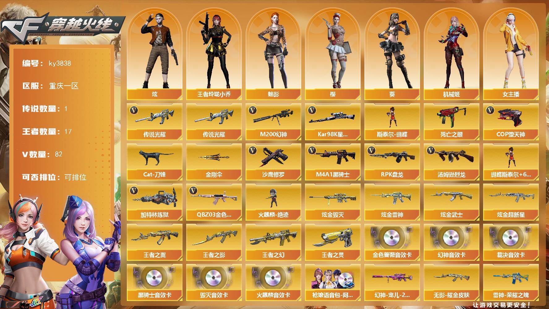 [14166522]重庆一区-82V-17王者-4炫金 【传说武器】:传说光耀 【热门武器】:传说光耀,QBZ03-金色蔷薇,M200-幻神,死亡之眼,Kar98K-星神,Cat-刀锋,M4A1-黑骑士*2,汤姆逊-烈龙*6,RPK-盘龙,加特林-炼狱*2,斯泰尔-蝴蝶,火麒麟-绝迹,COP-堕天神,沙鹰-修罗*5,金刚伞 【王者炫金武器】:王者之幻,王者之翼,王者之影,王者之灵,炫金雷神,炫金武士,炫金超新星,炫金毁灭 【音效卡】:M200-幻神音效卡,AK47-火麒麟音效卡*2,M4A1-黑骑士音效卡,Barrett-毁灭音效卡,QBZ03-金色蔷薇音效卡,AWM-裁决音效卡,枪娘语音包-阿敏 【皮肤】:幻神-宠儿-2021MVP,雷神-荣耀之魄,雷神-宠儿-2019MVP,AK47-火麒麟-传奇EVEN,火麒麟-心动糖果,毁灭耀金皮肤,毁灭-星空,M4A1-千变-孔明皮肤,无影耀金皮肤,战神-粉色甜心皮肤,战神-紫绶金章皮肤*2,战神-流金岁月皮肤,AK47-B-常胜将军-曹操,AK47-B-常胜将军-刘备*2,AK47-B-常胜将军-孙权,修罗-能量核心*3 【角色】:葵,樱,魅影,炫,机械姬,王者玲珑-小乔,云海玲珑,暗夜-X,初恋灵狐,芳心审判者,飞虎队-X,虎妞,嘉年华灵狐,零-水下丽影,灵狐-花神,灵狐者-七夕宝贝,龙儿,龙儿-小淘气,曼陀罗-X,曼陀罗-礼服,女主播,潘多拉-X,潘多拉-甜心教官,潜龙队-X,青霞仙子,斯沃特-X,铁骑荣耀,兔囡囡,影武者-X,游珑儿 【人偶武器】:火麒麟-绝迹,M4A1-雷神-精英刀锋,斯泰尔-蝴蝶,AWM-灵狐-15周年嘉年华,海滩汪汪-巴雷特,Cat-刀锋,迷你深渊冰龙,夺魂,迷你火种,迷你生化手雷,闪光弹-小乔,闪光弹-貂蝉,高爆手雷-大乔,灵狐娃娃手雷 【暴走生化】:死亡之眼,超级对讲机 【挑战大师】:AK47-冰龙粉碎者,激光毁灭者III-白马银枪,激光毁灭者III,神圣爆裂者-末日III 【英雄级武器】:M4A1-千变,AK47-火麒麟*4,M4A1-黑龙*2,M4A1-雷神,M4A1-黑骑士*2,AK47-黑武士,AK12-天启*2,AN94-超新星,AK47-机械迷城,AK47-黑鲨,M4A1-龙血,无影-神兵利器,黑武士-锦绣游龙,QBZ03-金色蔷薇,王者之势-觉醒版,AK-47-猩红传说,AK47-B-战神,A