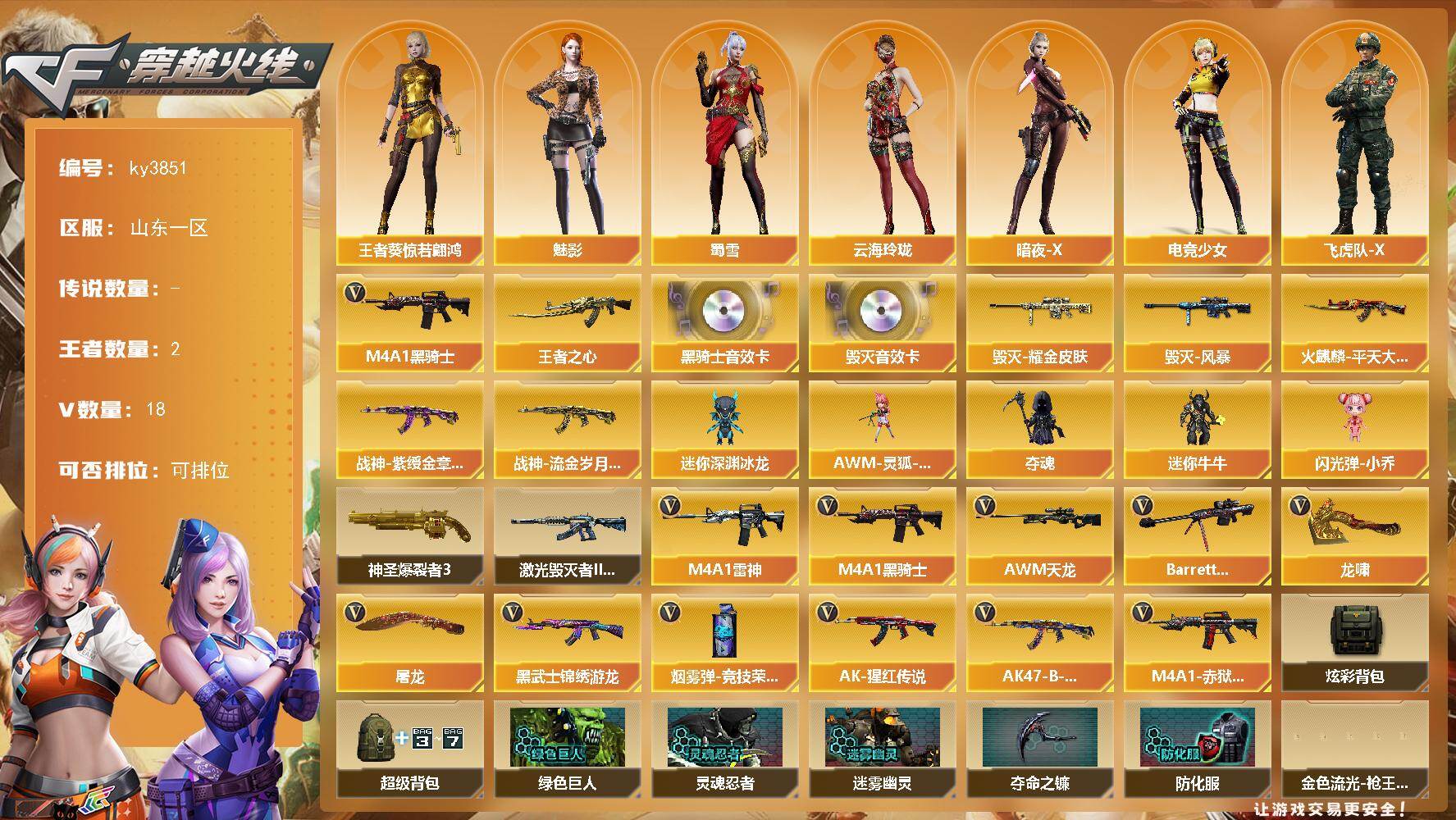 [14166599]山东一区-18V-2王者-0炫金 【热门武器】:M4A1-黑骑士 【王者炫金武器】:王者之心 【音效卡】:M4A1-黑骑士音效卡,Barrett-毁灭音效卡 【皮肤】:火麒麟-平天大圣,毁灭耀金皮肤,毁灭-风暴,战神-紫绶金章皮肤*5,战神-流金岁月皮肤*5 【角色】:魅影,王者葵-惊若翩鸿,云海玲珑,暗夜-X,电竞少女,飞虎队-X,风暴女,嘉年华灵狐,灵狐者-黄金海岸,曼陀罗-X,萌儿,潘多拉-X,潘多拉-甜心教官,潜龙队-X,蜀雪,兔囡囡,新娜塔莎,影武者-X,游珑儿 【人偶武器】:AWM-灵狐-15周年嘉年华,迷你深渊冰龙,夺魂,迷你牛牛,闪光弹-小乔 【挑战大师】:神圣爆裂者III,激光毁灭者III-白马银枪 【英雄级武器】:M4A1-雷神,M4A1-黑骑士,黑武士-锦绣游龙,AK-47-猩红传说,AK47-B-战神,AWM-天龙,Barrett-毁灭*2,屠龙*2,龙啸,烟雾弹-竞技荣光*3,M4A1-赤狱骑士 【道具】:炫彩背包,超级背包,绿色巨人,灵魂忍者*2,迷雾幽灵*2,夺命之镰,防化服*3,金色流光-枪王排位*2,星辰流光-枪王排位,枪王排位28赛季金色流光,防弹头盔*6,防弹衣*5,C4工具钳*5,手雷包*4 【特殊枪械】:1黑骑士