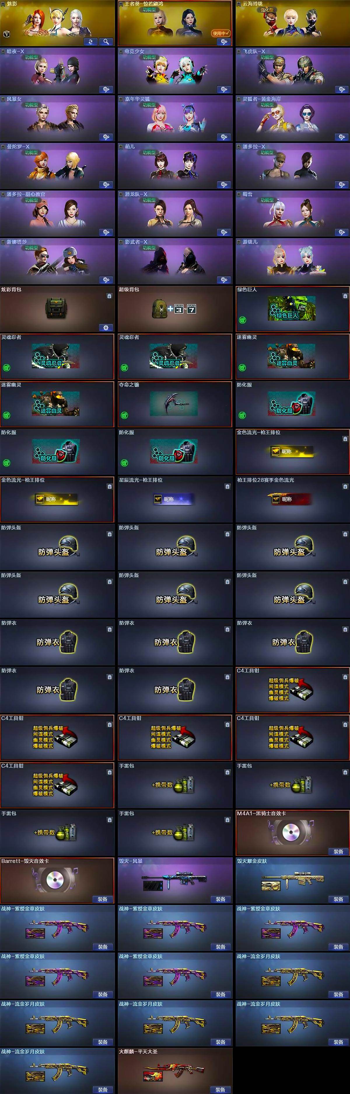 【道具】:炫彩背包,超级背包,绿色巨人,灵魂忍者*2,迷雾幽灵*2,夺命之镰,防化服*3,金色流光-枪王排位*2,星辰流光-枪王排位,枪王排位28赛季金色流光,防弹头盔*6,防弹衣*5,C4工具钳*5,手雷包*4