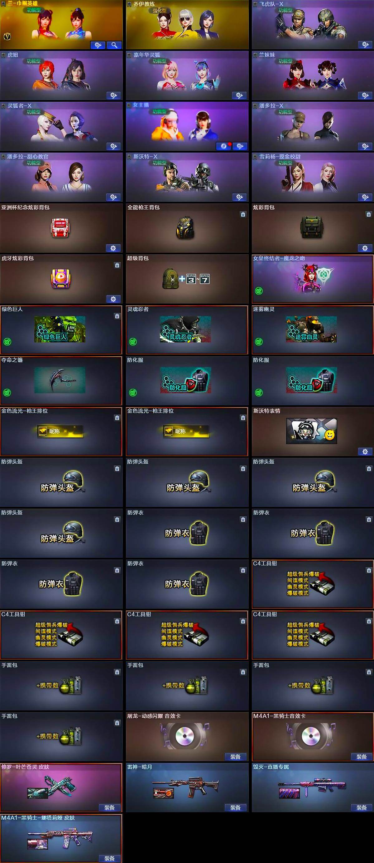 【道具】:亚洲杯纪念炫彩背包,全能枪王背包,炫彩背包,虎牙炫彩背包,超级背包,女皇终结者-魔龙之吻,绿色巨人,灵魂忍者,迷雾幽灵,夺命之镰,防化服*2,金色流光-枪王排位*2,斯沃特表情,防弹头盔*4,防弹衣*4,C4工具钳*4,手雷包*4