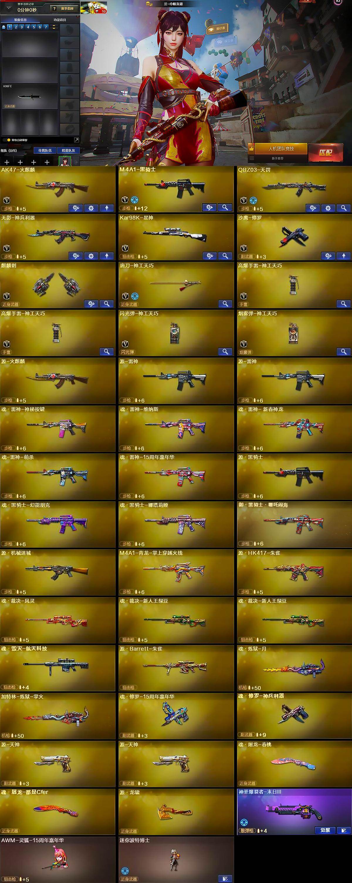 【英雄级武器】:AK47-火麒麟,M4A1-黑骑士,QBZ03-天罚,无影-神兵利器,Kar98K-星神,沙鹰-修罗,麒麟刺,唐刀-神工天巧,高爆手雷-神工天巧*2,闪光弹-神工天巧,烟雾弹-神工天巧