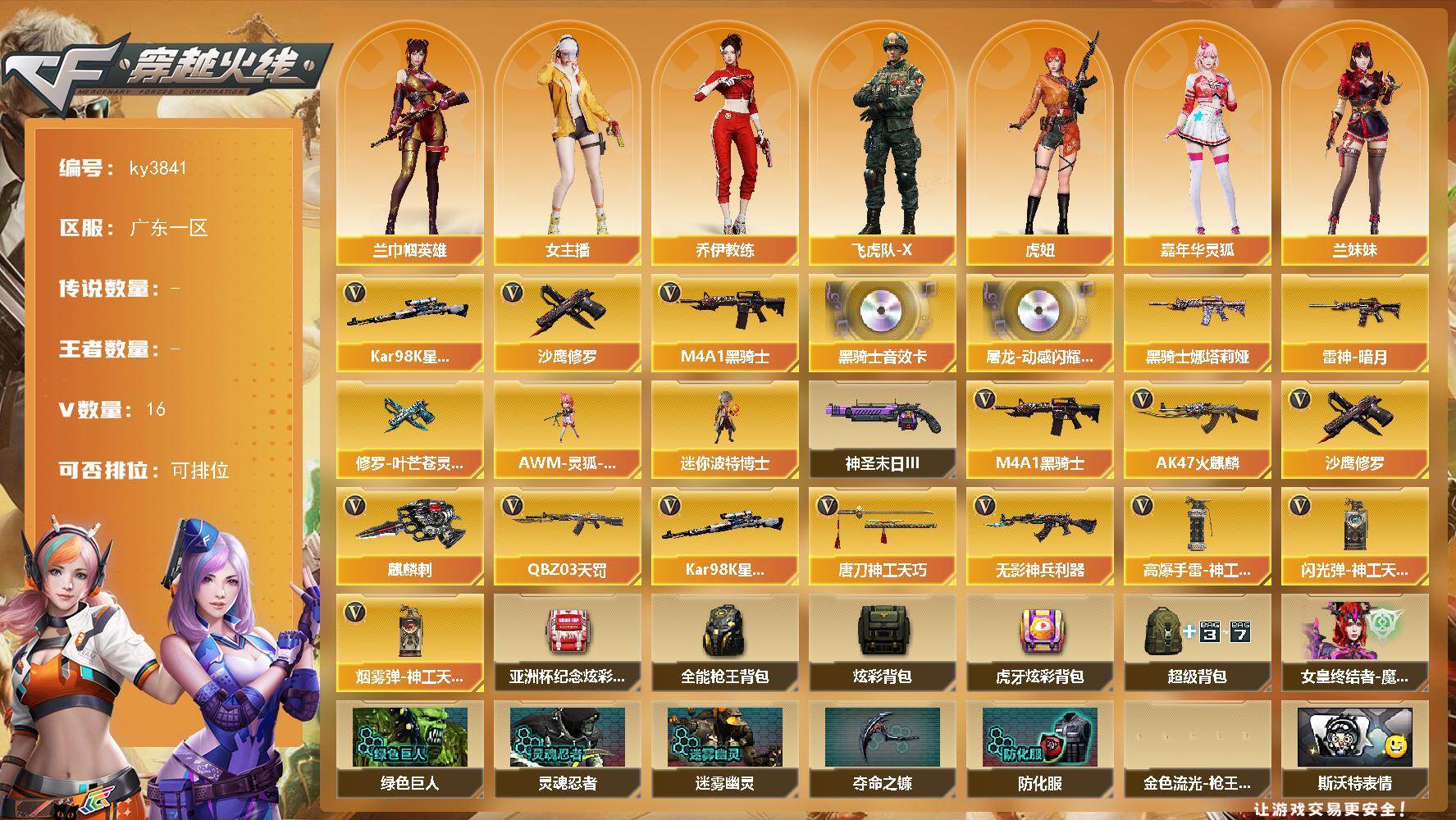 [14166772]广东一区-16V-0王者-0炫金 【热门武器】:Kar98K-星神,M4A1-黑骑士,沙鹰-修罗 【音效卡】:屠龙-动感闪耀 音效卡,M4A1-黑骑士音效卡 【皮肤】:雷神-暗月,M4A1-黑骑士-娜塔莉娅 皮肤,修罗-叶芒苍灵 皮肤 【角色】:兰-巾帼英雄,乔伊教练,飞虎队-X,虎妞,嘉年华灵狐,兰妹妹,灵狐者-X,女主播,潘多拉-X,潘多拉-甜心教官,斯沃特-X,雪莉杨-摸金校尉 【人偶武器】:AWM-灵狐-15周年嘉年华,迷你波特博士 【挑战大师】:神圣爆裂者-末日III 【英雄级武器】:AK47-火麒麟,M4A1-黑骑士,QBZ03-天罚,无影-神兵利器,Kar98K-星神,沙鹰-修罗,麒麟刺,唐刀-神工天巧,高爆手雷-神工天巧*2,闪光弹-神工天巧,烟雾弹-神工天巧 【道具】:亚洲杯纪念炫彩背包,全能枪王背包,炫彩背包,虎牙炫彩背包,超级背包,女皇终结者-魔龙之吻,绿色巨人,灵魂忍者,迷雾幽灵,夺命之镰,防化服*2,金色流光-枪王排位*2,斯沃特表情,防弹头盔*4,防弹衣*4,C4工具钳*4,手雷包*4 【特殊枪械】:1黑骑士