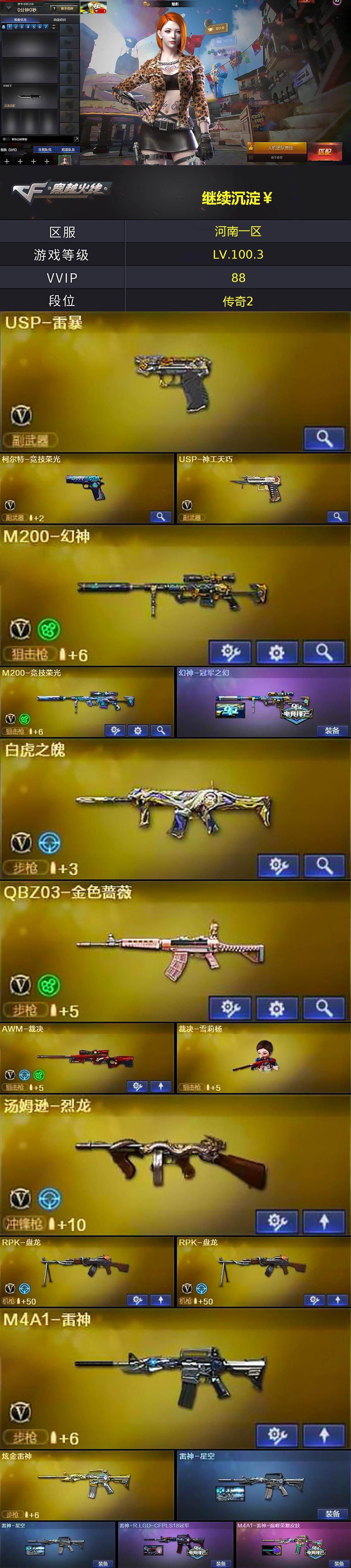 【热门武器】:QBZ03-金色蔷薇,M200-幻神,M200-竞技荣光,炼狱-迷你小钢,M4A1-黑骑士,汤姆逊-烈龙,RPK-盘龙*2,加特林-炼狱*2,裁决-雪莉杨,USP-雷暴,沙鹰-修罗*7