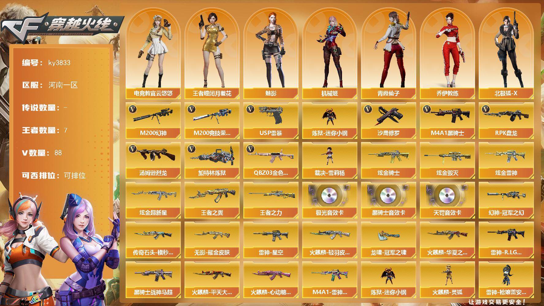 [14166867]河南一区-88V-7王者-7炫金 【热门武器】:QBZ03-金色蔷薇,M200-幻神,M200-竞技荣光,炼狱-迷你小钢,M4A1-黑骑士,汤姆逊-烈龙,RPK-盘龙*2,加特林-炼狱*2,裁决-雪莉杨,USP-雷暴,沙鹰-修罗*7 【王者炫金武器】:王者之翼,王者之力,炫金骑士*2,炫金雷神,炫金超新星*2,炫金毁灭*2 【音效卡】:M4A1-黑骑士音效卡,Barrett-极光音效卡,QBZ03-天罚音效卡 【皮肤】:幻神-冠军之幻,雷神-星空*2,雷神-R.LGD-CFPLS18冠军,M4A1-雷神-巅峰荣耀皮肤,火麒麟-华夏之心,火麒麟-轻羽皮肤,传奇石头-横秒之巅,火麒麟-平天大圣,火麒麟-心动糖果,黑骑士-战神马超,无影耀金皮肤*2,龙啸-冠军之啸 【角色】:魅影,电竞教官-云悠悠,机械姬,王者-瞳-闭月羞花,乔伊教练,北极狐-X,电竞少女,风暴女,虎妞,嘉年华灵狐,娟娟,0号玩家,灵狐者-X,潘多拉-X,青霞仙子,斯沃特-X,影武者-X 【人偶武器】:裁决-雪莉杨,火麒麟-灵狐,雷神-枪娘蕾安娜,炼狱-迷你小钢,AWM-灵狐-15周年嘉年华,COP-旗袍,迷你裂空之翼*3,迷你波特博士*4,夺魂,迷你火种*7,深渊终结者手雷,灵狐娃娃手雷 【暴走生化】:黑龙吞噬者,超级对讲机 【挑战大师】:神圣爆裂者III*2,冰龙粉碎者-白马银枪*2,激光毁灭者III-白马银枪,VEPR-12-金魔*2,激光毁灭者III*2,机甲撕裂者III,KAC-圣炎切割者III,神圣爆裂者-末日III 【英雄级武器】:M4A1-千变,AK47-火麒麟*2,M4A1-黑龙,M4A1-雷神,M4A1-黑骑士,AK47-无影,M4A1-死神*2,AK47-黑武士*2,AK12-天启,AN94-超新星,M4A1-武圣,AK47-黑鲨*2,M4A1-龙血,QBZ03-天罚,M4A1-神工天巧,无影-神兵利器,M4A1-玫瑰精灵,QBZ03-金色蔷薇,M4A1-猎神,烈火-动感闪耀,王者之翼-觉醒版,王者之幻-觉醒版,白虎之魄-觉醒版,AWM-天龙*2,Barrett-毁灭*2,Barrett-极光*2,AWM-裁决,M200-幻神,M200-竞技荣光,Barrett-金色蔷薇,王者之力-觉醒版,RPK-盘龙*2,加特林-炼狱*2,汤姆逊-烈龙,沙鹰-修罗*7,沙鹰-天神,USP-雷暴,