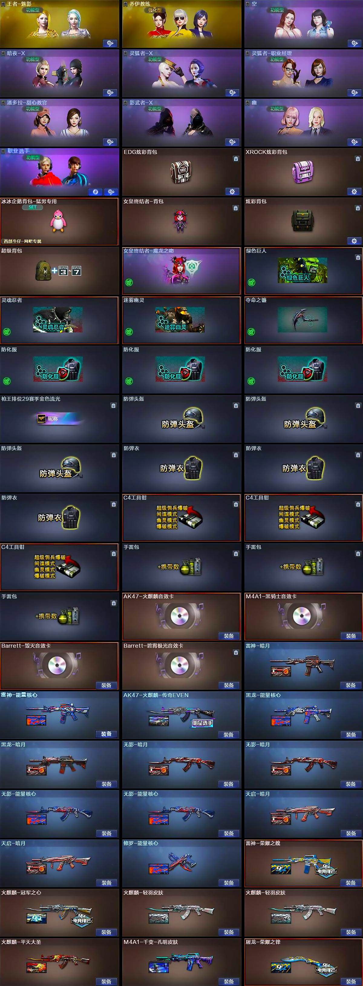 【道具】:EDG炫彩背包,XROCK炫彩背包,冰冰企鹅背包-猛男专用,女皇终结者-背包,炫彩背包,超级背包,女皇终结者-魔龙之吻,绿色巨人,灵魂忍者,迷雾幽灵,夺命之镰,防化服*3,枪王排位29赛季金色流光,防弹头盔*3,防弹衣*3,C4工具钳*3,手雷包*3