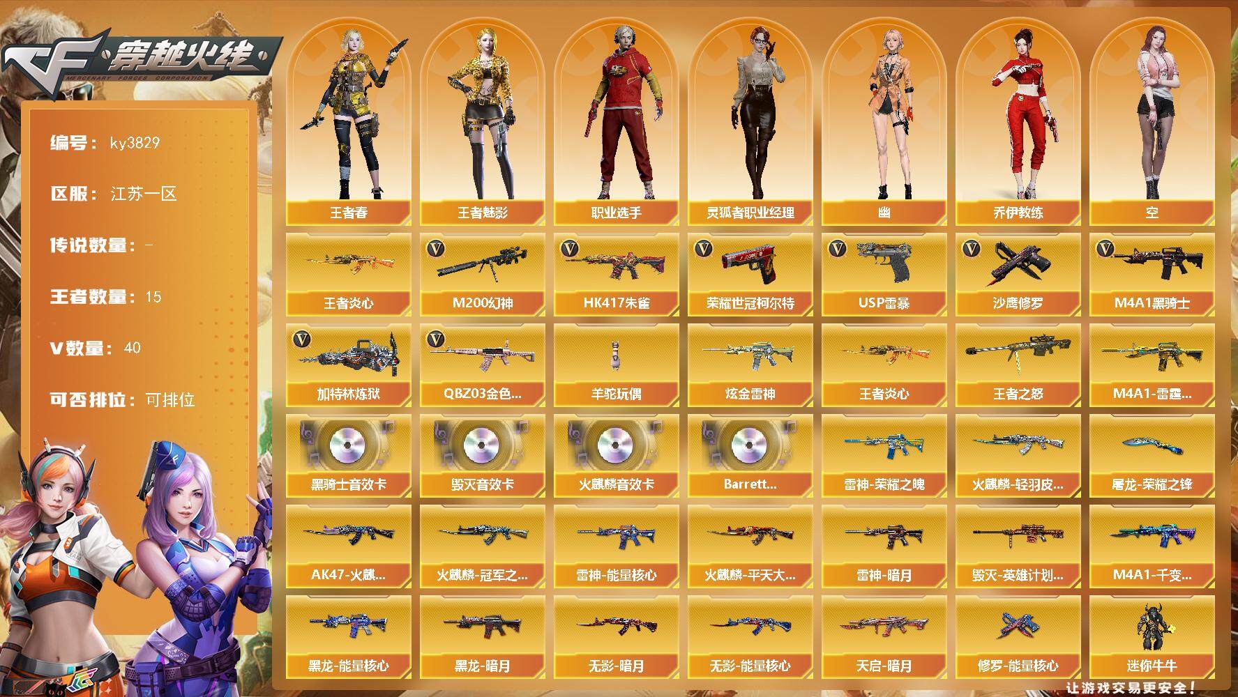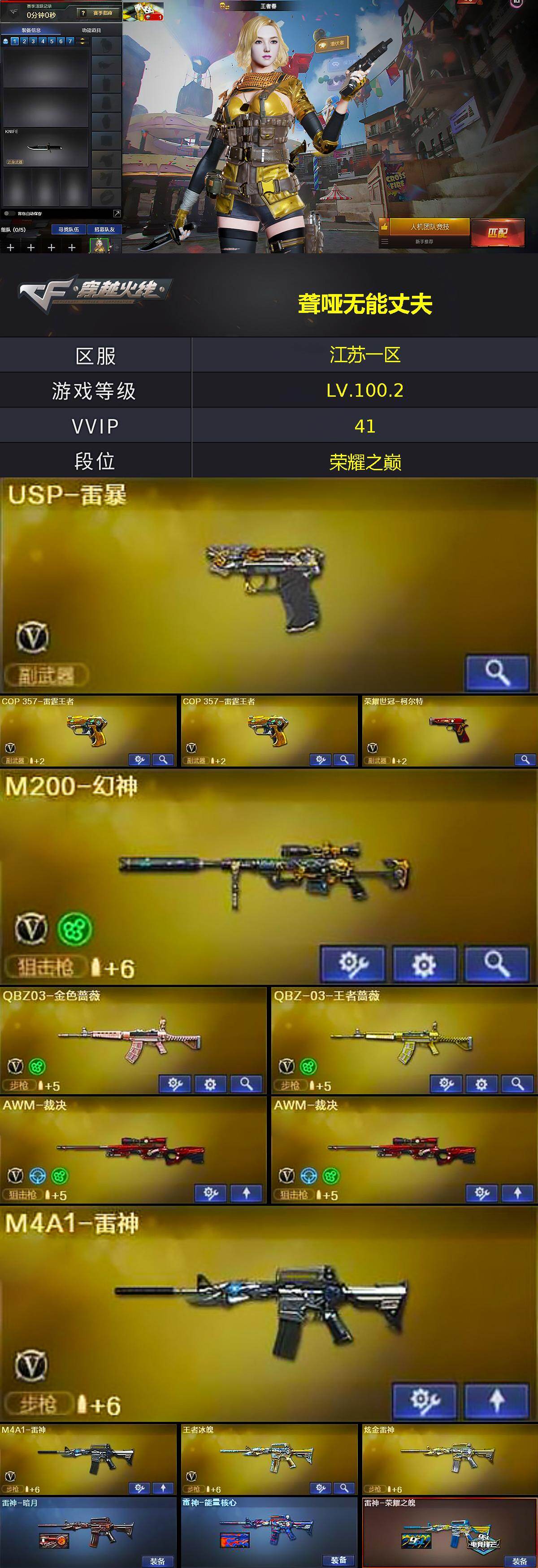 [14167210]江苏一区-40V-15王者-1炫金 【热门武器】:QBZ03-金色蔷薇,HK417-朱雀,M200-幻神,荣耀世冠-柯尔特,王者炎心,M4A1-黑骑士,加特林-炼狱*2,羊驼玩偶,USP-雷暴,沙鹰-修罗*4 【王者炫金武器】:王者炎心,M4A1-雷霆王者,王者之怒,炫金雷神 【音效卡】:AK47-火麒麟音效卡,M4A1-黑骑士音效卡,Barrett-毁灭音效卡,Barrett-碧霄极光音效卡 【皮肤】:雷神-暗月,雷神-能量核心,雷神-荣耀之魄,火麒麟-冠军之心,AK47-火麒麟-传奇EVEN,火麒麟-轻羽皮肤*2,火麒麟-平天大圣,毁灭-英雄计划 皮肤,M4A1-千变-孔明皮肤,黑龙-能量核心,黑龙-暗月,无影-暗月*2,无影-能量核心*2,天启-暗月*2,修罗-能量核心,屠龙-荣耀之锋 【角色】:王者春,王者-魅影,乔伊教练,空,暗夜-X,灵狐者-X,灵狐者-职业经理,潘多拉-甜心教官,影武者-X,幽,职业选手 【人偶武器】:迷你牛牛 【挑战大师】:神圣爆裂者III,冰龙粉碎者-白马银枪,神圣爆裂者-末日III 【英雄级武器】:AK47-火麒麟,M4A1-黑龙,M4A1-雷神*2,M4A1-黑骑士,AK47-机械迷城,AK47-黑鲨,M4A1-龙血,HK417-朱雀,QBZ03-金色蔷薇,王者之心-觉醒版,王者冰魄-觉醒版,黑骑士-海王,QBZ-03-王者蔷薇-觉醒版,Barrett-毁灭,AWM-裁决*2,M200-幻神,Barrett-金色蔷薇,加特林-炼狱*2,沙鹰-修罗*4,USP-雷暴,COP 357-雷霆王者-觉醒版*2,荣耀世冠-柯尔特,屠龙,龙啸,擎天,擎天-竞技荣光,斩神刀-雷暴,王者之刺-觉醒版,雷霆王者之锋-觉醒版,高爆手雷-雷暴*2,闪光弹-雷暴*2,闪光弹-竞技荣光*3,闪光弹-雷霆王者-觉醒版,烟雾弹-雷暴*2,烟雾弹-幻灵,烟雾弹-竞技荣光 【道具】:EDG炫彩背包,XROCK炫彩背包,冰冰企鹅背包-猛男专用,女皇终结者-背包,炫彩背包,超级背包,女皇终结者-魔龙之吻,绿色巨人,灵魂忍者,迷雾幽灵,夺命之镰,防化服*3,枪王排位29赛季金色流光,防弹头盔*3,防弹衣*3,C4工具钳*3,手雷包*3 【特殊枪械】:1黑骑士,2炼狱