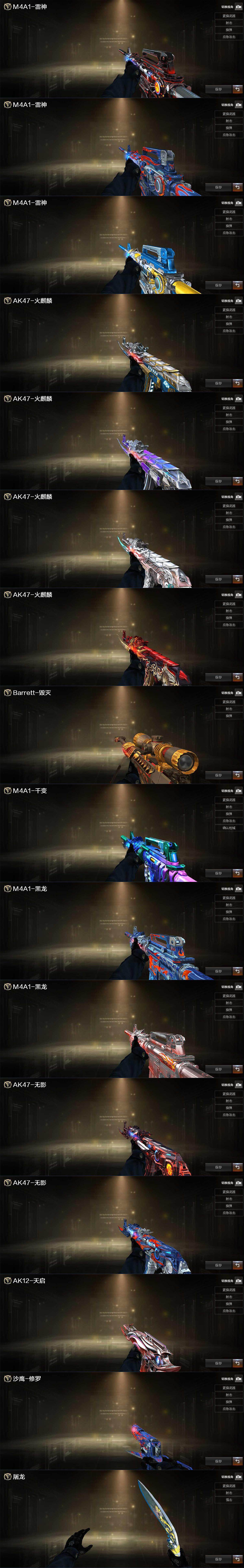 【英雄级武器】:AK47-火麒麟,M4A1-黑龙,M4A1-雷神*2,M4A1-黑骑士,AK47-机械迷城,AK47-黑鲨,M4A1-龙血,HK417-朱雀,QBZ03-金色蔷薇,王者之心-觉醒版,王者冰魄-觉醒版,黑骑士-海王,QBZ-03-王者蔷薇-觉醒版,Barrett-毁灭,AWM-裁决*2,M200-幻神,Barrett-金色蔷薇,加特林-炼狱*2,沙鹰-修罗*4,USP-雷暴,COP 357-雷霆王者-觉醒版*2,荣耀世冠-柯尔特,屠龙,龙啸,擎天,擎天-竞技荣光,斩神刀-雷暴,王者之刺-觉醒版,雷霆王者之锋-觉醒版,高爆手雷-雷暴*2,闪光弹-雷暴*2,闪光弹-竞技荣光*3,闪光弹-雷霆王者-觉醒版,烟雾弹-雷暴*2,烟雾弹-幻灵,烟雾弹-竞技荣光
