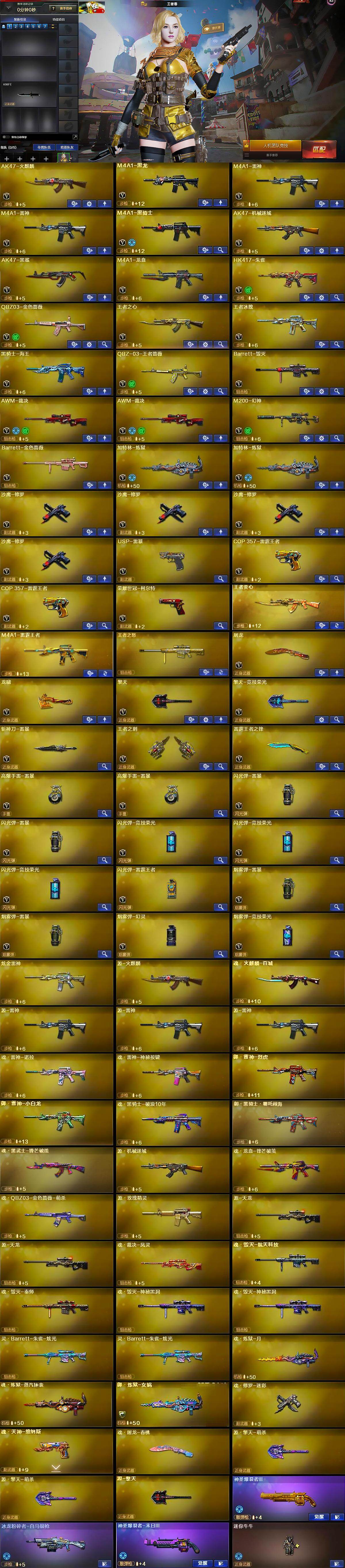 【热门武器】:QBZ03-金色蔷薇,HK417-朱雀,M200-幻神,荣耀世冠-柯尔特,王者炎心,M4A1-黑骑士,加特林-炼狱*2,羊驼玩偶,USP-雷暴,沙鹰-修罗*4