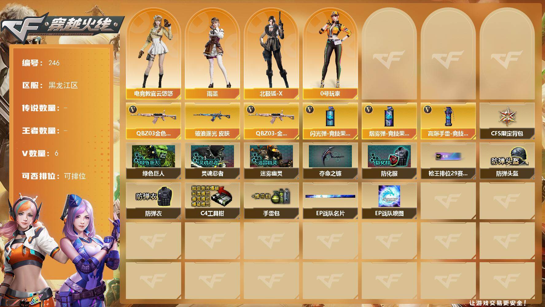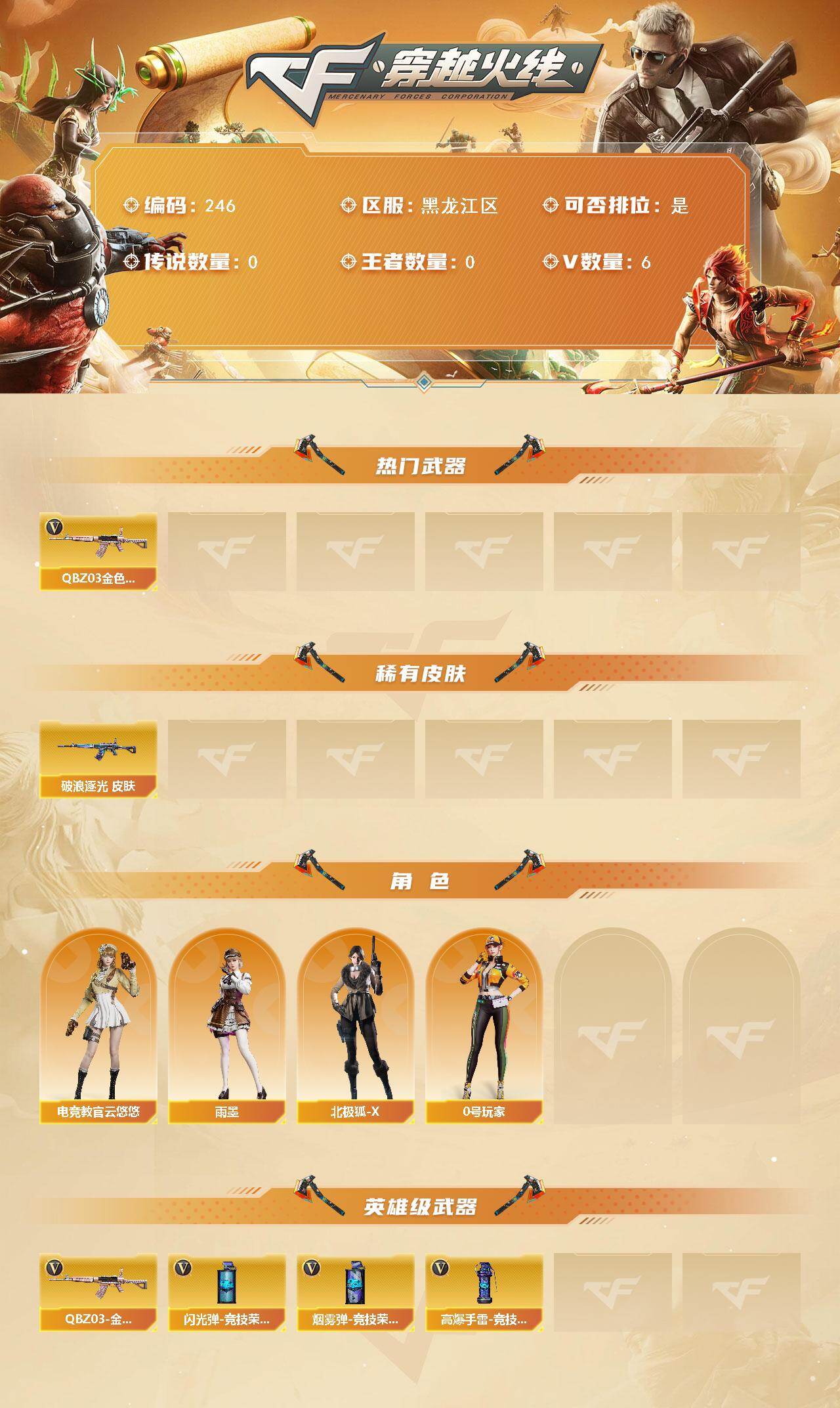 [14167738]黑龙江区-6V-0王者-0炫金 【热门武器】:QBZ03-金色蔷薇 【皮肤】:金色蔷薇-破浪逐光 皮肤 【角色】:电竞教官-云悠悠,雨墨,北极狐-X,0号玩家 【英雄级武器】:QBZ03-金色蔷薇,高爆手雷-竞技荣光,闪光弹-竞技荣光,烟雾弹-竞技荣光 【道具】:CFS限定背包,绿色巨人,灵魂忍者,迷雾幽灵,夺命之镰,防化服*2,枪王排位28赛季金色流光,枪王排位29赛季金色流光,EP战队名片,EP战队喷图,防弹头盔*2,防弹衣*2,C4工具钳*2,手雷包*2 【特殊枪械】: