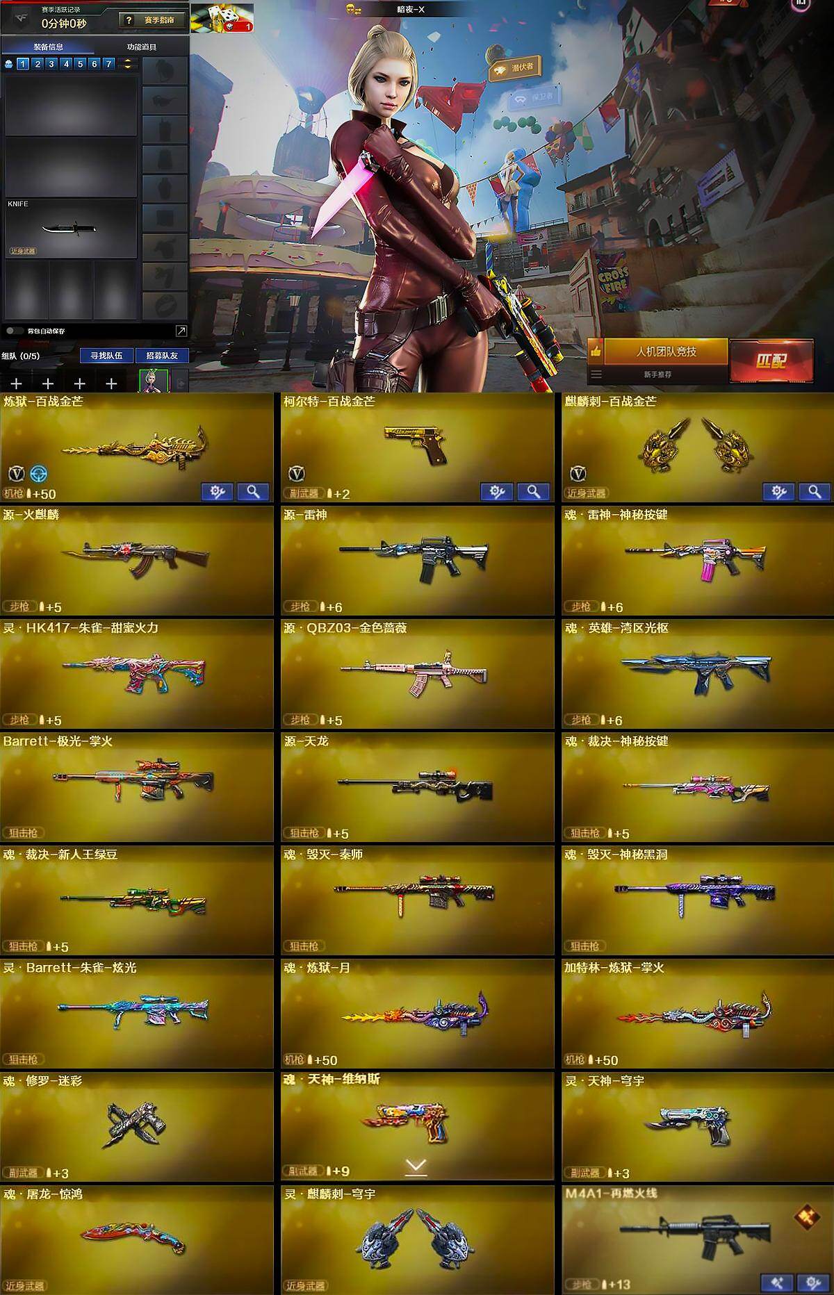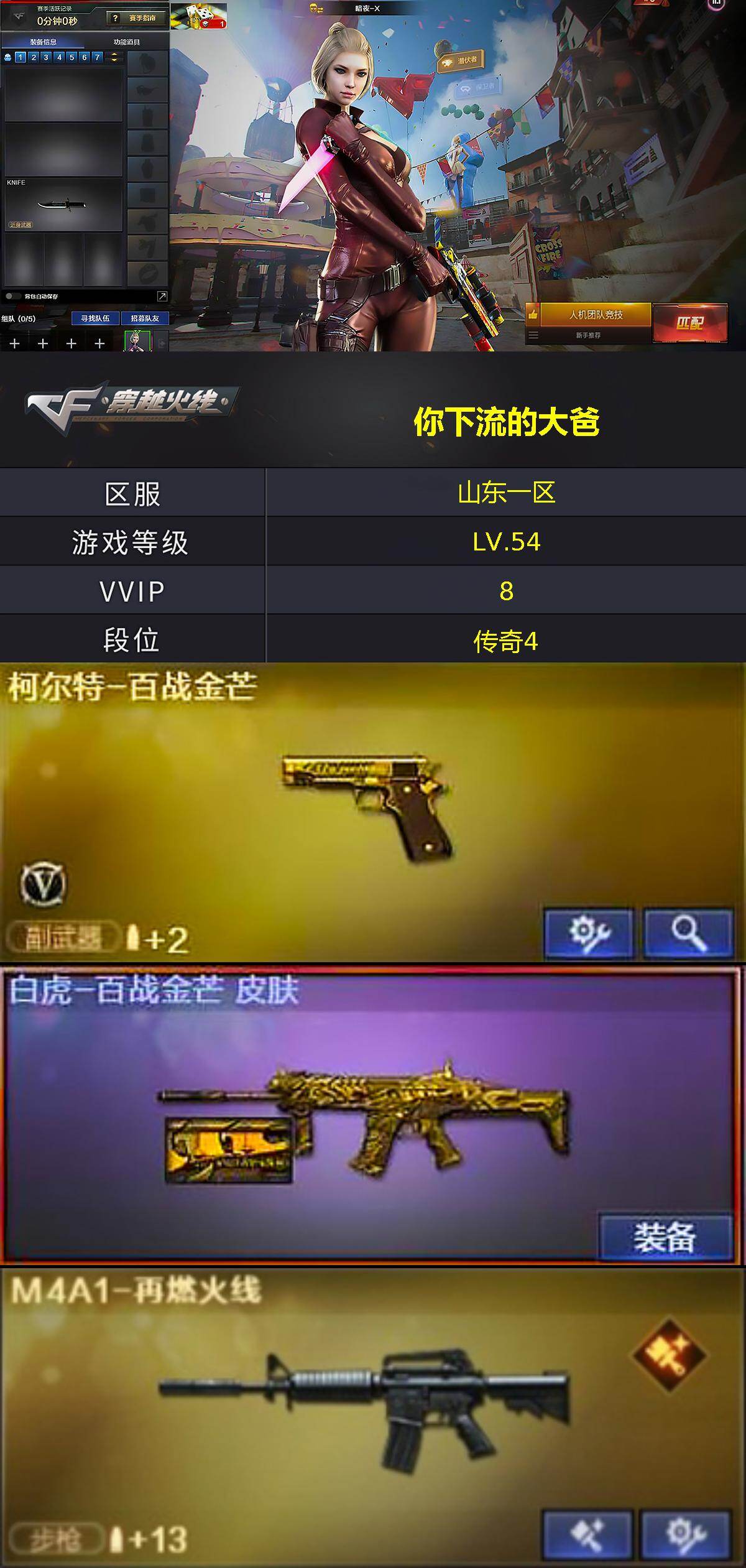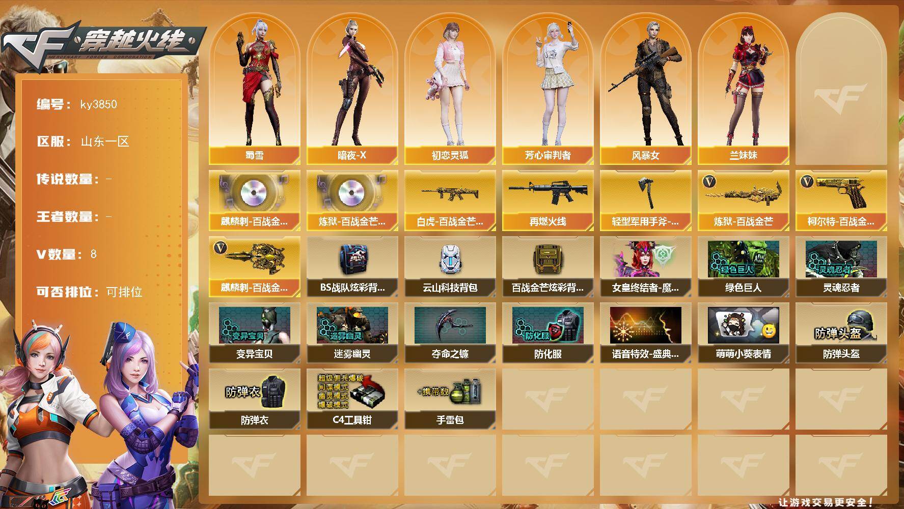 [14167910]山东一区-8V-0王者-0炫金 【音效卡】:麒麟刺-百战金芒-盛典舞曲音效卡,炼狱-百战金芒-庆典舞曲音效卡 【皮肤】:白虎-百战金芒 皮肤,M4A1-再燃火线,轻型军用手斧-再燃火线 【角色】:暗夜-X,初恋灵狐,芳心审判者,风暴女,兰妹妹,蜀雪 【英雄级武器】:炼狱-百战金芒,柯尔特-百战金芒,麒麟刺-百战金芒 【道具】:BS战队炫彩背包,云山科技背包,百战金芒炫彩背包,女皇终结者-魔龙之吻,绿色巨人,灵魂忍者*2,变异宝贝,迷雾幽灵*2,夺命之镰,防化服*3,语音特效-盛典烟火,萌萌小葵表情,防弹头盔*3,防弹衣*3,C4工具钳*3,手雷包*3 【特殊枪械】: