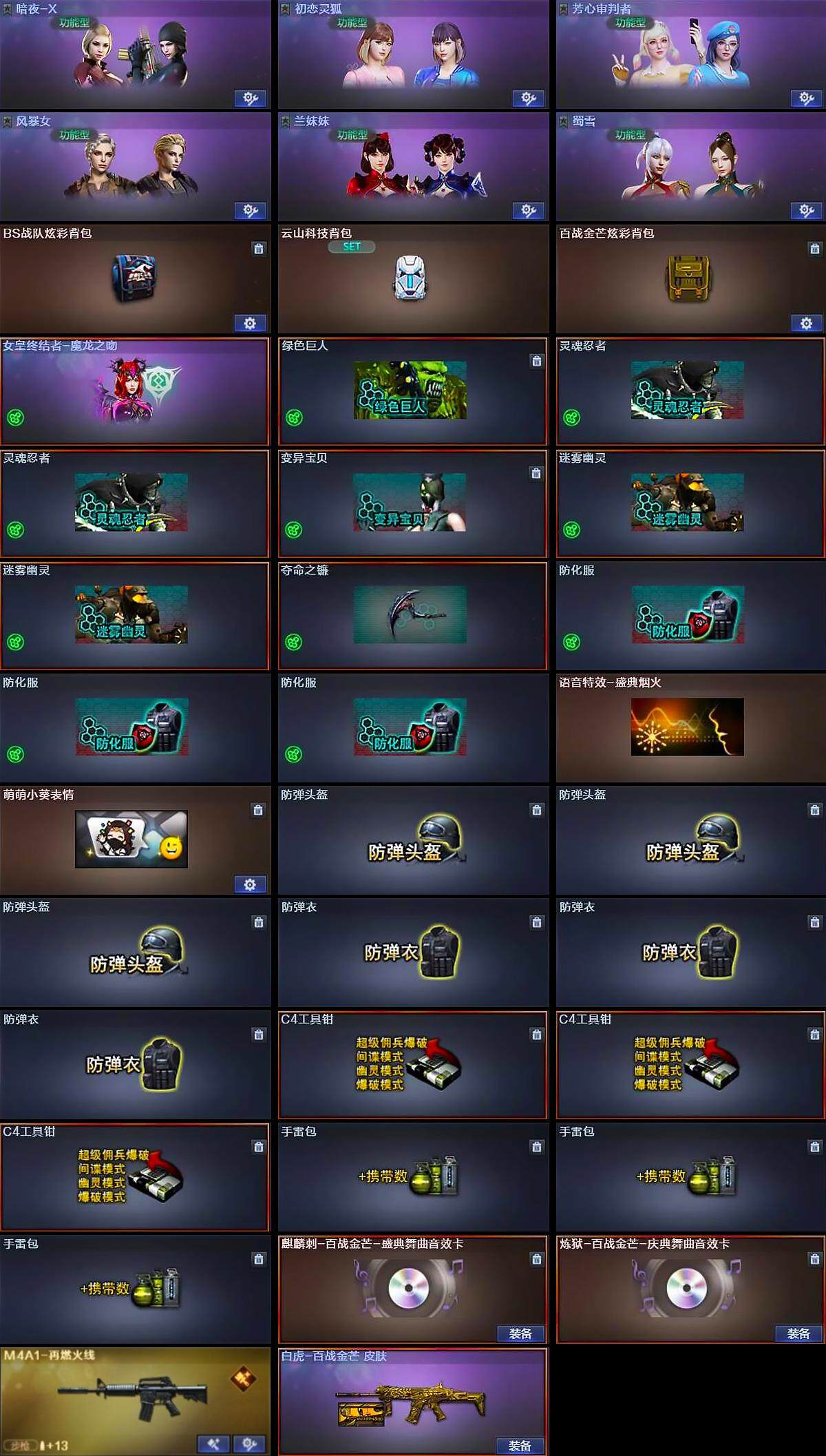 【道具】:BS战队炫彩背包,云山科技背包,百战金芒炫彩背包,女皇终结者-魔龙之吻,绿色巨人,灵魂忍者*2,变异宝贝,迷雾幽灵*2,夺命之镰,防化服*3,语音特效-盛典烟火,萌萌小葵表情,防弹头盔*3,防弹衣*3,C4工具钳*3,手雷包*3