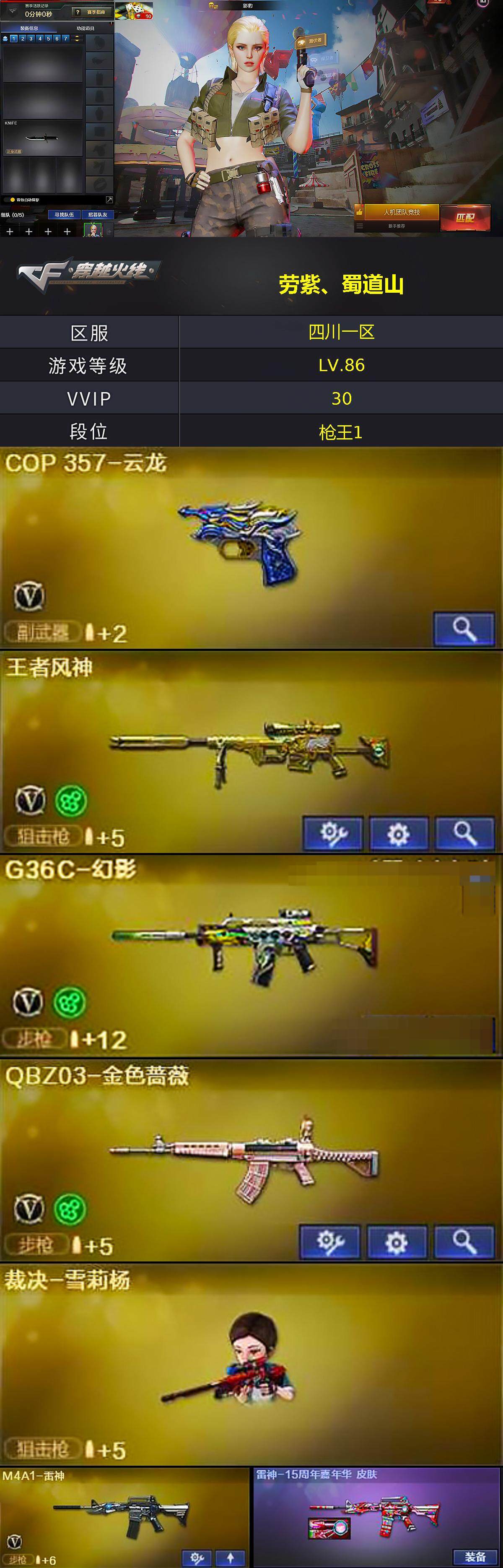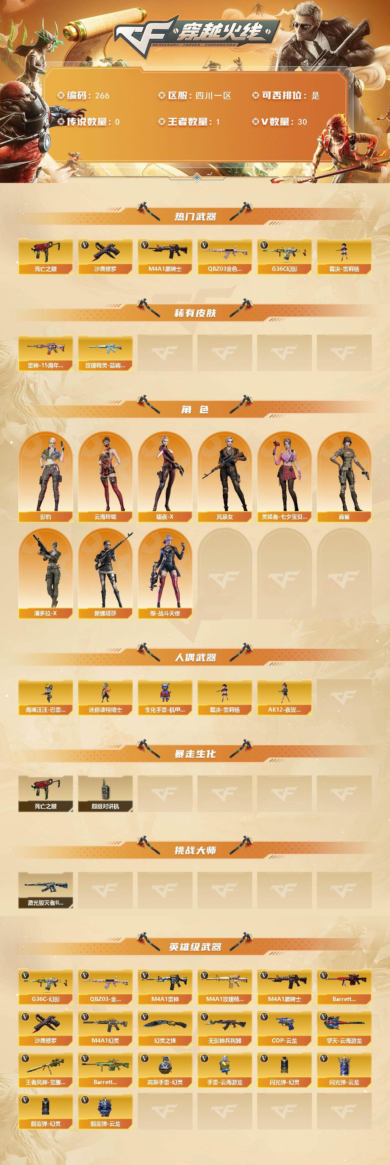 [14168984]四川一区-30V-1王者-0炫金 【热门武器】:G36C-幻影,QBZ03-金色蔷薇,死亡之眼,M4A1-黑骑士,裁决-雪莉杨,沙鹰-修罗*3 【皮肤】:雷神-15周年嘉年华 皮肤,玫瑰精灵-蓝调梦幻 皮肤 【角色】:影豹,云海玲珑,暗夜-X,风暴女,灵狐者-七夕宝贝,麻雀,潘多拉-X,新娜塔莎,樱-战斗天使 【人偶武器】:裁决-雪莉杨,海滩汪汪-巴雷特,迷你波特博士,生化手雷-机甲核心,AK12-夜玫瑰 【暴走生化】:死亡之眼,超级对讲机 【挑战大师】:激光毁灭者III-白马银枪 【英雄级武器】:M4A1-雷神,M4A1-黑骑士,M4A1-幻灵,无影-神兵利器,G36C-幻影,M4A1-玫瑰精灵,QBZ03-金色蔷薇,Barrett-极光,王者风神-觉醒版,沙鹰-修罗*3,COP 357-云龙,幻灵之锋*2,擎天-云海游龙,高爆手雷-幻灵*3,手雷-云海游龙,闪光弹-幻灵*2,闪光弹-云龙,烟雾弹-幻灵*2,烟雾弹-云龙,Barrett-碧霄极光 【道具】:战舰背包,女皇终结者-魔龙之吻,救世主-黑桃战神,绿色巨人,灵魂忍者,迷雾幽灵,夺命之镰,防化服*3,金色流光-枪王排位,星辰流光-枪王排位,流光-鎏金之域,枪王排位28赛季金色流光,枪王排位29赛季金色流光,防弹头盔*5,防弹衣*5,C4工具钳*5,手雷包*4 【特殊枪械】:1黑骑士