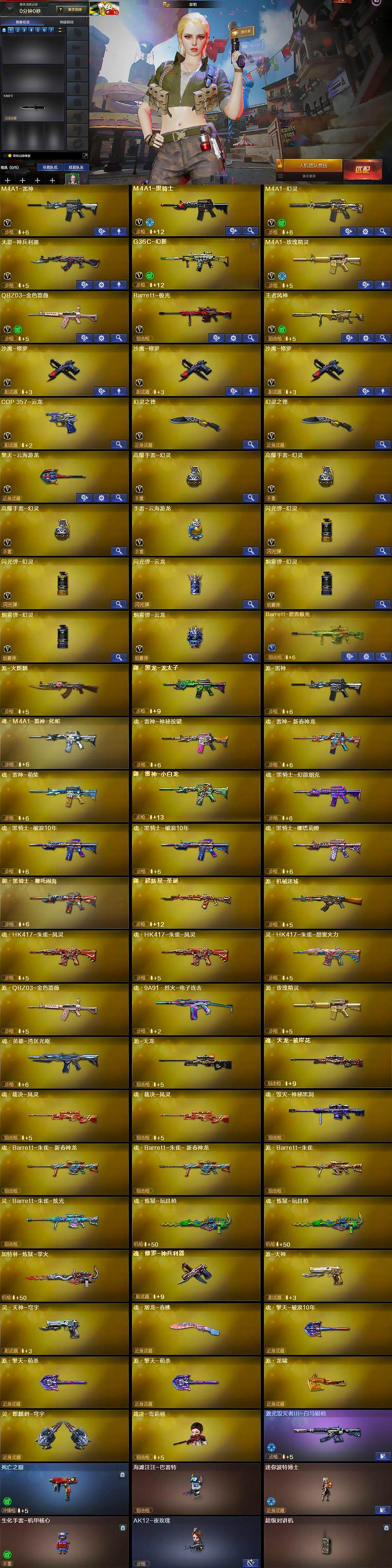【英雄级武器】:M4A1-雷神,M4A1-黑骑士,M4A1-幻灵,无影-神兵利器,G36C-幻影,M4A1-玫瑰精灵,QBZ03-金色蔷薇,Barrett-极光,王者风神-觉醒版,沙鹰-修罗*3,COP 357-云龙,幻灵之锋*2,擎天-云海游龙,高爆手雷-幻灵*3,手雷-云海游龙,闪光弹-幻灵*2,闪光弹-云龙,烟雾弹-幻灵*2,烟雾弹-云龙,Barrett-碧霄极光