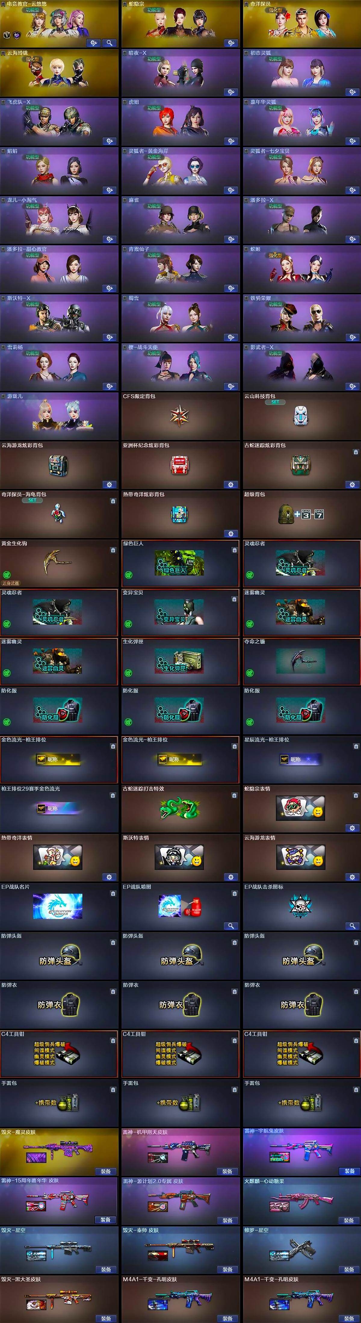 【道具】:CFS限定背包,云山科技背包,云海游龙炫彩背包,亚洲杯纪念炫彩背包,古蛇迷踪炫彩背包,奇洋探员-海龟背包,热带奇洋炫彩背包,超级背包,黄金生化钩,绿色巨人,灵魂忍者*2,变异宝贝,迷雾幽灵*2,生化弹匣,夺命之镰,防化服*3,金色流光-枪王排位*2,星辰