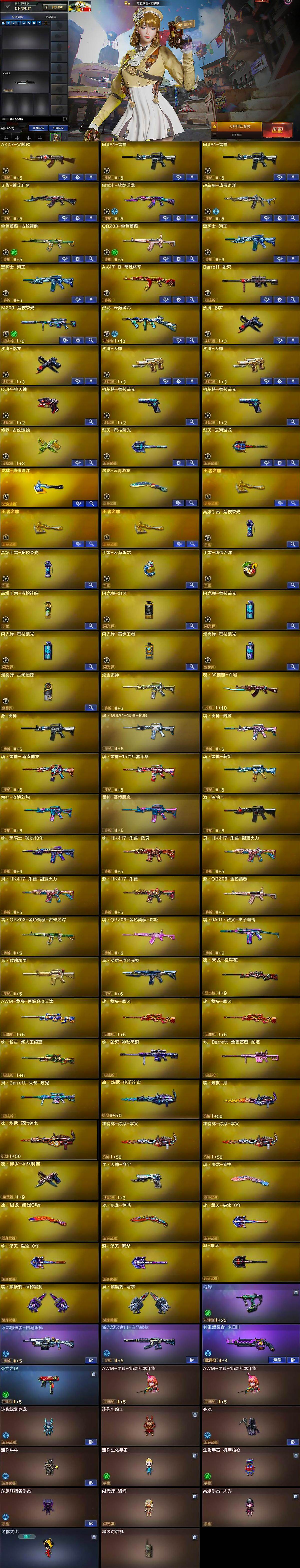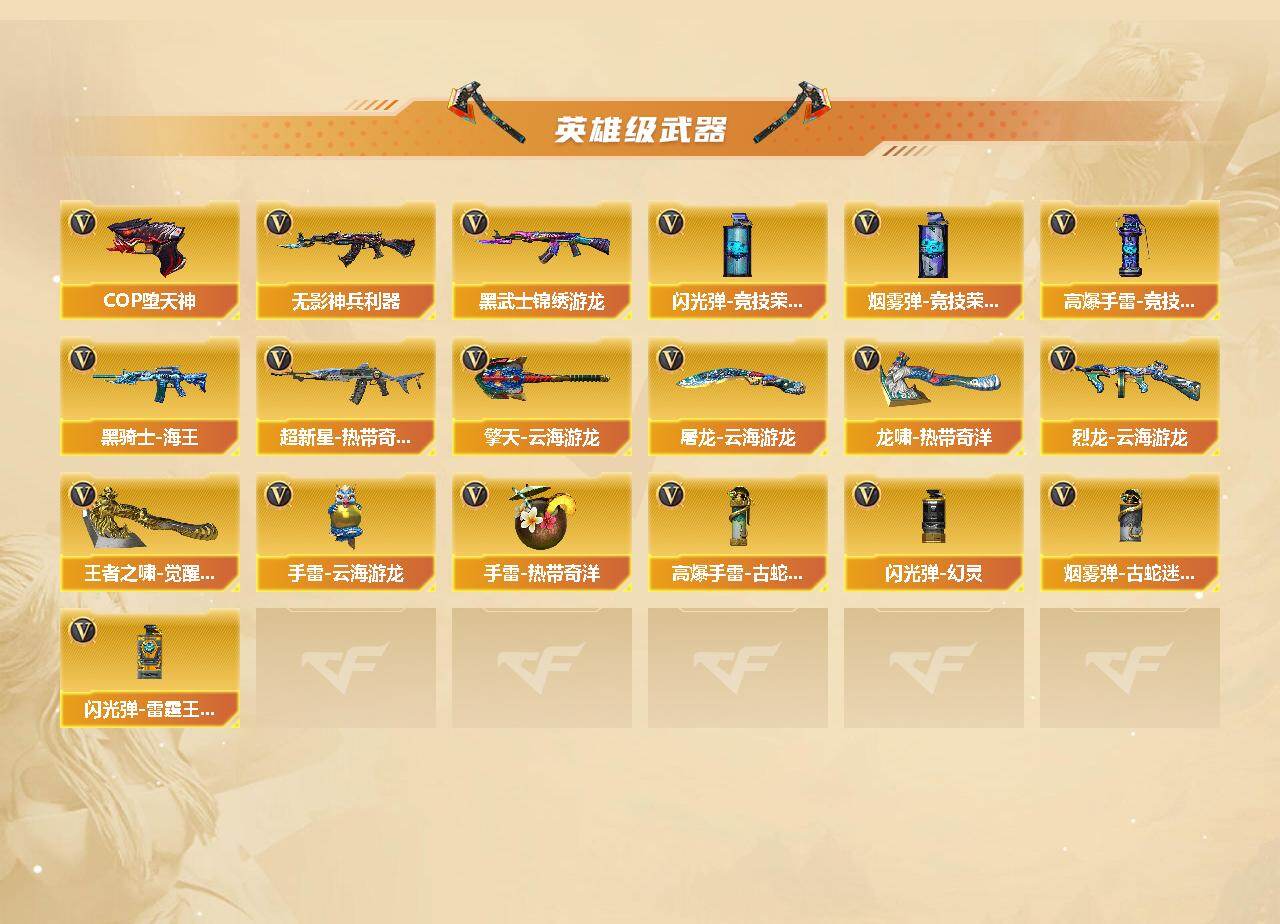 【英雄级武器】:AK47-火麒麟,M4A1-雷神*2,无影-神兵利器,黑武士-锦绣游龙,超新星-热带奇洋,金色蔷薇-古蛇迷踪,QBZ03-金色蔷薇,黑骑士-海王*2,AK47-B-常胜将军,Barrett-毁灭,M200-竞技荣光,烈龙-云海游龙,沙鹰-修罗*2,沙鹰-天神*2,COP-堕天神,柯尔特-竞技荣光*2,修罗-古蛇迷踪,擎天-竞技荣光,擎天-云海游龙,龙啸-热带奇洋,屠龙-云海游龙,王者之啸-觉醒版*3,高爆手雷-竞技荣光*2,手雷-云海游龙,手雷-热带奇洋,高爆手雷-古蛇迷踪,闪光弹-幻灵,闪光弹-竞技荣光*2,闪光弹-雷霆王者-觉醒版,烟雾弹-竞技荣光,烟雾弹-古蛇迷踪