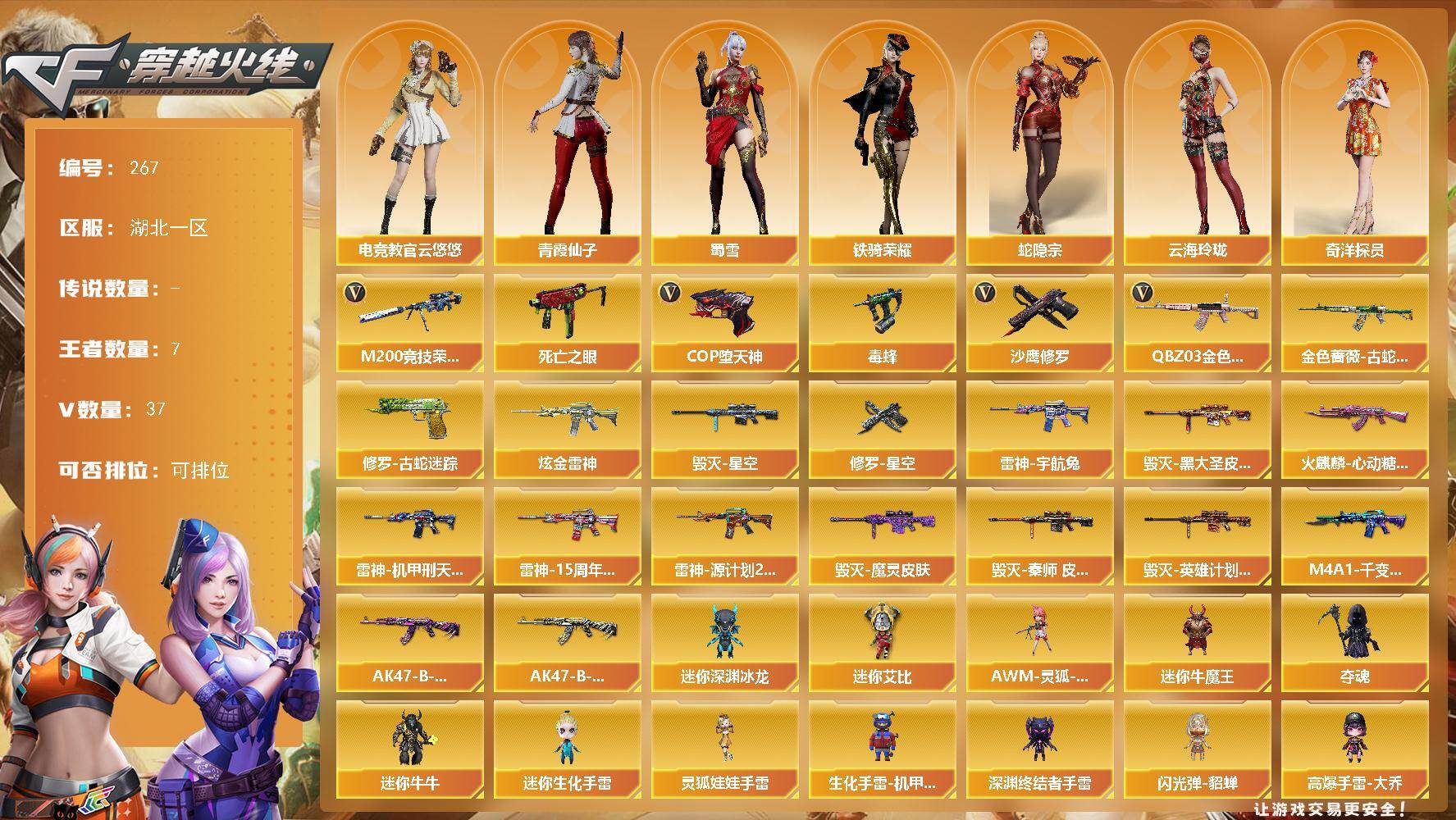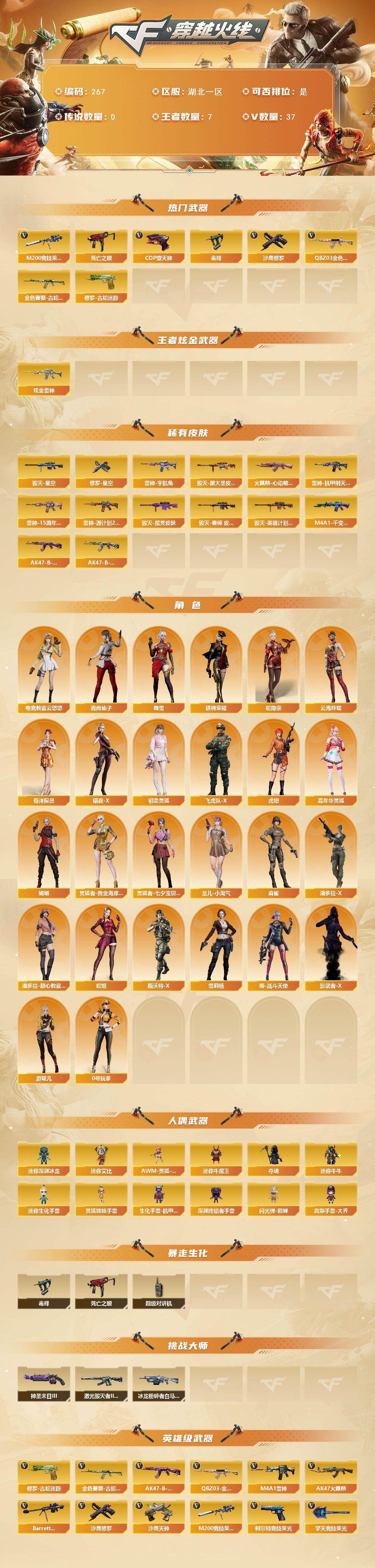 [14169334]湖北一区-37V-7王者-1炫金 【热门武器】:QBZ03-金色蔷薇,金色蔷薇-古蛇迷踪,修罗-古蛇迷踪,M200-竞技荣光,死亡之眼,毒蜂,COP-堕天神,沙鹰-修罗*2 【王者炫金武器】:炫金雷神 【皮肤】:雷神-机甲刑天皮肤,雷神-宇航兔皮肤,雷神-15周年嘉年华 皮肤,雷神-源计划2.0专属 皮肤,火麒麟-心动糖果,毁灭-星空,毁灭-黑大圣皮肤,毁灭-魔灵皮肤,毁灭-秦师 皮肤,毁灭-英雄计划 皮肤,M4A1-千变-孔明皮肤*2,AK47-B-常胜将军-曹操*2,AK47-B-常胜将军-刘备,修罗-星空 【角色】:电竞教官-云悠悠,蛇隐宗,奇洋探员,云海玲珑,暗夜-X,初恋灵狐,飞虎队-X,虎妞,嘉年华灵狐,娟娟,0号玩家,灵狐者-黄金海岸,灵狐者-七夕宝贝,龙儿-小淘气,麻雀,潘多拉-X,潘多拉-甜心教官,青霞仙子,蛇姬,斯沃特-X,蜀雪,铁骑荣耀,雪莉杨,樱-战斗天使,影武者-X,游珑儿 【人偶武器】:AWM-灵狐-15周年嘉年华*2,迷你深渊冰龙,迷你牛魔王,夺魂,迷你牛牛,迷你生化手雷,生化手雷-机甲核心,深渊终结者手雷,闪光弹-貂蝉,高爆手雷-大乔,迷你艾比,灵狐娃娃手雷*2 【暴走生化】:毒蜂,死亡之眼,超级对讲机 【挑战大师】:冰龙粉碎者-白马银枪,激光毁灭者III-白马银枪,神圣爆裂者-末日III 【英雄级武器】:AK47-火麒麟,M4A1-雷神*2,无影-神兵利器,黑武士-锦绣游龙,超新星-热带奇洋,金色蔷薇-古蛇迷踪,QBZ03-金色蔷薇,黑骑士-海王*2,AK47-B-常胜将军,Barrett-毁灭,M200-竞技荣光,烈龙-云海游龙,沙鹰-修罗*2,沙鹰-天神*2,COP-堕天神,柯尔特-竞技荣光*2,修罗-古蛇迷踪,擎天-竞技荣光,擎天-云海游龙,龙啸-热带奇洋,屠龙-云海游龙,王者之啸-觉醒版*3,高爆手雷-竞技荣光*2,手雷-云海游龙,手雷-热带奇洋,高爆手雷-古蛇迷踪,闪光弹-幻灵,闪光弹-竞技荣光*2,闪光弹-雷霆王者-觉醒版,烟雾弹-竞技荣光,烟雾弹-古蛇迷踪 【道具】:CFS限定背包,云山科技背包,云海游龙炫彩背包,亚洲杯纪念炫彩背包,古蛇迷踪炫彩背包,奇洋探员-海龟背包,热带奇洋炫彩背包,超级背包,黄金生化钩,绿色巨人,灵魂忍者*2,变异宝贝,迷雾幽灵*2,生化弹匣,夺命之镰,防化服*3,金色流光-枪王排位*2,星辰