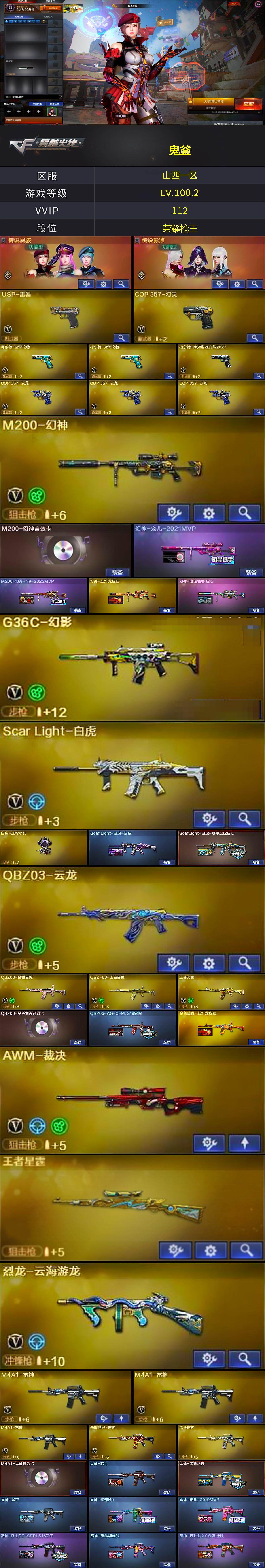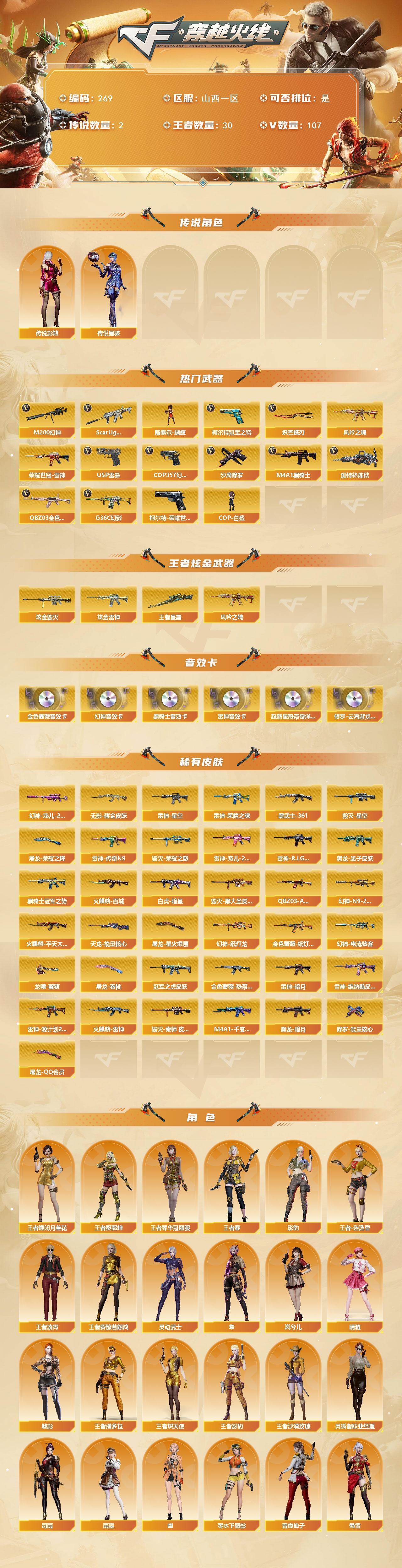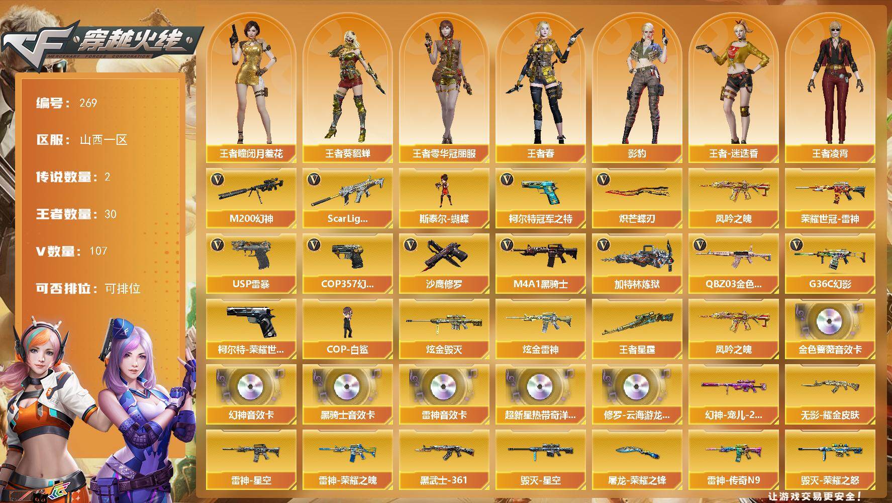 [14169988]山西一区-107V-30王者-3炫金 【传说角色】:传说星骇,传说影煞 【热门武器】:G36C-幻影,QBZ03-金色蔷薇,Scar Light-白虎,M200-幻神,柯尔特-荣耀世冠白鲨2023,凤吟之魄,荣耀世冠-雷神,柯尔特-冠军之特*2,M4A1-黑骑士,加特林-炼狱,斯泰尔-蝴蝶,COP-白鲨,USP-雷暴,COP 357-幻灵,沙鹰-修罗*5,炽芒蝶刃 【王者炫金武器】:凤吟之魄,王者星霆,炫金雷神,炫金毁灭*2 【音效卡】:修罗-云海游龙音效卡,AN94-超新星-热带奇洋音效卡,M200-幻神音效卡,M4A1-雷神音效卡,M4A1-黑骑士音效卡,QBZ03-金色蔷薇音效卡 【皮肤】:幻神-宠儿-2021MVP,M200-幻神-N9-2022MVP,幻神-纸灯龙皮肤,幻神-电流骇客 皮肤,Scar Light-白虎-暗星,ScarLight-白虎-冠军之虎皮肤,QBZ03-AG-CFPLS19冠军,金色蔷薇-纸灯龙皮肤,金色蔷薇-热带奇洋 皮肤,雷神-暗月,雷神-荣耀之魄,雷神-星空,雷神-传奇N9,雷神-宠儿-2019MVP,雷神-R.LGD-CFPLS18冠军,雷神-维纳斯皮肤,雷神-源计划2.0专属 皮肤,火麒麟-雷神,火麒麟-平天大圣,火麒麟-百城,毁灭-荣耀之怒,毁灭-星空,毁灭-黑大圣皮肤,毁灭-秦师 皮肤,M4A1-千变-孔明皮肤,黑龙-暗月,黑龙-墨子皮肤,黑骑士-冠军之势,无影耀金皮肤,AK47-黑武士-361,天龙-能量核心,修罗-能量核心,屠龙-荣耀之锋*3,屠龙-QQ会员,屠龙-星火燎原,屠龙-春桃 皮肤,龙啸-醒狮 皮肤 【角色】:魅影,影豹,晴雅,岚兮儿,隼,雨墨,司雨,华,王者-瞳-闭月羞花,王者零-华冠丽服,王者-葵-貂蝉,王者葵-惊若翩鸿,王者春,王者凌霄,王者影豹,王者-迷迭香,王者潘多拉,王者炽天使,王者沙漠玫瑰,王者空,奇洋探员,乔伊教练,云海玲珑,空,暗夜-X,北极狐-X,电竞少女,飞虎队-X,风暴女,虎妞,嘉年华灵狐,荆棘玫瑰,娟娟,兰-海滩派对,兰-空鹰,兰-新年限定,猎狐者-追月,0号玩家,灵动武士,零-水下丽影,灵狐-花神,灵狐者-X,灵狐者-黄金海岸,灵狐者-职业经理,流浪蔷薇,龙儿-小淘气,麻雀,曼陀罗-X,曼陀罗-礼服,萌儿,娜塔莉娅,潘多拉-X,潜龙队-X,青霞仙子,赛斯-X,斯沃特-X,蜀雪,