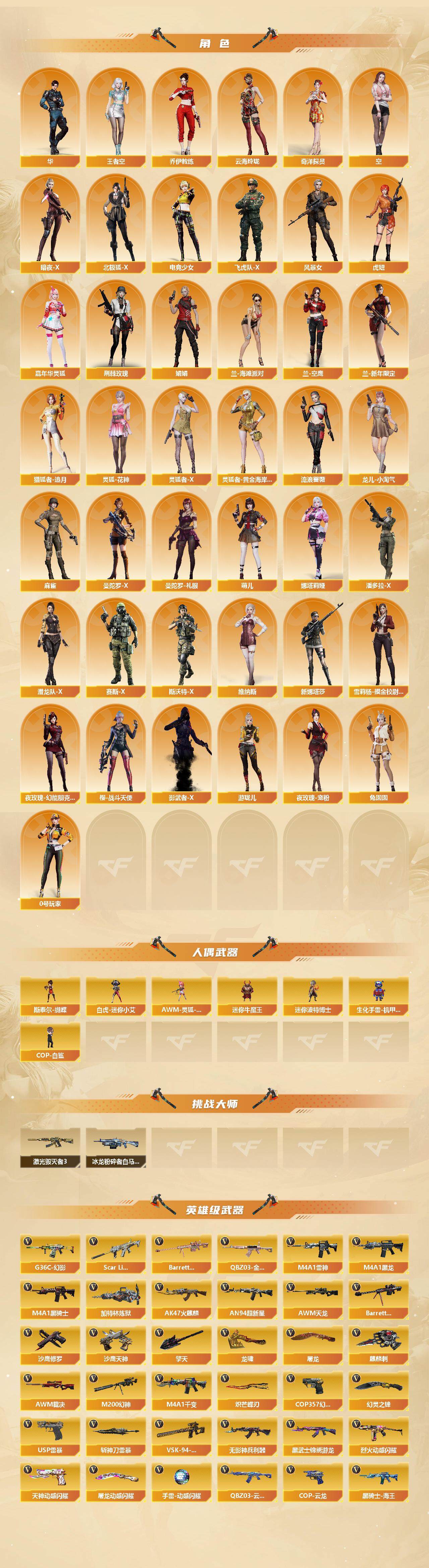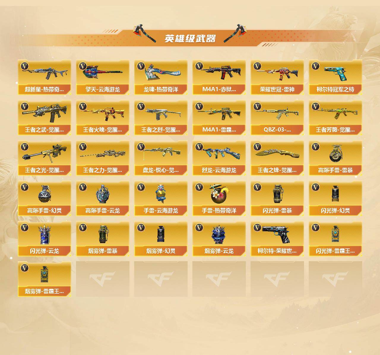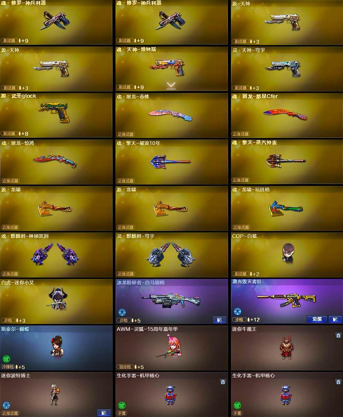 【皮肤】:幻神-宠儿-2021MVP,M200-幻神-N9-2022MVP,幻神-纸灯龙皮肤,幻神-电流骇客 皮肤,Scar Light-白虎-暗星,ScarLight-白虎-冠军之虎皮肤,QBZ03-AG-CFPLS19冠军,金色蔷薇-纸灯龙皮肤,金色蔷薇-热带奇洋 皮肤,雷神-暗月,雷神-荣耀之魄,雷神-星空,雷神-传奇N9,雷神-宠儿-2019MVP,雷神-R.LGD-CFPLS18冠军,雷神-维纳斯皮肤,雷神-源计划2.0专属 皮肤,火麒麟-雷神,火麒麟-平天大圣,火麒麟-百城,毁灭-荣耀之怒,毁灭-星空,毁灭-黑大圣皮肤,毁灭-秦师 皮肤,M4A1-千变-孔明皮肤,黑龙-暗月,黑龙-墨子皮肤,黑骑士-冠军之势,无影耀金皮肤,AK47-黑武士-361,天龙-能量核心,修罗-能量核心,屠龙-荣耀之锋*3,屠龙-QQ会员,屠龙-星火燎原,屠龙-春桃 皮肤,龙啸-醒狮 皮肤