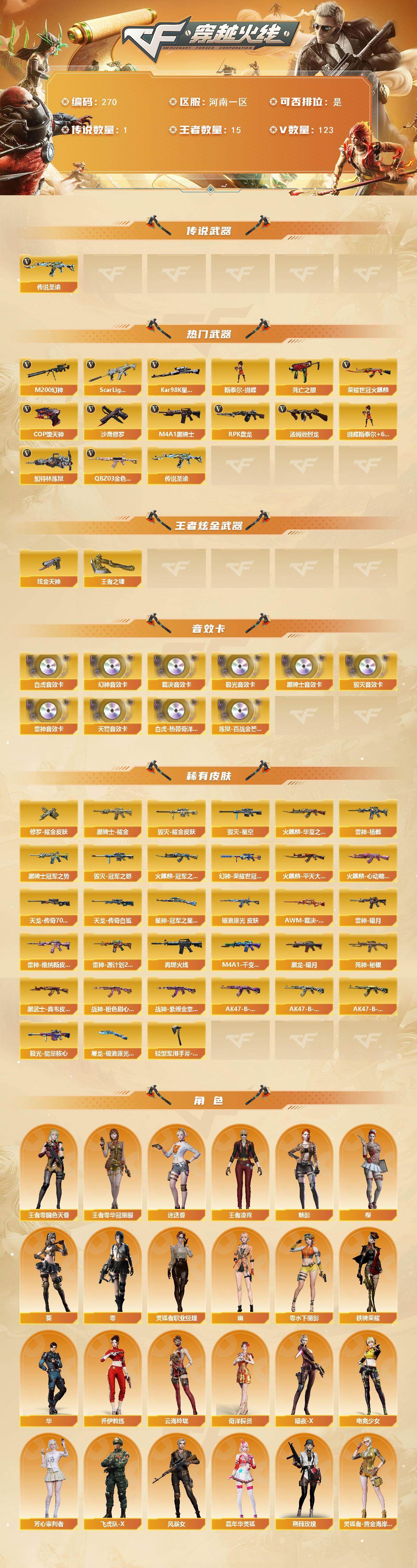 [14170432]河南一区-123V-15王者-1炫金 【传说武器】:传说圣谕 【热门武器】:传说圣谕,QBZ03-金色蔷薇,Scar Light-白虎,M200-幻神,死亡之眼,荣耀世冠-火麒麟,Kar98K-星神,M4A1-黑骑士,汤姆逊-烈龙*6,RPK-盘龙*4,加特林-炼狱,斯泰尔-蝴蝶,COP-堕天神,沙鹰-修罗*4 【王者炫金武器】:王者之啸,炫金天神 【音效卡】:Scar Light-白虎-热带奇洋音效卡,M200-幻神音效卡,M4A1-雷神音效卡,M4A1-黑骑士音效卡,Barrett-毁灭音效卡,Barrett-极光音效卡,AWM-裁决音效卡,Scar Light-白虎音效卡,QBZ03-天罚音效卡,炼狱-百战金芒-庆典舞曲音效卡 【皮肤】:M200-幻神-荣耀世冠白鲨,金色蔷薇-破浪逐光 皮肤,AWM-裁决-凤灵皮肤,Kar98K-星神-冠军之星皮肤,雷神-暗月,雷神-杨戬,雷神-维纳斯皮肤,雷神-源计划2.0专属 皮肤,M4A1-再燃火线,火麒麟-冠军之心,火麒麟-华夏之心,火麒麟-平天大圣,火麒麟-心动糖果,毁灭耀金皮肤,毁灭-星空,毁灭-冠军之怒,M4A1-千变-孔明皮肤,黑龙-暗月,黑骑士耀金皮肤,黑骑士-冠军之势,死神-秘银,黑武士-典韦皮肤,战神-粉色甜心皮肤,战神-紫绶金章皮肤,AK47-B-常胜将军-曹操*2,AK47-B-常胜将军-刘备*3,AK47-B-常胜将军-孙权,AWM-天龙-传奇70KG,AWM-天龙-传奇白鲨,极光-能量核心,修罗耀金皮肤,屠龙-破浪逐光 皮肤,轻型军用手斧-再燃火线 【角色】:零,葵,樱,魅影,迷迭香,华,王者零-华冠丽服,王者-零-国色天香,王者凌霄,奇洋探员,乔伊教练,云海玲珑,暗夜-X,电竞少女,芳心审判者,飞虎队-X,风暴女,嘉年华灵狐,荆棘玫瑰,零-水下丽影,灵狐者-黄金海岸,灵狐者-职业经理,流浪蔷薇,麻雀,曼陀罗-X,潘多拉-X,斯沃特-X,铁骑荣耀,维纳斯,新娜塔莎,雪莉杨-摸金校尉,幽,游珑儿 【人偶武器】:天龙-曼陀罗,M4A1-雷神-精英刀锋*2,斯泰尔-蝴蝶,巴雷特-零-水下丽影,迷你深渊冰龙*2,迷你裂空之翼*7,迷你波特博士*4,迷你曼提柯尔,迷你牛牛*3,迷你火种*6,迷你生化手雷,深渊终结者手雷*2,闪光弹-小乔,闪光弹-貂蝉,高爆手雷-大乔 【暴走生化】:黑龙吞噬者,双面神,死亡