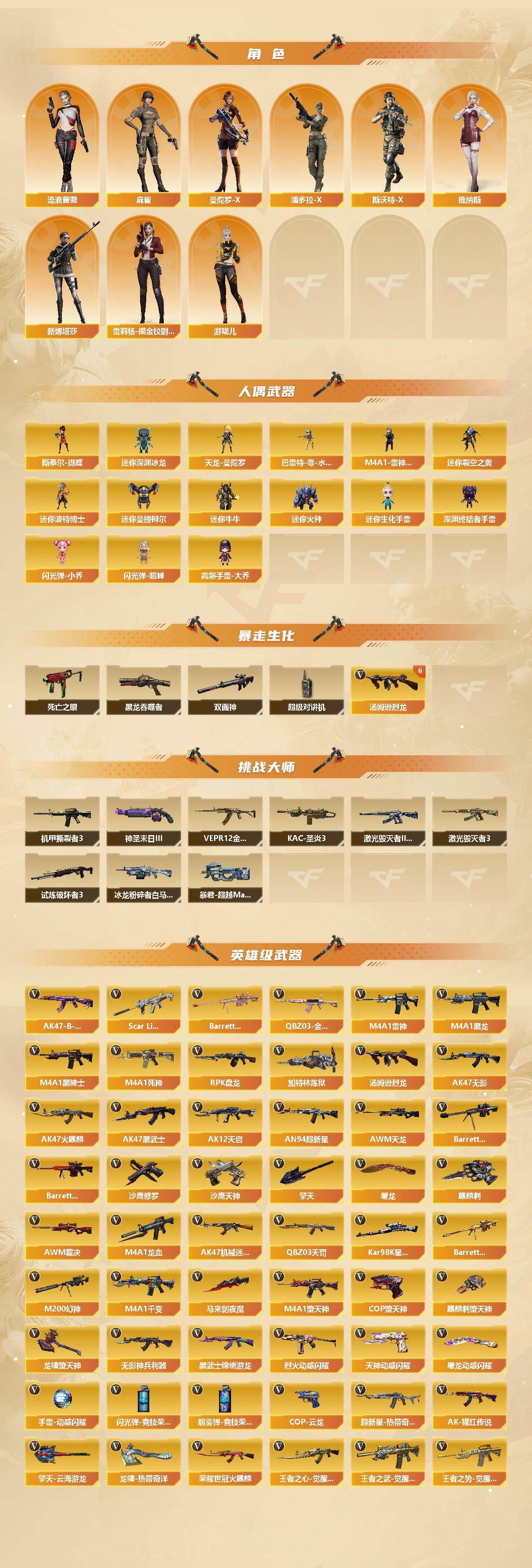 【角色】:零,葵,樱,魅影,迷迭香,华,王者零-华冠丽服,王者-零-国色天香,王者凌霄,奇洋探员,乔伊教练,云海玲珑,暗夜-X,电竞少女,芳心审判者,飞虎队-X,风暴女,嘉年华灵狐,荆棘玫瑰,零-水下丽影,灵狐者-黄金海岸,灵狐者-职业经理,流浪蔷薇,麻雀,曼陀罗-X,潘多拉-X,斯沃特-X,铁骑荣耀,维纳斯,新娜塔莎,雪莉杨-摸金校尉,幽,游珑儿