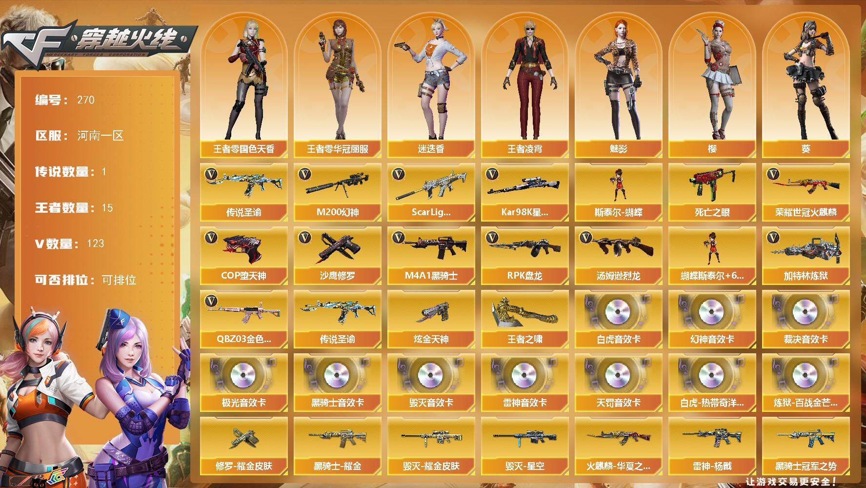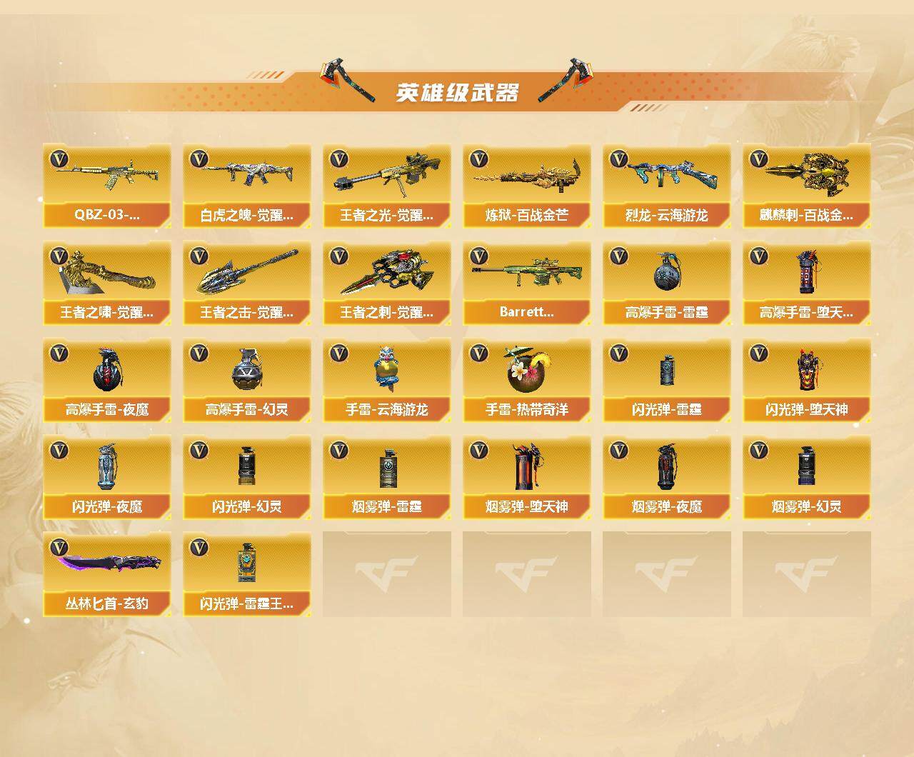 - [12710693]湖北一区-65V-5王者-0炫金 【热门武器】:G36C-幻影,QBZ03-金色蔷薇,M4A1-青龙,M200-幻神,金色蔷薇-古蛇迷踪,修罗-古蛇迷踪,死亡之眼,Kar98K-星神,沙鹰-修罗*5,Knife-冠军之刃*2 【音效卡】:Barrett-极光音效卡,Kar98K-星神音效卡 【稀有皮肤】:幻神-冠军之幻,幻神-宠儿-2021MVP,M200-幻神-荣耀世冠白鲨,幻神-电流骇客 皮肤,幻神-星火小队签名臻藏版 皮肤,星神-璀璨皮肤,QBZ03-荣耀世冠白鲨,QBZ03-巅峰荣耀皮肤,雷神-耀金皮肤,雷神-荣耀世冠AG,火麒麟-华夏之心,黑骑士-AG-S4冠军典藏,毁灭-CFS2020,毁灭-战神张飞,修罗-冠军之魂,屠龙-荣耀世冠AG,屠龙-春桃 皮肤 【角色】:王者炫,荒漠琉璃,灵动武士,暗黑审判 【人偶武器】:迷你牛牛*2,灵狐娃娃手雷*2,生化手雷-机甲核心 【暴走生化】:死亡之眼,超级对讲机 【英雄级武器】:柯尔特-竞技荣光,烟雾弹-竞技荣光*3,闪光弹-竞技荣光*3,幻灵之锋*2,G36C-幻影,QBZ03-金色蔷薇,M4A1-青龙,金色蔷薇-古蛇迷踪,M4A1-雷神,AK47-火麒麟,Barrett-毁灭,Barrett-极光,Kar98K-星神,M200-幻神,黑武士-锦绣游龙,修罗-古蛇迷踪,沙鹰-修罗*5,麒麟刺,屠龙*4 【特殊枪械】: