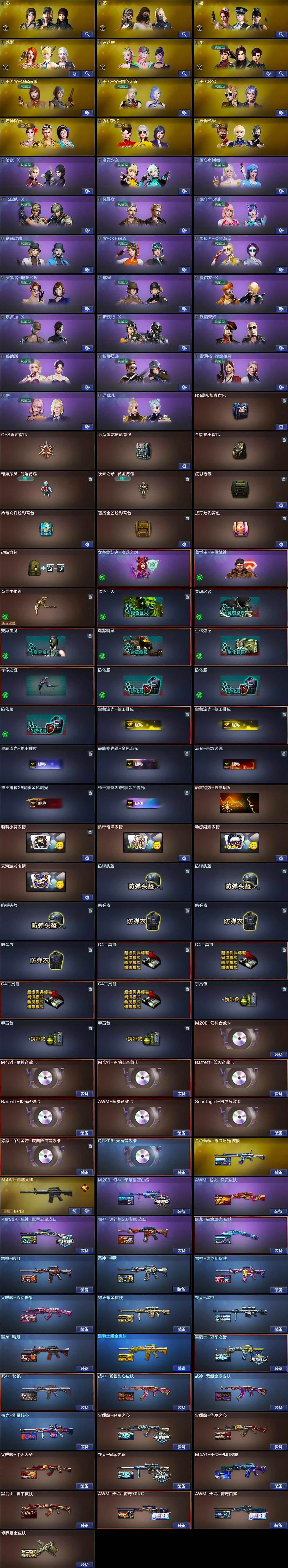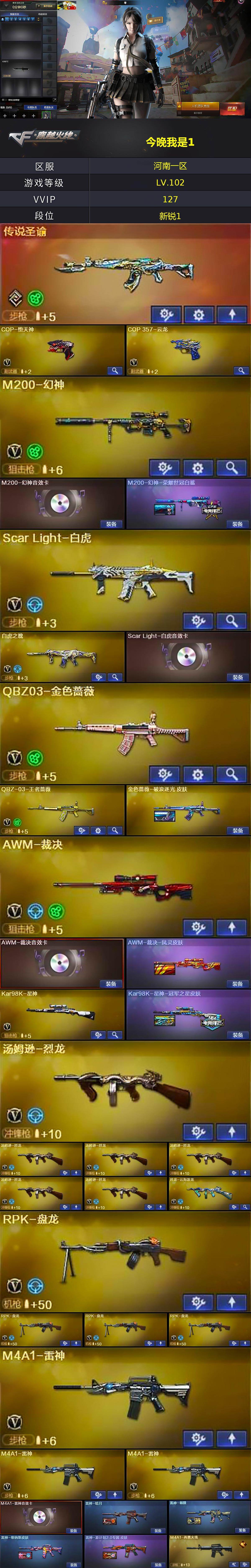 【热门武器】:传说圣谕,QBZ03-金色蔷薇,Scar Light-白虎,M200-幻神,死亡之眼,荣耀世冠-火麒麟,Kar98K-星神,M4A1-黑骑士,汤姆逊-烈龙*6,RPK-盘龙*4,加特林-炼狱,斯泰尔-蝴蝶,COP-堕天神,沙鹰-修罗*4