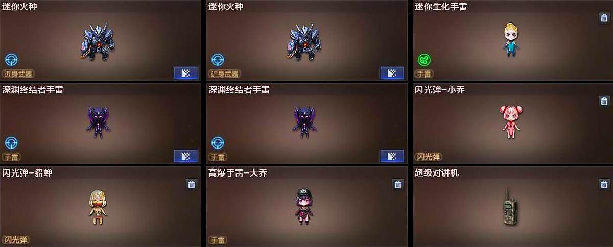 【人偶武器】:天龙-曼陀罗,M4A1-雷神-精英刀锋*2,斯泰尔-蝴蝶,巴雷特-零-水下丽影,迷你深渊冰龙*2,迷你裂空之翼*7,迷你波特博士*4,迷你曼提柯尔,迷你牛牛*3,迷你火种*6,迷你生化手雷,深渊终结者手雷*2,闪光弹-小乔,闪光弹-貂蝉,高爆手雷-大乔