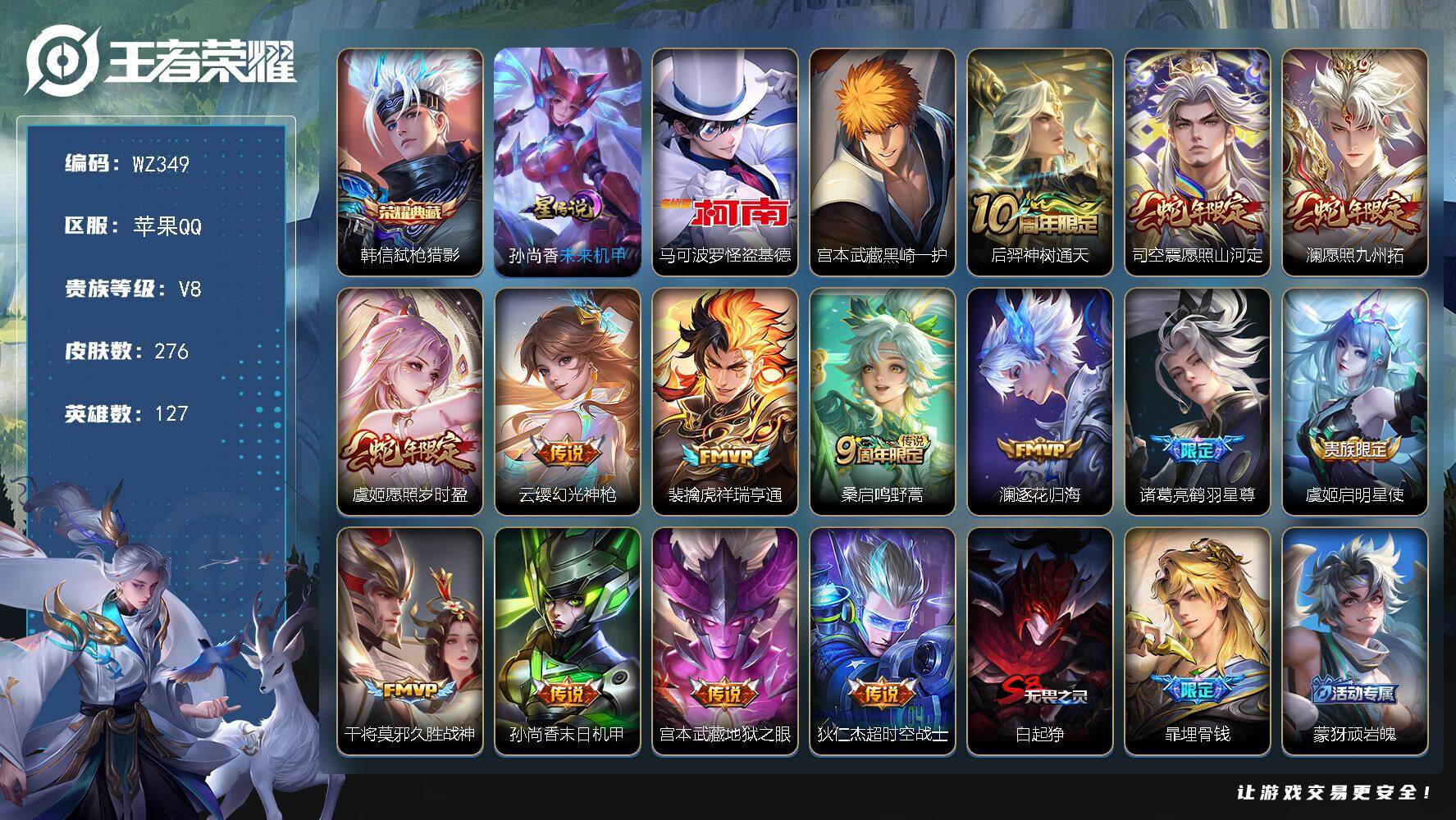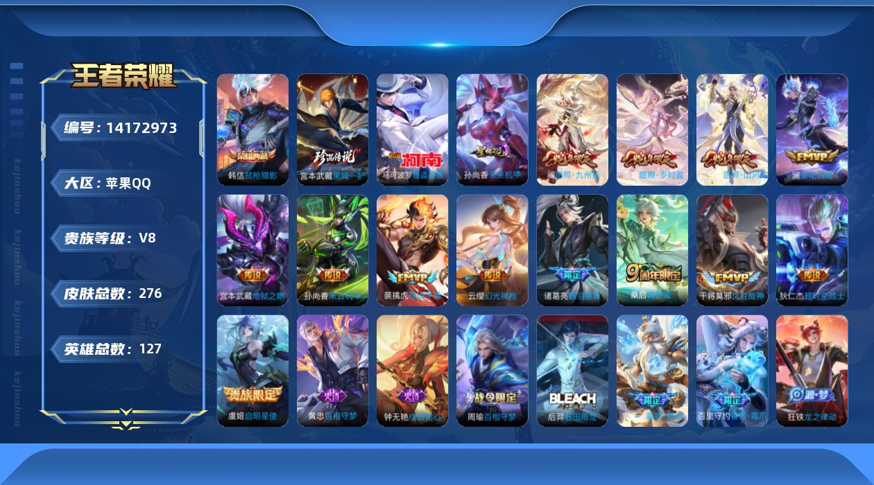[14172973]苹果Q-276皮肤-1典藏皮肤-2珍品传说-14传说-75史诗 【英雄全皮】:苍全皮,司空震全皮,空空儿全皮 【荣耀典藏】:韩信弑枪猎影 【珍品传说】:马可波罗怪盗基德,宫本武藏黑崎一护 【传说皮肤】:后羿神树通天,司空震愿照山河定,澜愿照九州拓,虞姬愿照岁时盈,云缨幻光神枪,裴擒虎祥瑞亨通,桑启鸣野蒿,澜逐花归海,诸葛亮鹤羽星尊,虞姬启明星使,干将莫邪久胜战神,孙尚香末日机甲,宫本武藏地狱之眼,狄仁杰超时空战士 【限定皮肤】:白起狰,暃埋骨钱,蒙犽顽岩魄,蔡文姬夏日便利店,大乔绒语心约,虞姬夏日便利店,姜子牙天穹之誓,李白谪仙醉月,狄仁杰阴阳师,赵云皇家上将,赵云引擎之心,嬴政优雅恋人,嬴政白昼王子,鲁班七号狮舞东方,吕布猎兽之王,吕布御风骁将,典韦蓝屏警告,狄仁杰魔术师,狄仁杰万华元夜,项羽海滩派对,亚瑟潮玩骑士王,孙悟空至尊宝,孙悟空大圣娶亲,孙悟空孙行者,牛魔御旌,虞姬启明星使,钟馗神迹守卫,女娲朔望之晖,太乙真人饕餮,鬼谷子原初探秘者,诸葛亮鹤羽星尊,弈星混沌棋,沈梦溪大漠名商,明世隐疑决卦,裴擒虎李小龙,狂铁御狮,米莱狄御霄,云中君纤云弄巧,盾山御銮,嫦娥拒霜思,鲁班大师探海日志,艾琳流音漫舞,司空震地狱燃心,阿古朵江河有灵,张良古海寻踪,蒙犽百解令,高渐离燃音魔法,妲己灵卜魔法,鬼谷子天穹祈灯,伽罗琥珀纪元,刘邦剑破天穹,程咬金群星魔术团,镜青焰无极,项羽苍威无极,周瑜熔金海岸 【年限皮肤】:吕布御风骁将 【赛季限定】:白起狰,狄仁杰万华元夜,张良古海寻踪,牛魔御旌,太乙真人饕餮,鬼谷子原初探秘者,弈星混沌棋,沈梦溪大漠名商,明世隐疑决卦,狂铁御狮,米莱狄御霄,盾山御銮,鲁班大师探海日志,鬼谷子天穹祈灯,刘邦剑破天穹,姜子牙天穹之誓 【战令限定】:蔡文姬夏日便利店,虞姬夏日便利店,嬴政白昼王子,鲁班七号狮舞东方,吕布猎兽之王,典韦蓝屏警告,艾琳流音漫舞,亚瑟潮玩骑士王,钟馗神迹守卫,女娲朔望之晖,司空震地狱燃心,高渐离燃音魔法,妲己灵卜魔法,镜青焰无极,项羽苍威无极 【史诗皮肤】:项羽苍穹之光,露娜紫霞仙子,赵云皇家上将,赵云未来纪元,甄姬冰雪圆舞曲,王昭君偶像歌手,狄仁杰魔术师,廉颇地狱岩魂,宫本武藏鬼剑武藏,孙尚香水果甜心,嬴政优雅恋人,妲己女仆咖啡,墨子金属风暴,曹操幽灵船长,李白千年之狐,韩信白龙吟,孙悟空至尊宝,赵云引擎之心,花木兰水晶猎龙