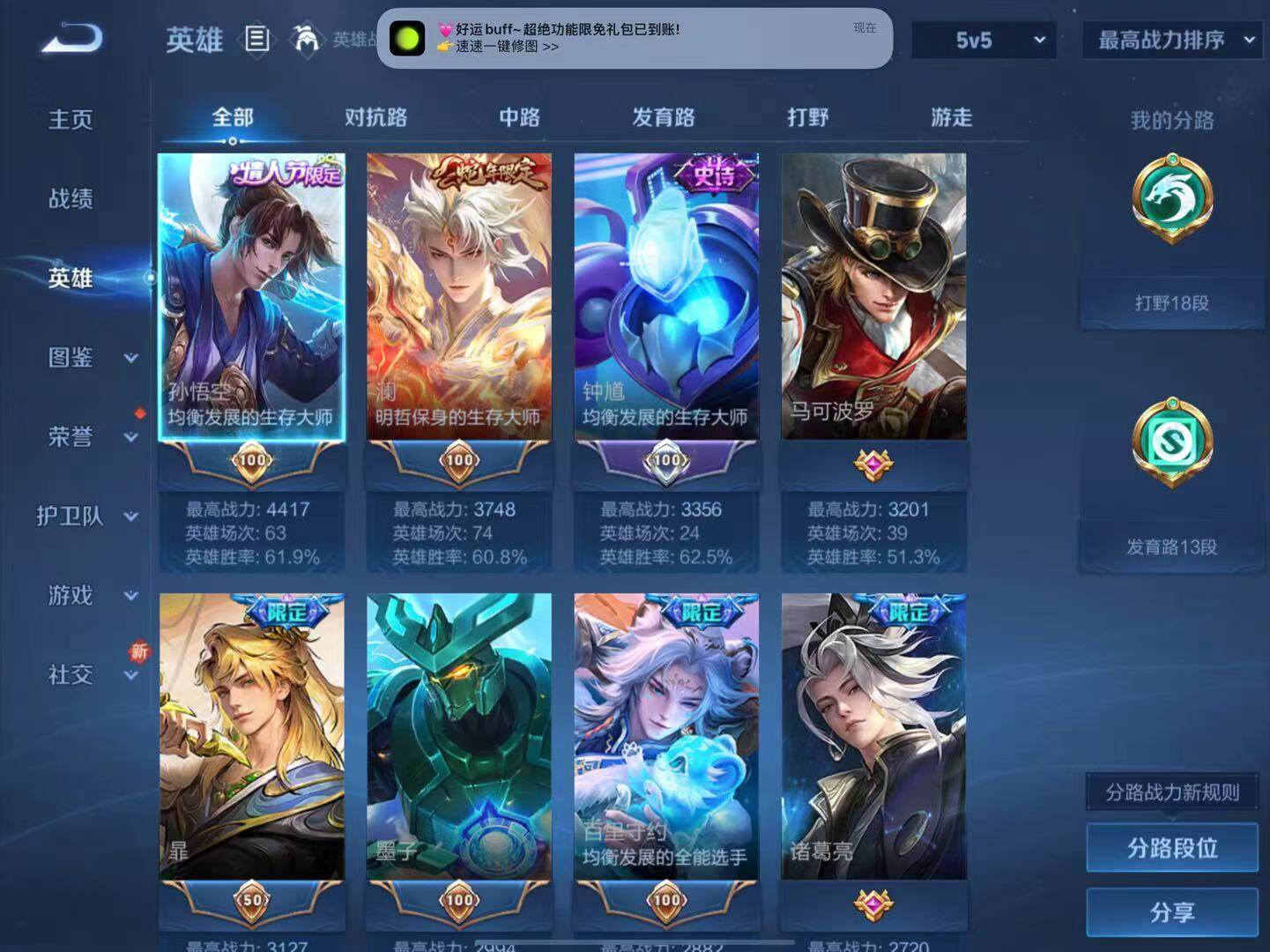 - [11599296]V6 6传说 123英雄 137皮肤 可修改实名 优质装备:冠军飞将,久胜战神,一念神魔,零号·赤焰 珍宝阁皮:蔷薇恋人,女武神 限定皮:鸣野蒿,五谷丰年,御风骁将(吕布年限),默契交锋-兰陵王,默契交锋-花木兰 史诗皮:紫霞仙子,黄金分割率,千年之狐,江河有灵,修罗,水果甜心,德古拉伯爵,幽灵船长,鬼剑武藏,缤纷独角兽,乘风破浪,金属风暴,圣诞恋歌,鹰眼统帅,无心