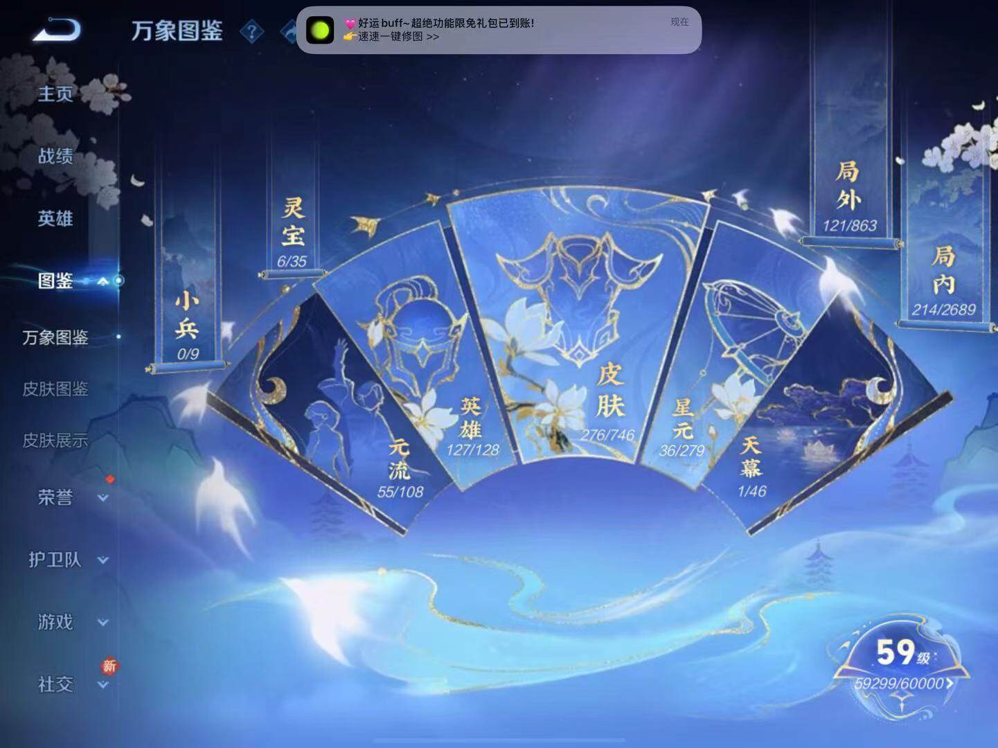 【赛季限定】:白起狰,狄仁杰万华元夜,张良古海寻踪,牛魔御旌,太乙真人饕餮,鬼谷子原初探秘者,弈星混沌棋,沈梦溪大漠名商,明世隐疑决卦,狂铁御狮,米莱狄御霄,盾山御銮,鲁班大师探海日志,鬼谷子天穹祈灯,刘邦剑破天穹,姜子牙天穹之誓