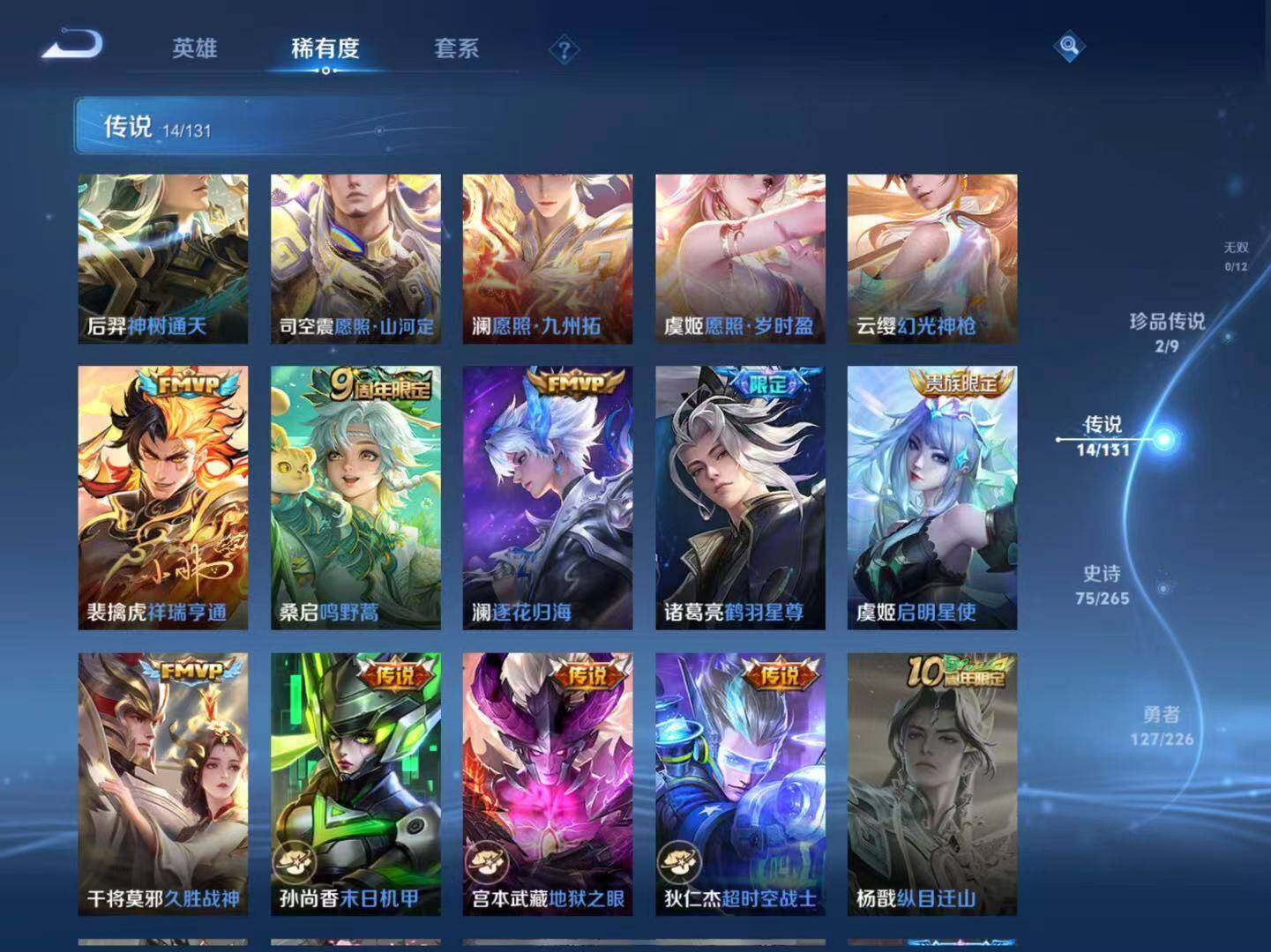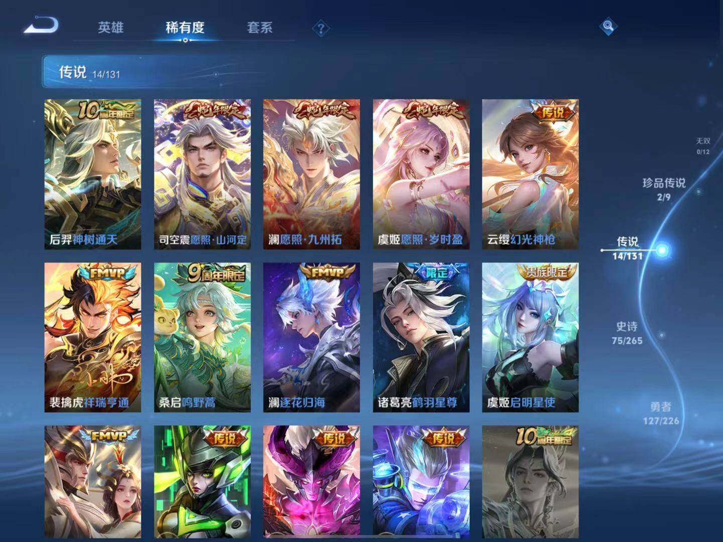 【传说皮肤】:后羿神树通天,司空震愿照山河定,澜愿照九州拓,虞姬愿照岁时盈,云缨幻光神枪,裴擒虎祥瑞亨通,桑启鸣野蒿,澜逐花归海,诸葛亮鹤羽星尊,虞姬启明星使,干将莫邪久胜战神,孙尚香末日机甲,宫本武藏地狱之眼,狄仁杰超时空战士