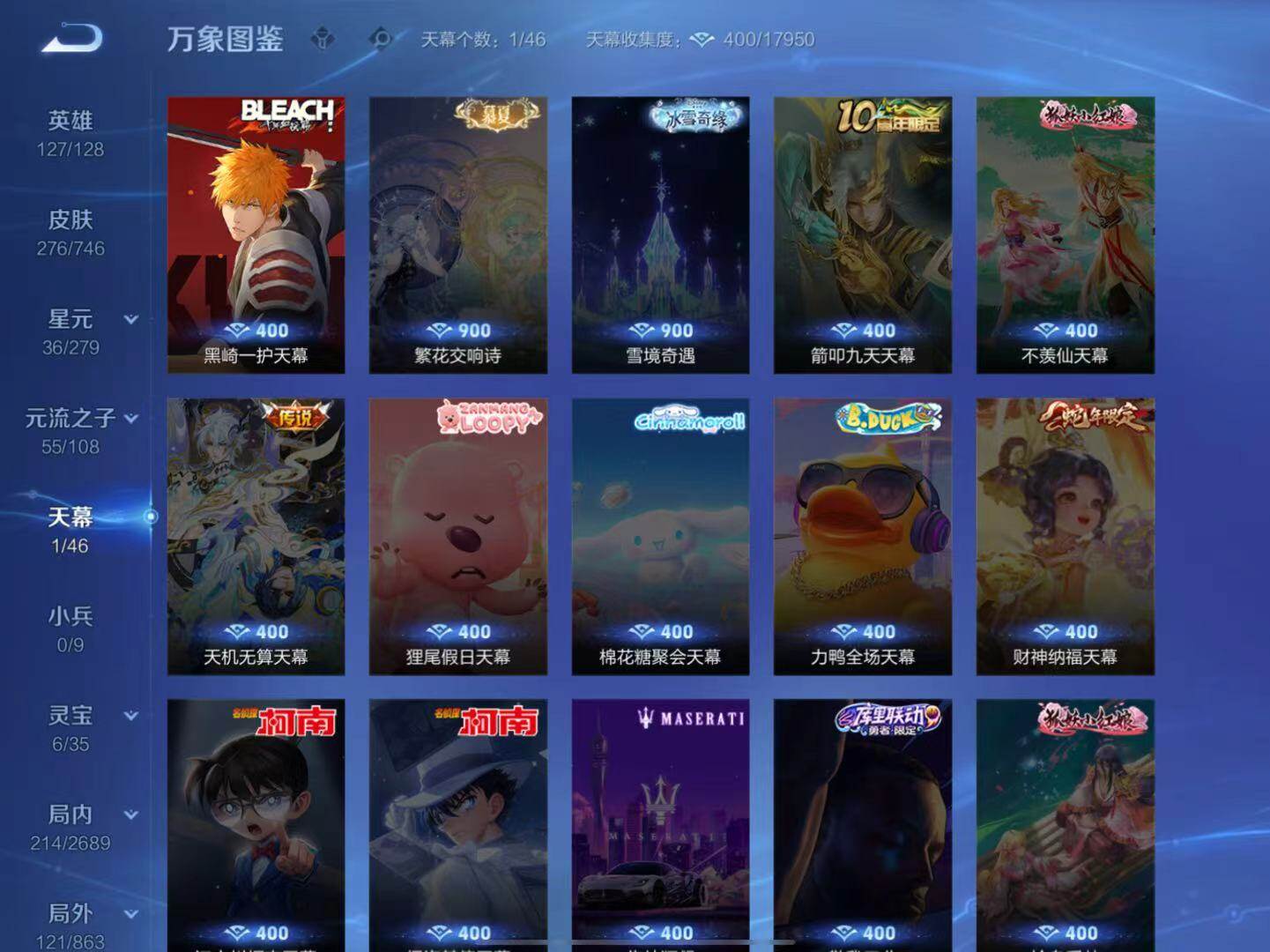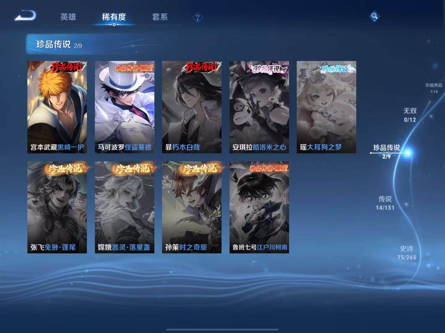 - PX_2109931-Q/非凡王者/138皮肤/124英雄/1典藏/0珍品无双/1无双/2珍品传说/10传说/39史诗/8稀有英雄 【2 珍品传说】怪盗基德 马可波罗,江户川柯南 鲁班七号, 【1 典藏皮肤】星域神启 诸葛亮, 【1 无双皮肤】器灵·螭龙剑 曜, 【10 传说皮肤】无双飞将 马超,浮生妄 夏洛特,地狱之眼 宫本武藏,祈雪灵祝 公孙离,黄金狮子座 达摩,战鼓燎原 典韦,黄金白羊座 张