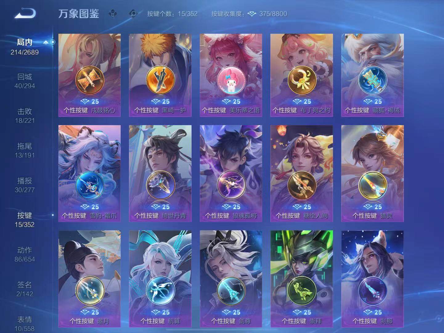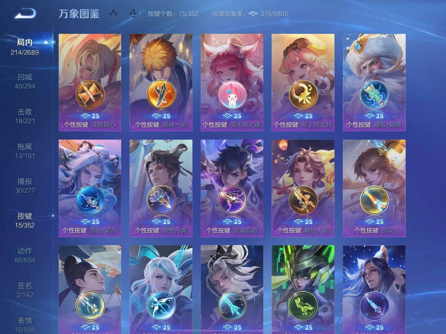 娜可露露晚萤,伽罗箭羽风息,李元芳逐浪之夏,不知火舞魅语,大乔猫狗日记,孙策猫狗日记,阿轲节奏热浪,露娜紫霞仙子,诸葛亮黄金分割率,王昭君偶像歌手,韩信白龙吟,项羽苍穹之光,孙尚香时之恋人,雅典娜冰冠公主,白起星夜王子,程咬金功夫厨神,兰陵王暗隐猎兽者,曹操幽灵船长,宫本武藏鬼剑武藏,司马懿暗渊魔法,钟馗乐园奇幻夜,蔡文姬舞动绿茵,廉颇地狱岩魂,夏侯惇乘风破浪,花木兰水晶猎龙者,铠曙光守护者,墨子金属风暴,百里守约特工魅影,嫦娥拒霜思,李白千年之狐,蒙犽百解令,高渐离燃音魔法,伽罗琥珀纪元,李白谪仙醉月,赵怀真器灵·浮梦炉,亚连糖绘人间,苍狼魂孤将,狄仁杰绮世丹青