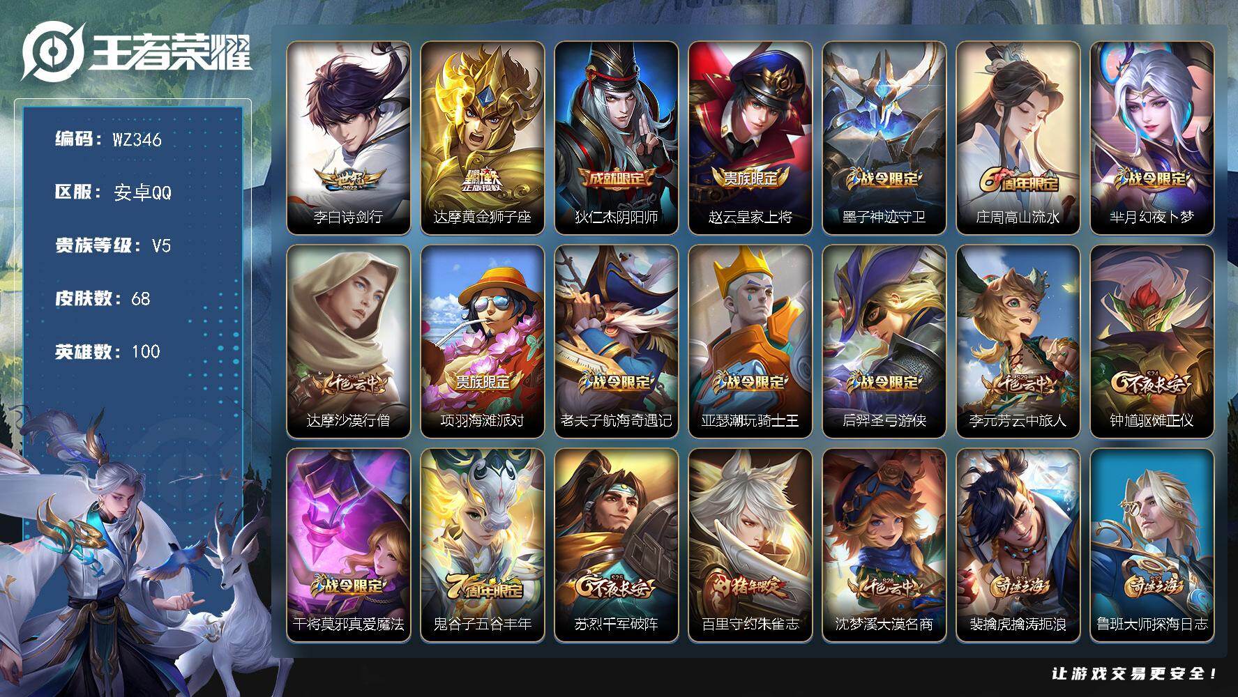 [14175506]安卓Q-68皮肤-2传说-19史诗 【英雄全皮】:孙权全皮 【传说皮肤】:李白诗剑行,达摩黄金狮子座 【限定皮肤】:狄仁杰阴阳师,赵云皇家上将,墨子神迹守卫,庄周高山流水,芈月幻夜卜梦,达摩沙漠行僧,项羽海滩派对,老夫子航海奇遇记,亚瑟潮玩骑士王,后羿圣弓游侠,李元芳云中旅人,钟馗驱傩正仪,干将莫邪真爱魔法,鬼谷子五谷丰年,苏烈千军破阵,百里守约朱雀志,沈梦溪大漠名商,裴擒虎擒涛扼浪,鲁班大师探海日志,桑启海盐诗旅,鬼谷子天穹祈灯 【年限皮肤】:百里守约朱雀志 【赛季限定】:达摩沙漠行僧,李元芳云中旅人,钟馗驱傩正仪,苏烈千军破阵,沈梦溪大漠名商,裴擒虎擒涛扼浪,鲁班大师探海日志,桑启海盐诗旅,鬼谷子天穹祈灯 【战令限定】:墨子神迹守卫,芈月幻夜卜梦,老夫子航海奇遇记,亚瑟潮玩骑士王,后羿圣弓游侠,干将莫邪真爱魔法 【史诗皮肤】:赵云皇家上将,赵云未来纪元,王昭君偶像歌手,宫本武藏鬼剑武藏,孙尚香水果甜心,嬴政摇滚巨星,妲己魅力维加斯,墨子金属风暴,李白千年之狐,吕布末日机甲,夏侯惇乘风破浪,兰陵王暗隐猎兽者,百里守约朱雀志,老夫子航海奇遇记,干将莫邪真爱魔法,庄周高山流水,夏洛特永昼,高渐离天秀音浪,鬼谷子五谷丰年 【其他皮肤】:项羽海滩派对,达摩大发明家,赵云忍炎影,芈月红桃皇后,牛魔西部大镖客,扁鹊化身博士,宫本武藏未来纪元,亚瑟死亡骑士,达摩拳王,花木兰兔女郎,宫本武藏万象初新,后羿阿尔法小队,狄仁杰阴阳师,狂铁命运角斗场,孙尚香沉稳之力,诸葛亮掌控之力,吕布野性能量,亚瑟潮玩骑士王,钟馗驱傩正仪,墨子神迹守卫,鲁班大师乓乓大师,苏烈千军破阵,后羿圣弓游侠,达摩沙漠行僧,芈月幻夜卜梦,沈梦溪大漠名商,蒙恬蔚蓝守将,李元芳云中旅人,桑启海盐诗旅,猪八戒潮玩探月行,裴擒虎擒涛扼浪,太乙真人劲辣红锅,鲁班大师探海日志,鬼谷子天穹祈灯,西施雪境奇遇,孙权径山谋武,艾琳鹤鸣心笺,花木兰剑舞者,太乙真人圆桌骑士,东皇太一东海龙王,干将莫邪第七人偶,百里守约绝影神枪,裴擒虎街头旋风,元歌午夜歌剧院,李信灼热之刃,云中君荷鲁斯之眼,云缨赤焰之缨 【营地ID】:1577057927