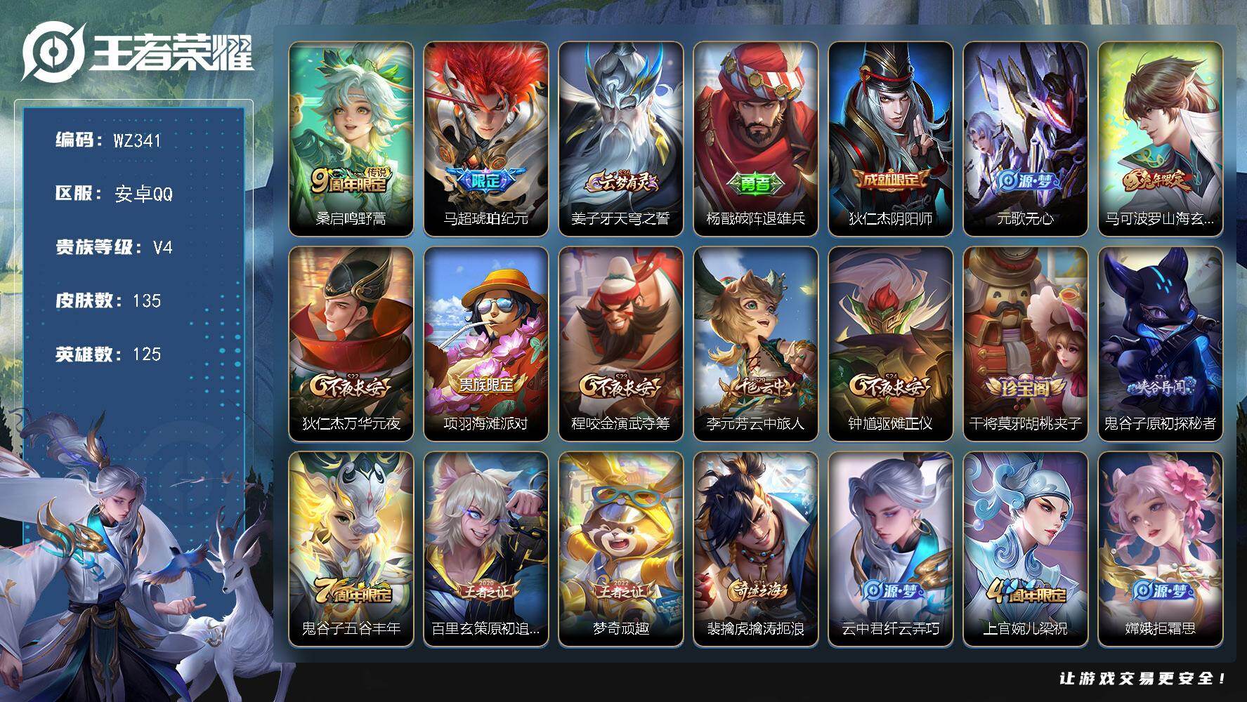 - [15206625]【店主推荐捡漏号!可直接换绑】,安卓Q-V8-最强王者段位-125英雄-263皮肤-1典藏皮肤-15传说-70史诗 【英雄全皮】:鬼谷子全皮 【荣耀典藏】:貂蝉幻阙歌 【传说皮肤】:后羿神树通天,桑启鸣野蒿,诸葛亮鹤羽星尊,亚瑟追逃游戏,曜山海苍雷引,赵云淬星耀世,虞姬启明星使,孙悟空零号赤焰,李信一念神魔,貂蝉猫影幻舞,达摩黄金狮子座,貂蝉仲夏夜之梦,李白凤求凰,宫本武藏地狱之眼,孙悟空地狱火 【限定皮肤】:蔡文姬夏日便利店,虞姬夏日便利店,杨戬破阵退雄兵,狄仁杰阴阳师,赵云皇家上将,孙尚香蔷薇恋人,庄周高山流水,元歌云间偶戏,夏侯惇朔风刀,马可波罗山海玄木吟,狄仁杰魔术师,狄仁杰万华元夜,达摩星际陆战队,达摩沙漠行僧,项羽海滩派对,老夫子醍醐杖,关羽冰锋战神,程咬金演武夺筹,韩信逐梦之影,韩信飞衡,韩信傲雪梅枪,兰陵王金庭之子,花木兰默契交锋,亚瑟潮玩骑士王,亚瑟追逃游戏,孙悟空至尊宝,孙悟空大圣娶亲,孙悟空零号赤焰,牛魔御旌,后羿如梦令,李元芳云中旅人,虞姬启明星使,钟馗驱傩正仪,干将莫邪冰霜恋舞曲,雅典娜单词大作战,鬼谷子原初探秘者,鬼谷子五谷丰年,诸葛亮鹤羽星尊,铠青龙志,苏烈千军破阵,百里玄策原初追逐者,弈星混沌棋,沈梦溪大漠名商,明世隐疑决卦,裴擒虎李小龙,裴擒虎擒涛扼浪,狂铁御狮,米莱狄御霄,米莱狄胡桃异想国,云中君纤云弄巧,上官婉儿梁祝,嫦娥拒霜思,曜山海苍雷引,蒙犽狂想玩偶喵,鲁班大师探海日志,桑启海盐诗旅,艾琳女武神,艾琳流音漫舞,司空震地狱燃心,阿古朵江河有灵,张良古海寻踪,蒙恬荣光圣徽,鬼谷子天穹祈灯,姬小满妄想食味,沈梦溪龙舞盛年,刘邦剑破天穹,程咬金群星魔术团,周瑜熔金海岸 【年限皮肤】:铠青龙志,李白凤求凰,韩信飞衡,马可波罗山海玄木吟,曜山海苍雷引 【赛季限定】:夏侯惇朔风刀,狄仁杰万华元夜,达摩沙漠行僧,老夫子醍醐杖,程咬金演武夺筹,兰陵王金庭之子,张良古海寻踪,牛魔御旌,李元芳云中旅人,钟馗驱傩正仪,鬼谷子原初探秘者,苏烈千军破阵,百里玄策原初追逐者,弈星混沌棋,沈梦溪大漠名商,明世隐疑决卦,裴擒虎擒涛扼浪,狂铁御狮,米莱狄御霄,鲁班大师探海日志,桑启海盐诗旅,鬼谷子天穹祈灯,蒙恬荣光圣徽,刘邦剑破天穹 【战令限定】:蔡文姬夏日便利店,虞姬夏日便利店,元歌云间偶戏,达摩星际陆战队,艾琳流音漫舞,亚瑟潮玩骑士王,雅典娜单词大作战